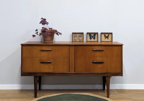 As sets of vintage, mid century dining chairs go, this quartet ticks all the boxes. Well-made in solid teak in a family-friendly, wipe-clean black vinyl, they are as handsome as they are robust and sturdy. Featuring two carvers, we love the exaggerated curves of their arms. We’ve been unable to attribute them but they came with a British manufacturer’s stamp so we can date them specifically to 1970. A great value set of retro chairs that will go with any style of midcentury dining table.