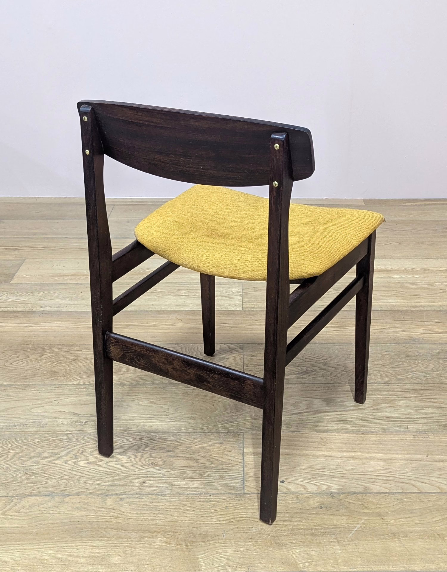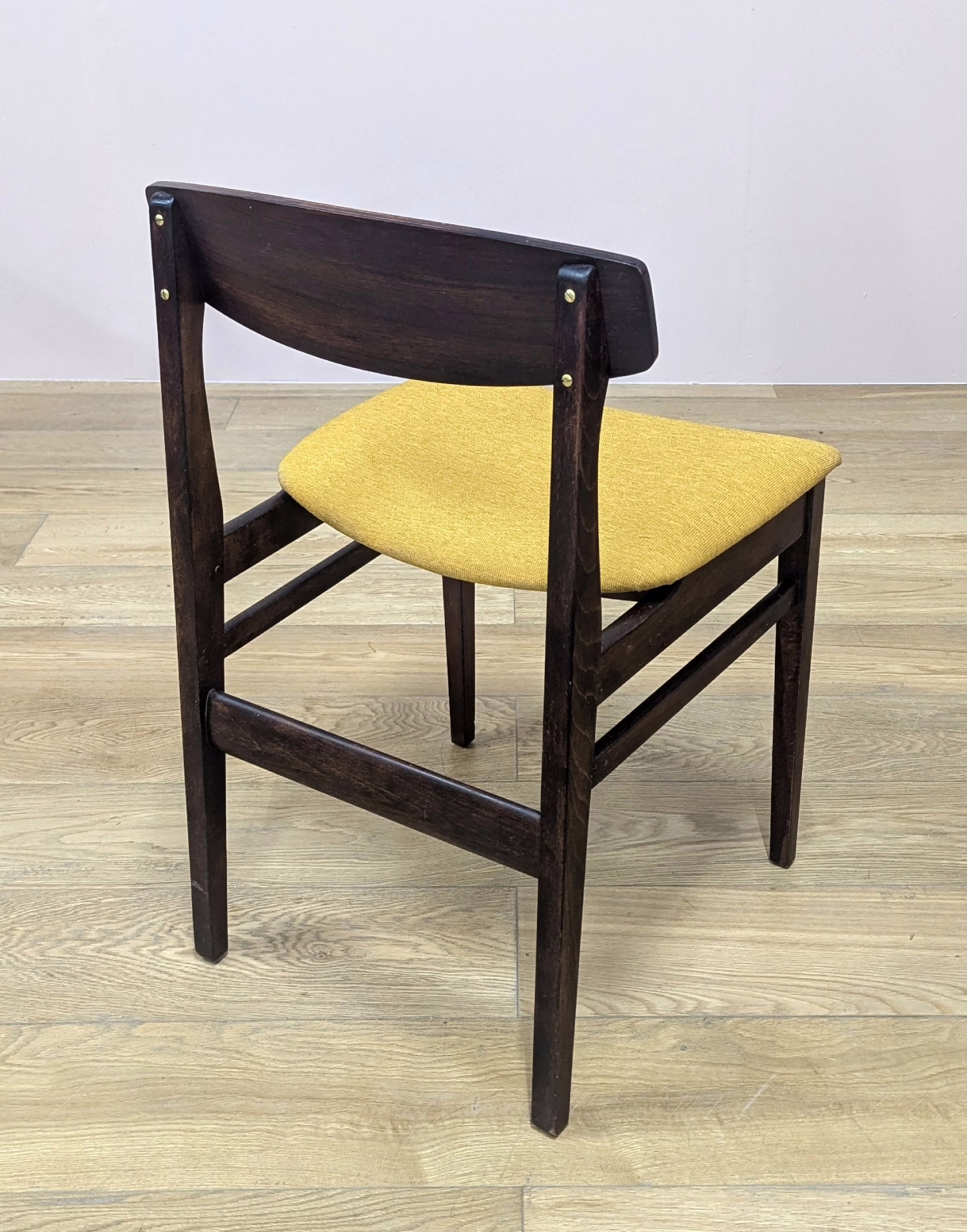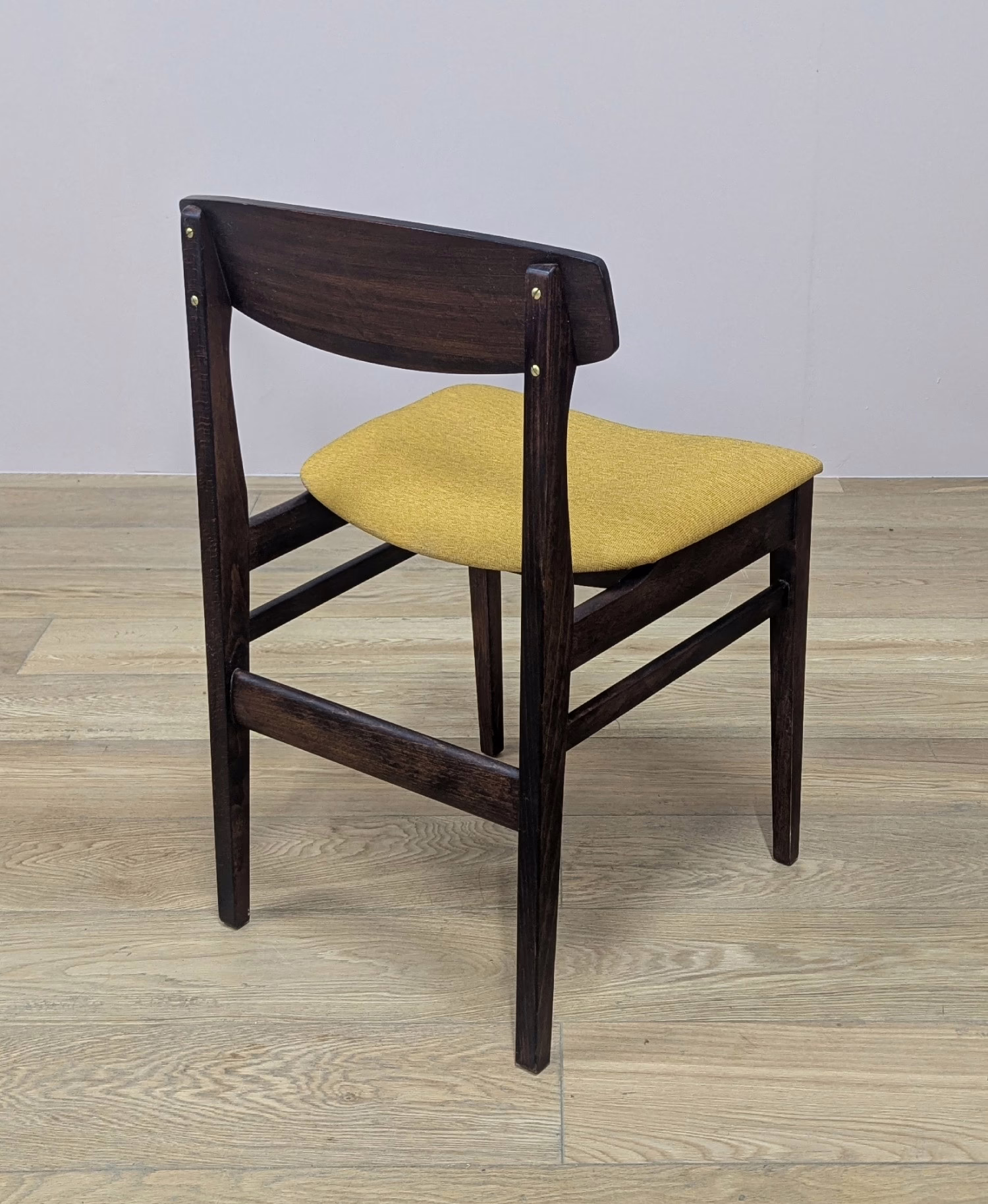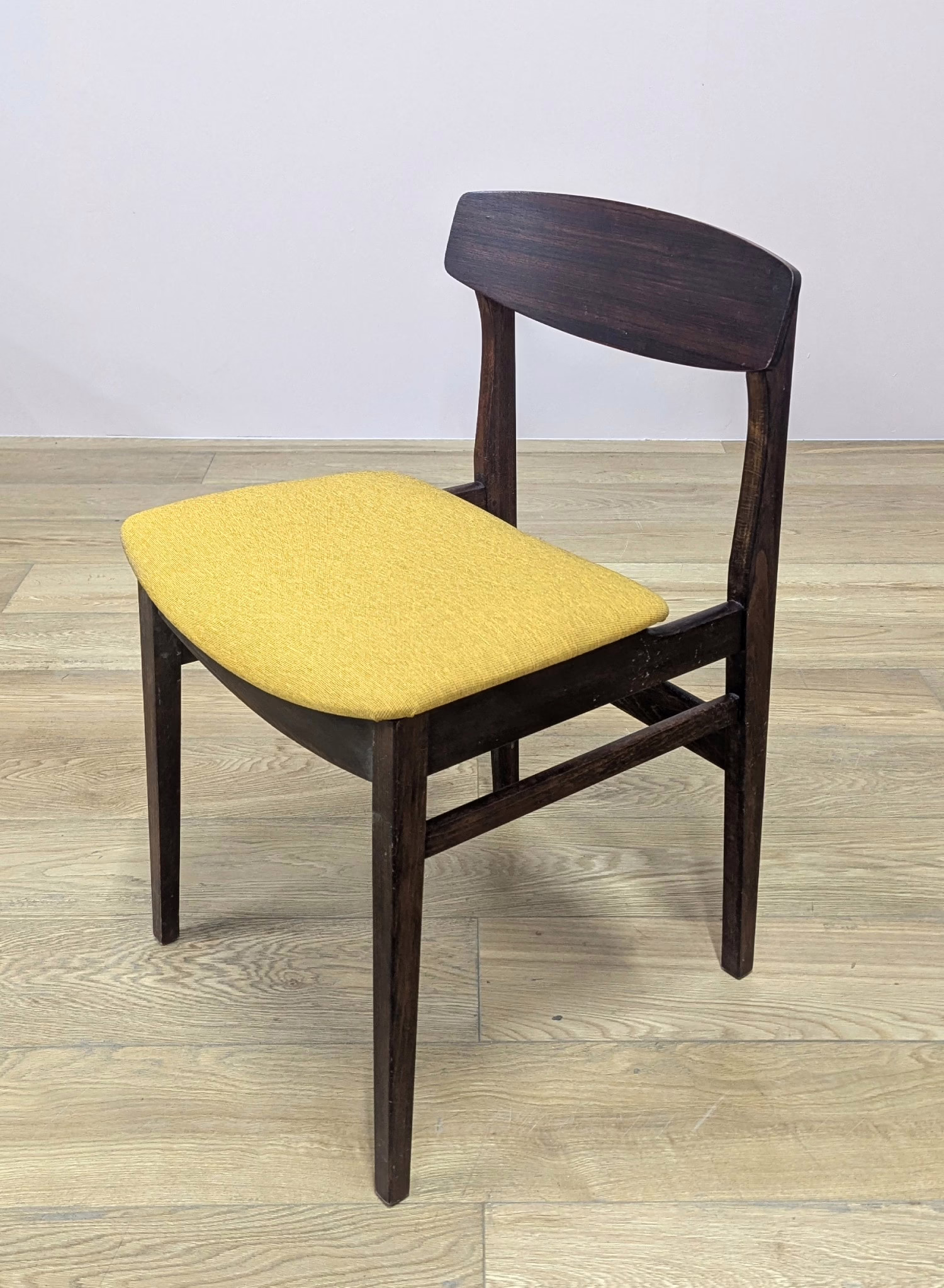 This set of four original, vintage dining chairs is ‘sold as seen’. They are in good, used condition. They have been checked, cleaned and natural beeswax polish applied to revive the shine but otherwise the finish is original. There are minor knocks, scuffs and dents as you might expect with furniture of this age. We made a small discreet repair to the back of one chair which we have shown. The seat pads have been fully reupholstered inside and out. The fabric is a quality, heavy duty upholstery cloth meant for much use. They are well-made with no wobbles or joint concerns. Do browse our photos for an accurate representation of their condition and colour. Any queries, just get in touch.