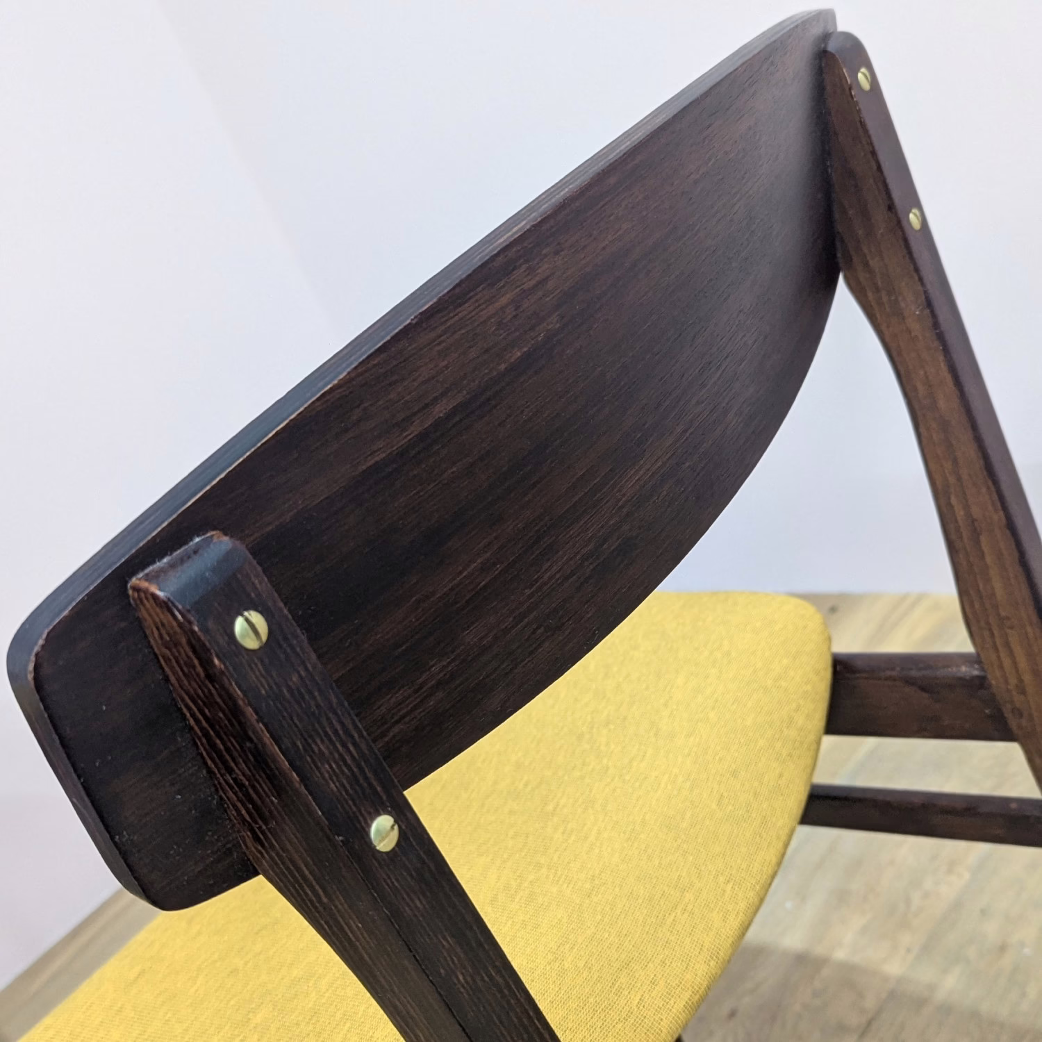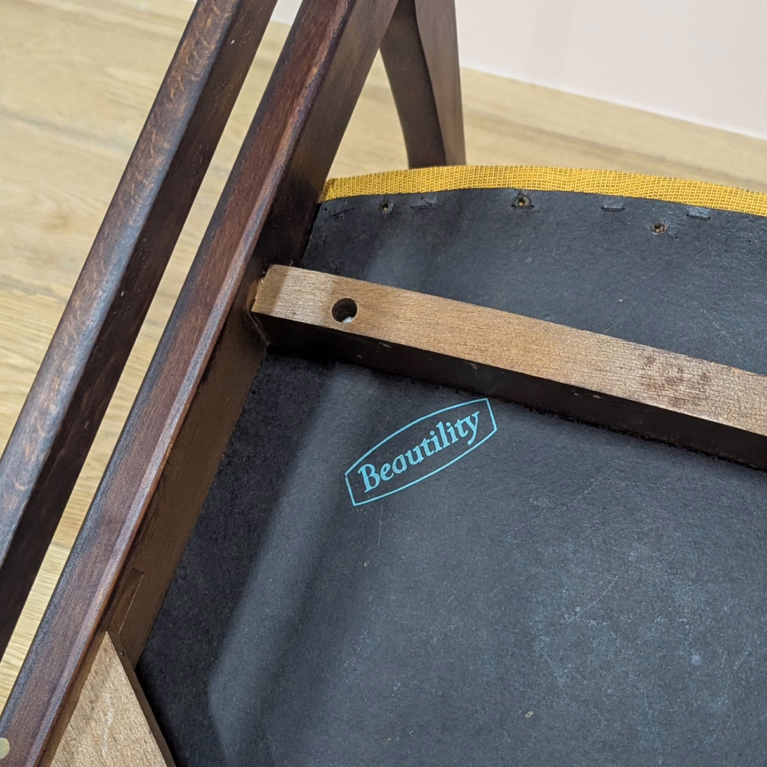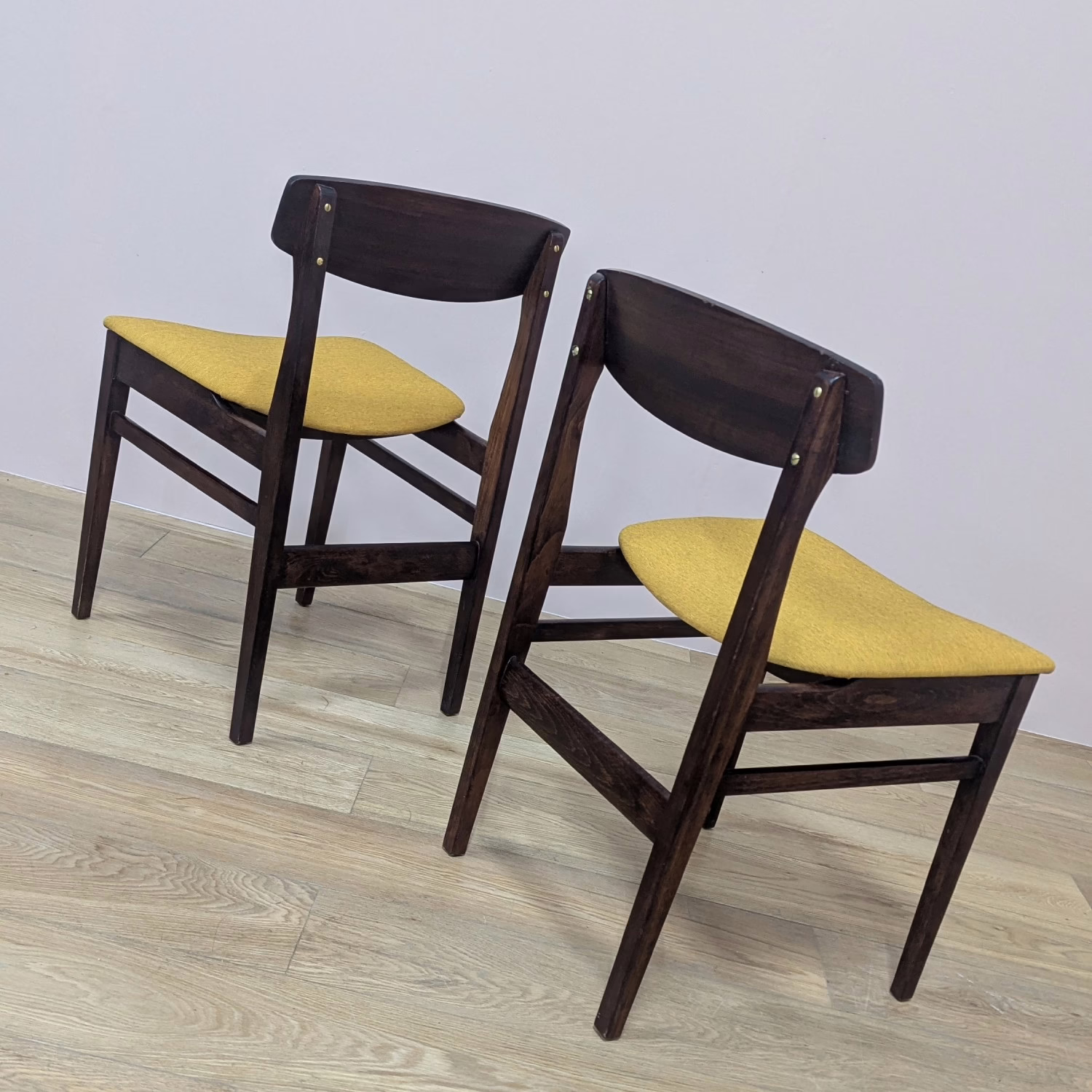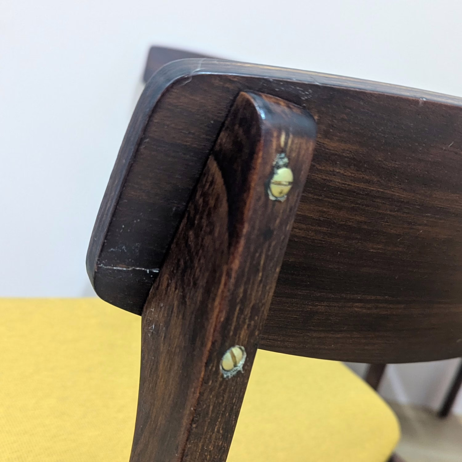 This set of four original, vintage dining chairs is ‘sold as seen’. They are in good, used condition. They have been checked, cleaned and natural beeswax polish applied to revive the shine but otherwise the finish is original. There are minor knocks, scuffs and dents as you might expect with furniture of this age. We made a small discreet repair to the back of one chair which we have shown. The seat pads have been fully reupholstered inside and out. The fabric is a quality, heavy duty upholstery cloth meant for much use. They are well-made with no wobbles or joint concerns. Do browse our photos for an accurate representation of their condition and colour. Any queries, just get in touch.