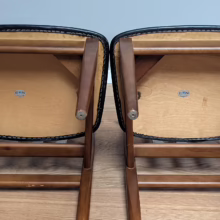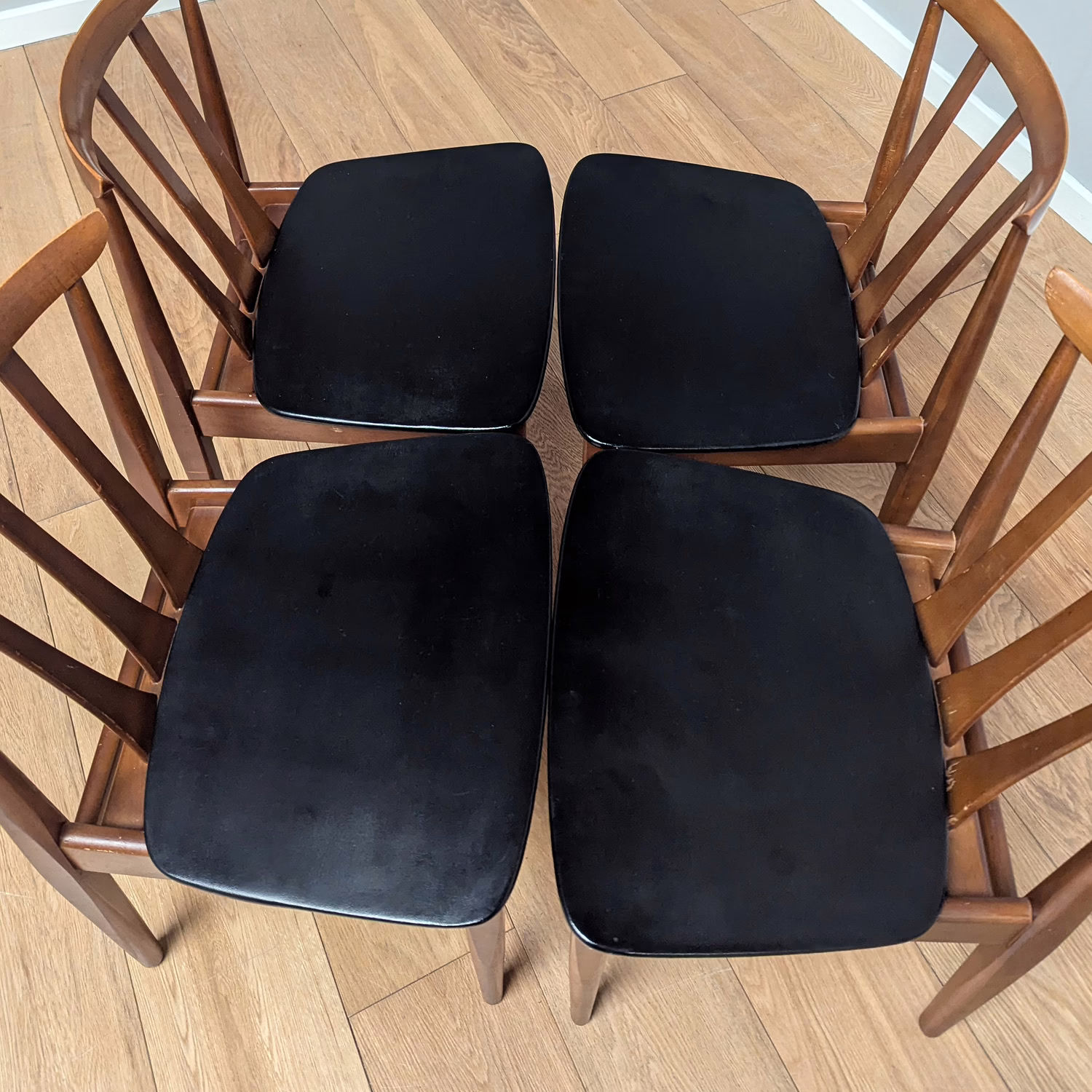 This set of four original, vintage chairs is ‘sold as seen’. They are in good, used condition. The frames have been checked, cleaned and a neutral beeswax polish applied to their wood but otherwise the finish is original. And the finish does carry minor, superficial chips, scuffs and marks here and there which can be seen across our photos. This wear and tear is light and in line with their considerable age. Do browse our photos for an accurate sense of this. The seats have their original flat, vinyl covering so a hard seat rather than an upholstered one, although you could opt to recover then with foam for a softer sit. The chairs are solid and sturdy with no wobbles. The EON maker’s label can be seen on the underside of the chairs.