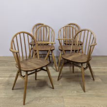 Here is a fully restored set of highly coveted Ercol 370 dining chairs with two 370A carver chairs. One of the most popular and enduring chair designs in the Ercol Windsor range, the 370 and 370A were made between 1957 and 1982. These particular chairs date from the 1960s. Made from solid British elm and beech ‘blond’ woods with six back spindles and a generous seat height and width, providing great comfort. We love the upturned, welcoming arms of the carver chairs. This is classic, vintage Ercol at its best. They built furniture to last and the fact these chairs are 50+ years old and still solid and stable proves that. They have much to offer and would be as at home in a midcentury inspired interior as they would around a homely country cottage kitchen table. The restoration process for an Ercol dining chair is a labour of love as in our view they require hand-sanding to get the best finish without being too hard and invasive. This takes a great deal of time but the results are worth it.
