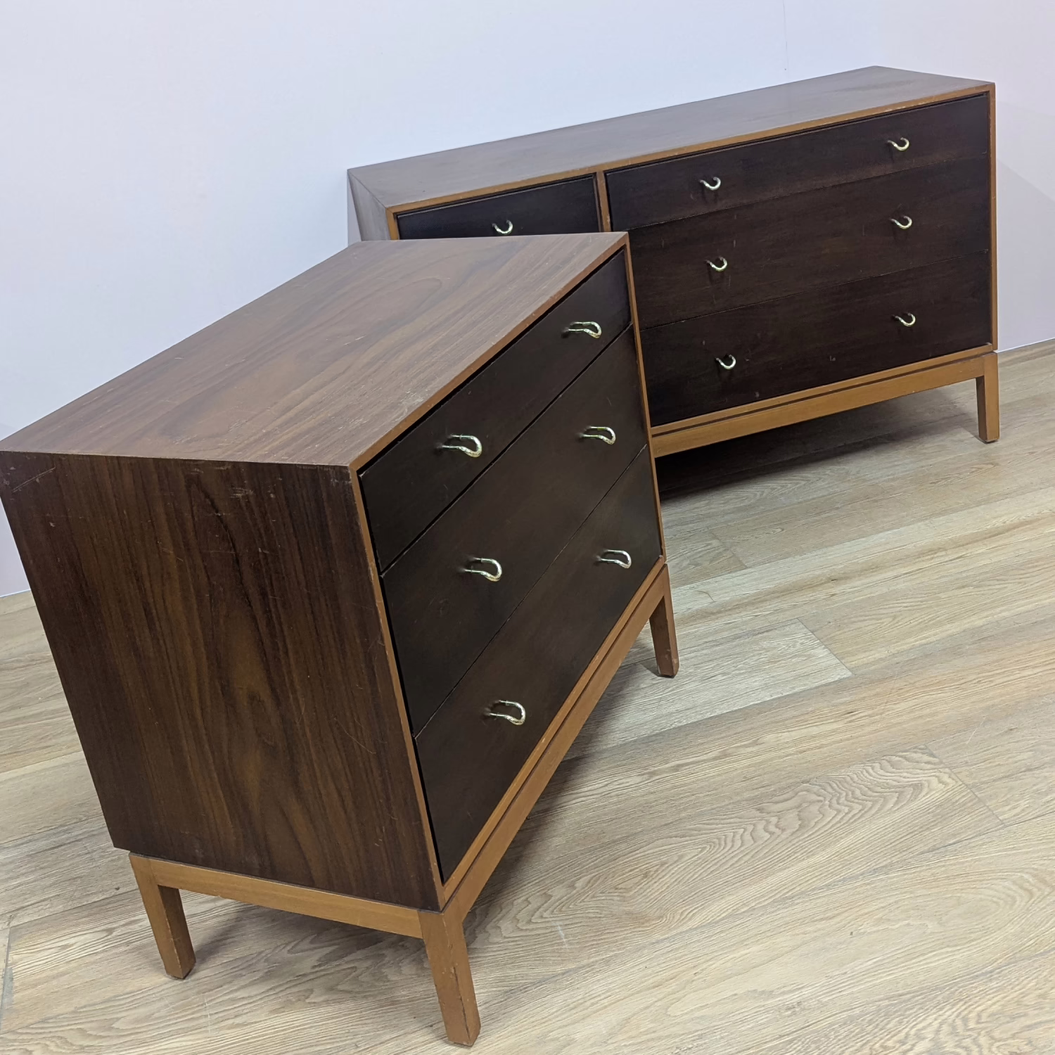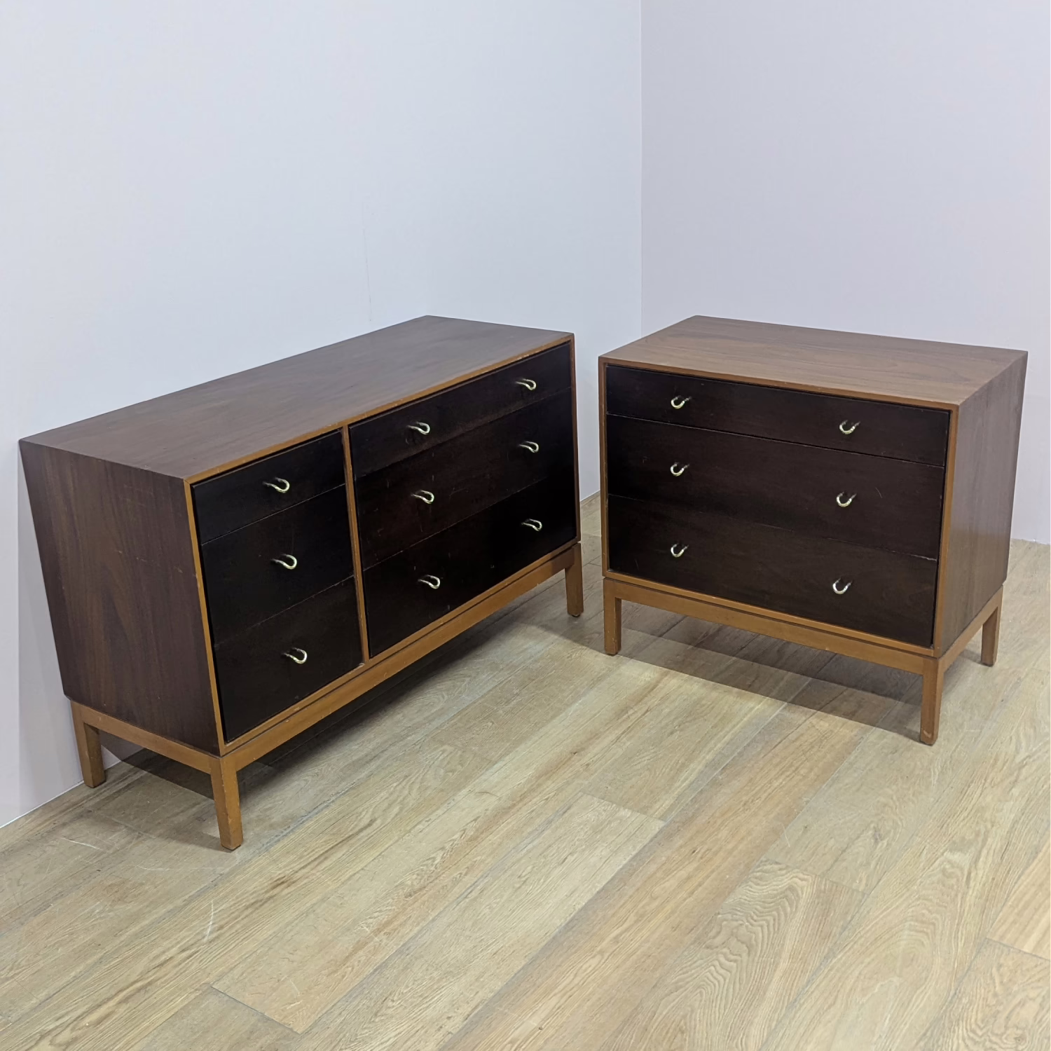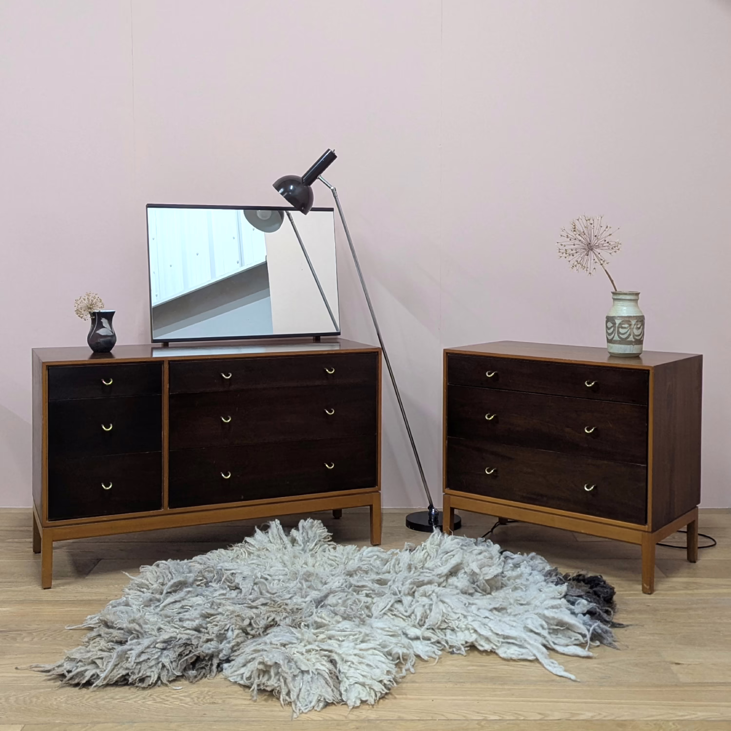 Something special from MCM design power couple, John and Sylvia Reid for Stag furniture – a matching pair of bedroom drawer chests, one large and one midi. This particular range is something of a rarity, we believe a short production run in the mid-1950s. Both the chest of drawers and larger dressing table are expertly designed and superbly crafted in dark walnut with a contrasting blond wood on the base and legs, creating a striking two-tone effect overall. They come in their original finish so there are signs of age across the external surfaces – superficial knocks and scuffs here and there but nothing that greatly distracts from their aesthetic appeal and nothing that affects their usefulness. This is reflected in our price. They give a great deal of bedroom storage across their nine drawers drawers. If you didn’t wish to use the mirror it can be easily removed. If you’re looking for a coordinated midcentury look in your bedroom, this is your starting point.