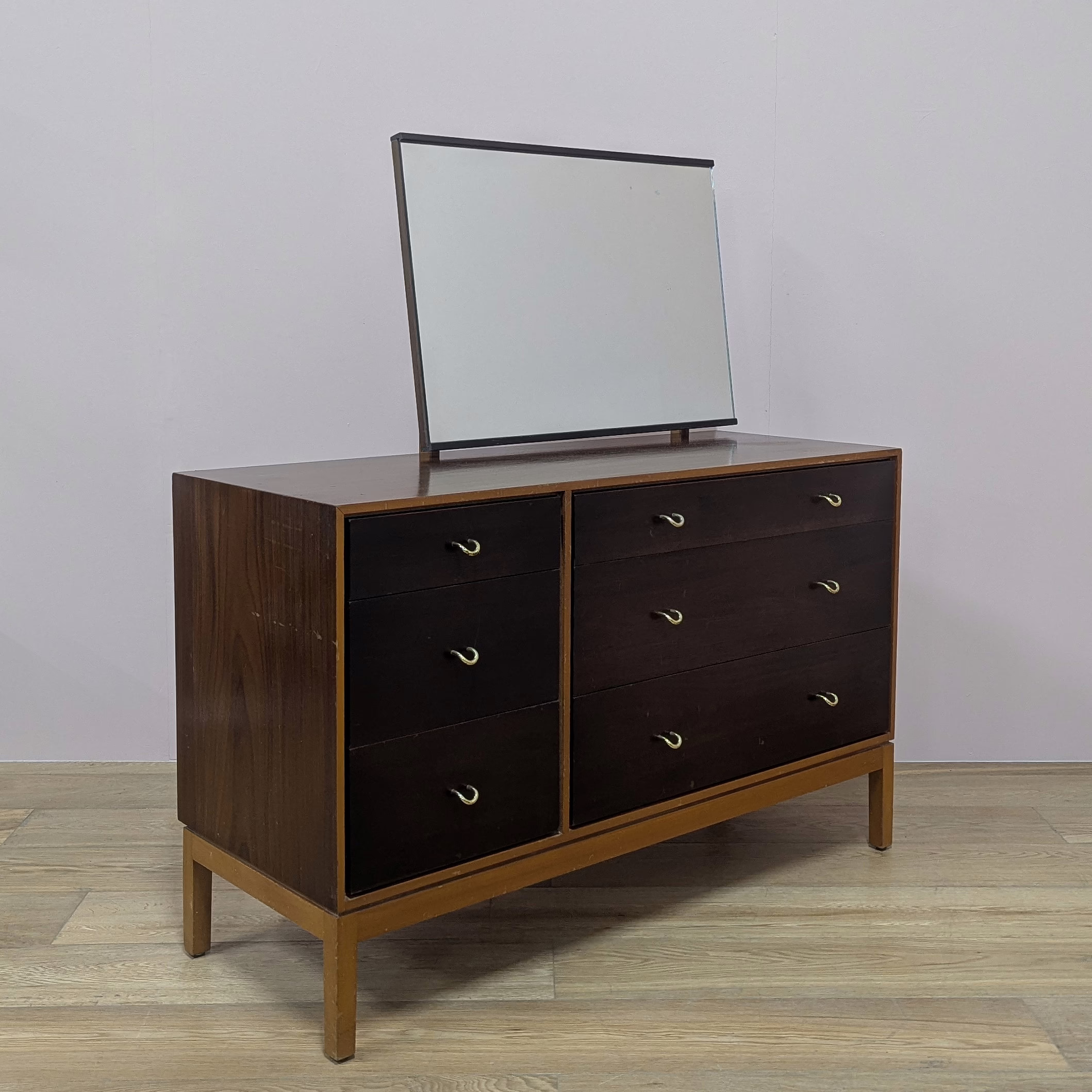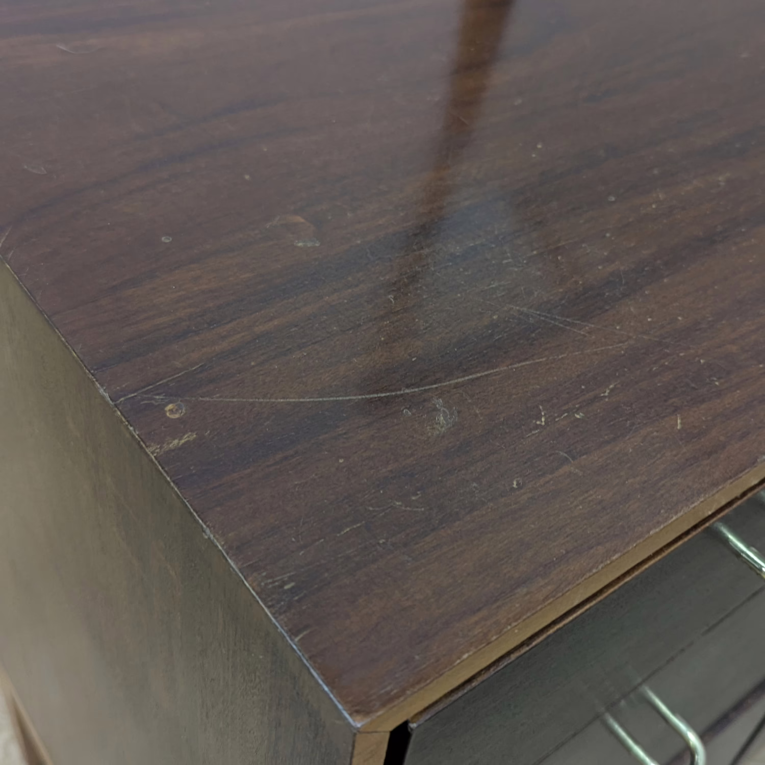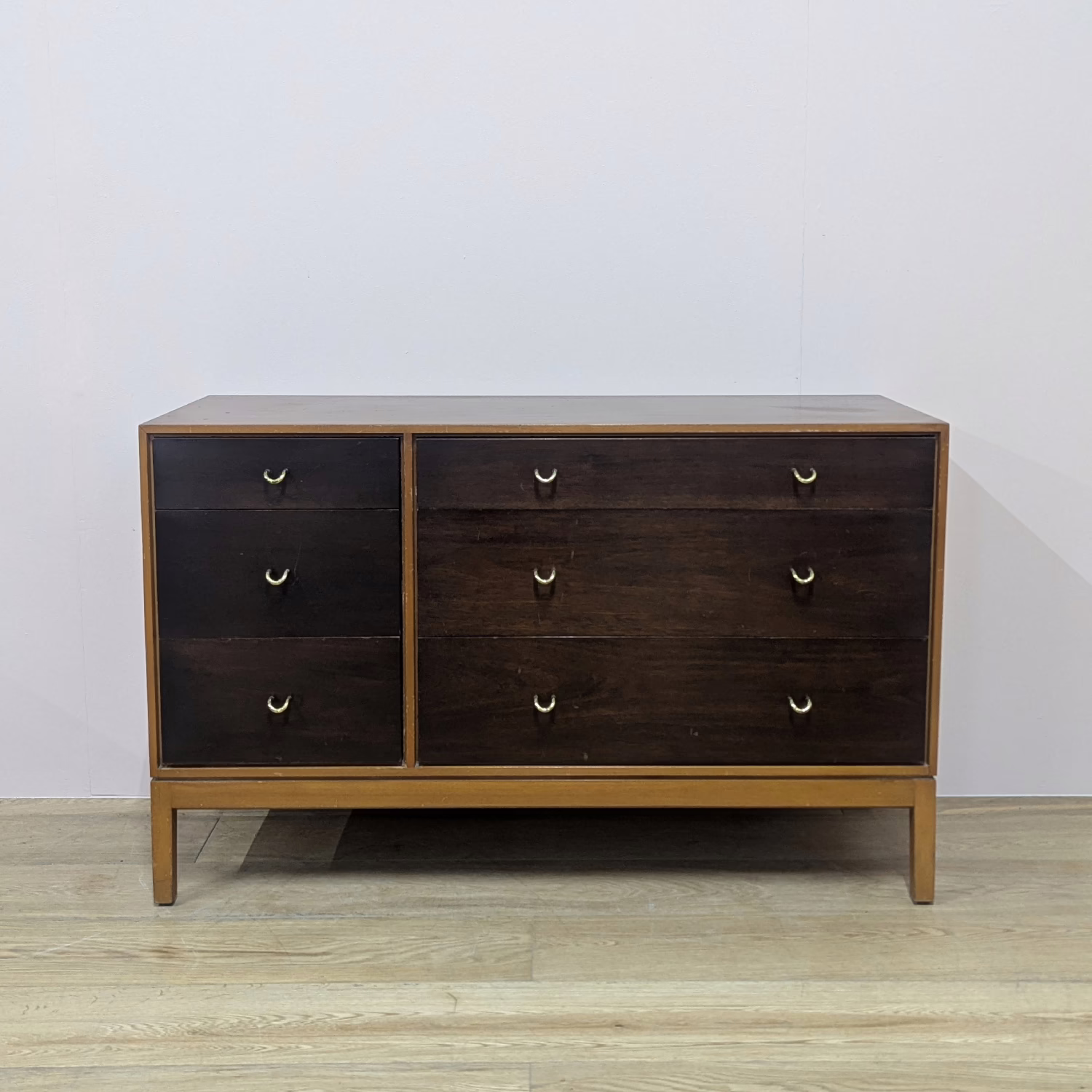 Something special from MCM design power couple, John and Sylvia Reid for Stag furniture – a matching pair of bedroom drawer chests, one large and one midi. This particular range is something of a rarity, we believe a short production run in the mid-1950s. Both the chest of drawers and larger dressing table are expertly designed and superbly crafted in dark walnut with a contrasting blond wood on the base and legs, creating a striking two-tone effect overall. They come in their original finish so there are signs of age across the external surfaces – superficial knocks and scuffs here and there but nothing that greatly distracts from their aesthetic appeal and nothing that affects their usefulness. This is reflected in our price. They give a great deal of bedroom storage across their nine drawers drawers. If you didn’t wish to use the mirror it can be easily removed. If you’re looking for a coordinated midcentury look in your bedroom, this is your starting point.