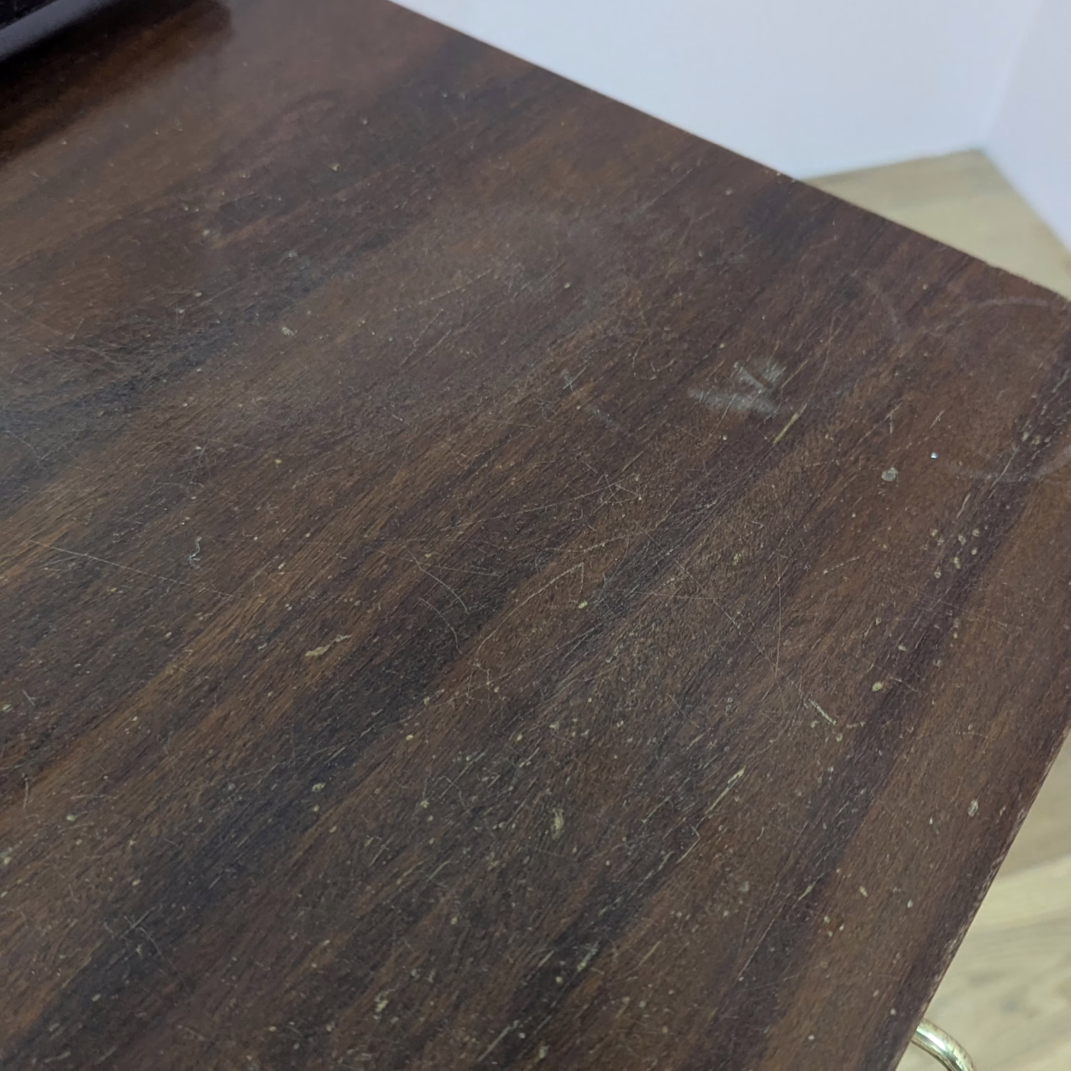 This is an original, vintage set that is ‘sold as seen’. We have serviced and cleaned both pieces inside and out, applying a natural polish to revive the shine but otherwise the finish is original. All the drawers are beautifully made with dovetail joints and solid wood fronts. They open and close with ease and all the original brass handles are securely attached. The mirror hangs on two uprights which screw in at the back and can be cleverly angled. The uprights can be easily unscrewed if you wished to simply use as a large chest of drawers, rather than a dressing table. There are surface scuffs, scratches and blemishes to the original exterior finish across both pieces which are clearly shown across our photos but given their age, we would expect wear and tear of this nature. Despite this, the pieces are stable, sturdy and with a great deal of life and appeal left in tact. They are very well made as you would expect from Stag and the superficial wear and tear is reflected in our price. The original Stag maker’s label can be found in the drawers. Please browse our photos for an accurate account of this item. Any queries, do get in touch.