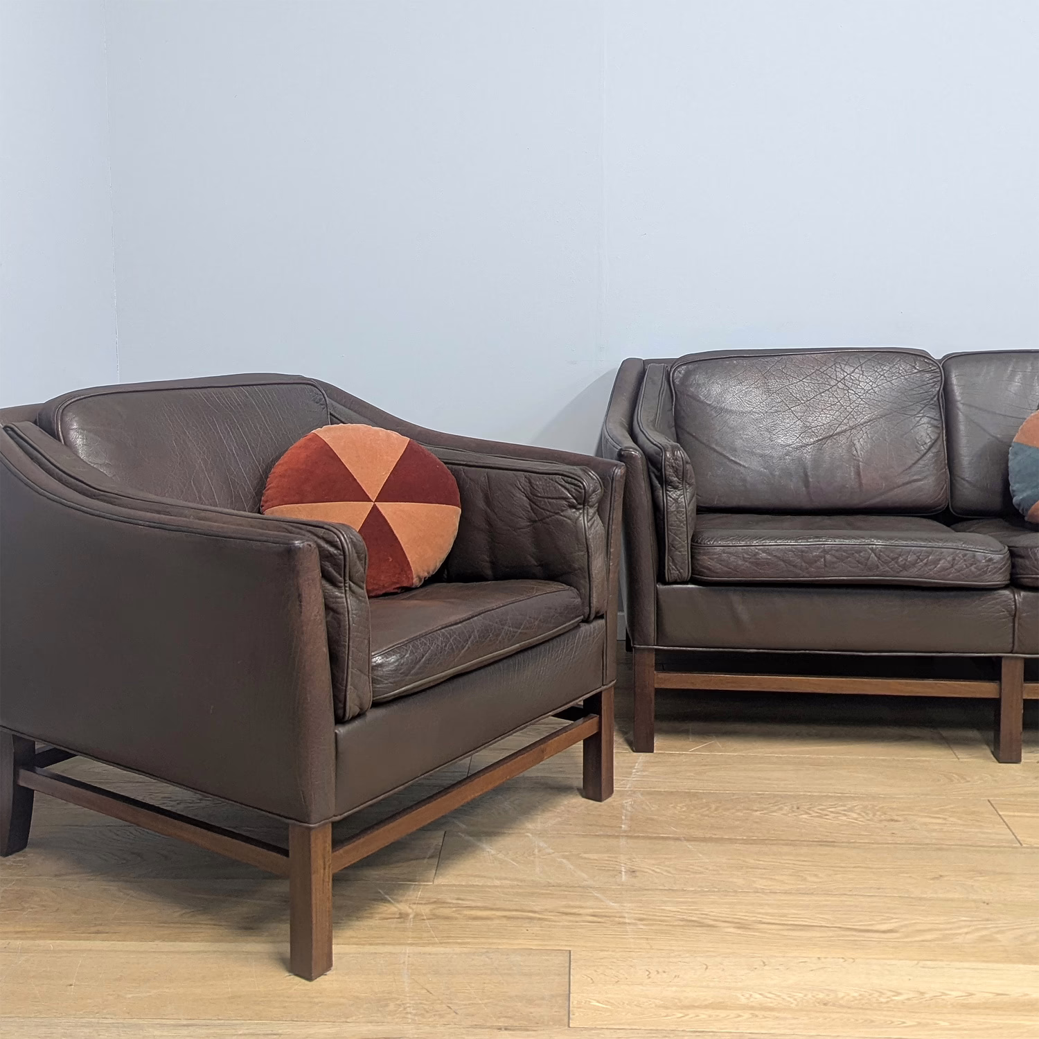 This original, vintage lounge set is ‘sold as seen’. Both the sofa and chair are in good, used condition. The lower wooden rosewood frames has been cleaned and a natural beeswax polish applied to revive shine but otherwise the finish is original. Likewise, the brown leather upholstery is original too. Nine of the cushions (there are four on the chair, six on the sofa) have working zips, plump inner cushions and backing cloth in good – very good order. The seat cushion of the chair has a broken zip and the seam has been sewn shut as we’ve shown in our photos. Obviously as it’s on the underside it doesn’t show and there is the option to replace the missing zip with a professional upholsterer. The cushion leather is wrinkled and lightly scrunched with use, as we’ve shown, but very much as we would expect with vintage sofa of this age. The fixed leather upholstery on the frames is in good order. Again, there are wrinkles, sunlight faded patches and scuffs here and there across the fixed leather which can be seen in our various photos. This is primarily on the pieces’ corners / edges / tops and there is a blemish on one end of the sofa which we’ve flagged in our photos. Overall marks, scuffs and wrinkles are very much part of its vintage, lived-in appeal in our view but do browse our photos. The finishing fabric underneath the cushions is in good condition too with some light tide marks underneath the end cushions as shown. The lower wooden frames carry some very light knocks and surface scuffs. They were imported directly from Denmark and it dates from the early 1970s. Although there is no maker’s label, they are a well-documented design. Do browse our numerous photos for an accurate sense of colour and order. If you would like to view the set or have any questions at all, please do get in touch.
