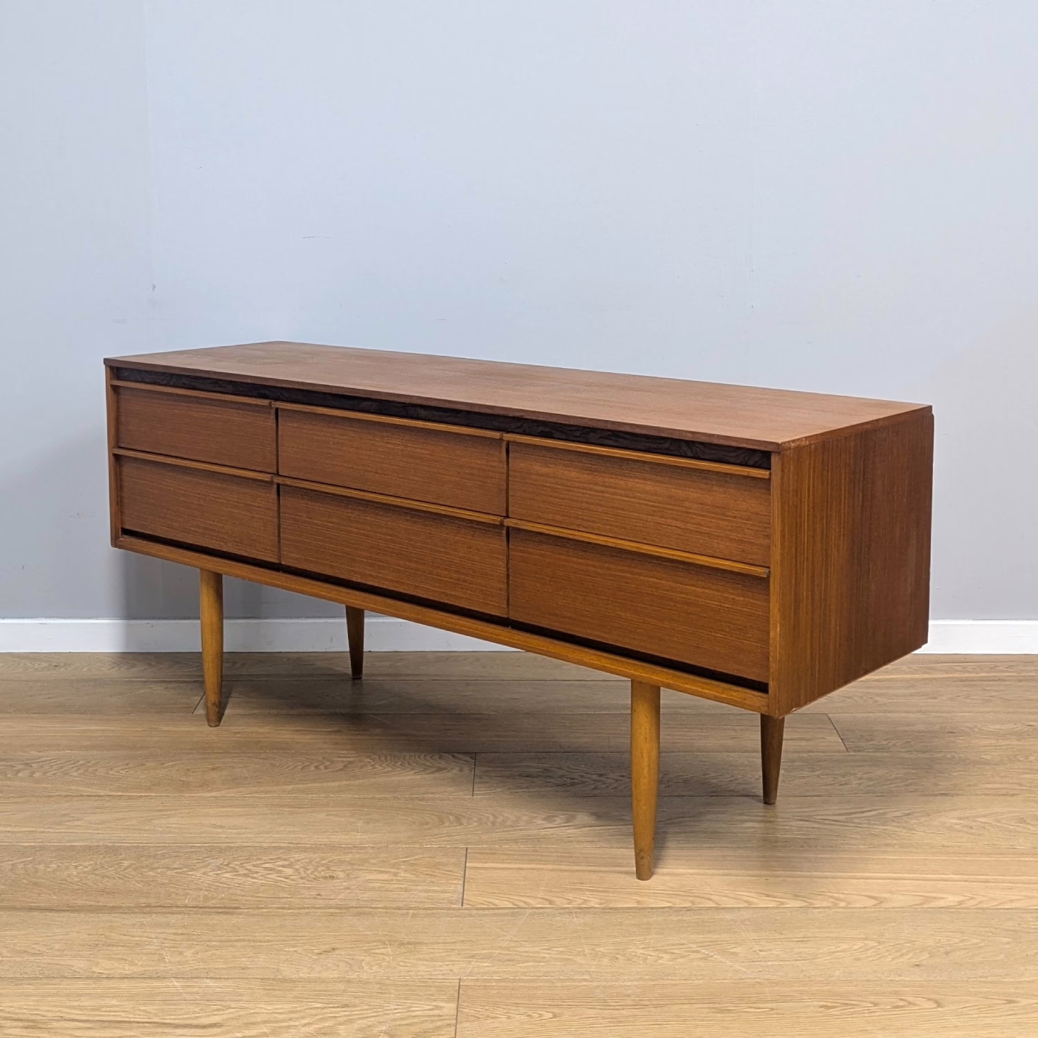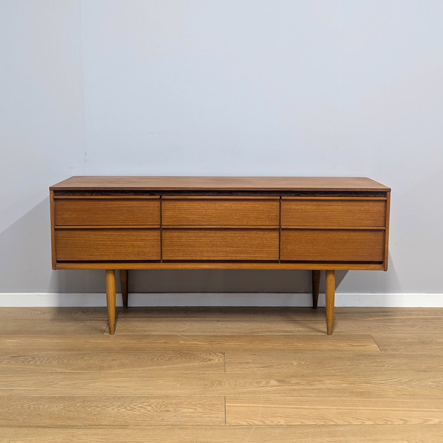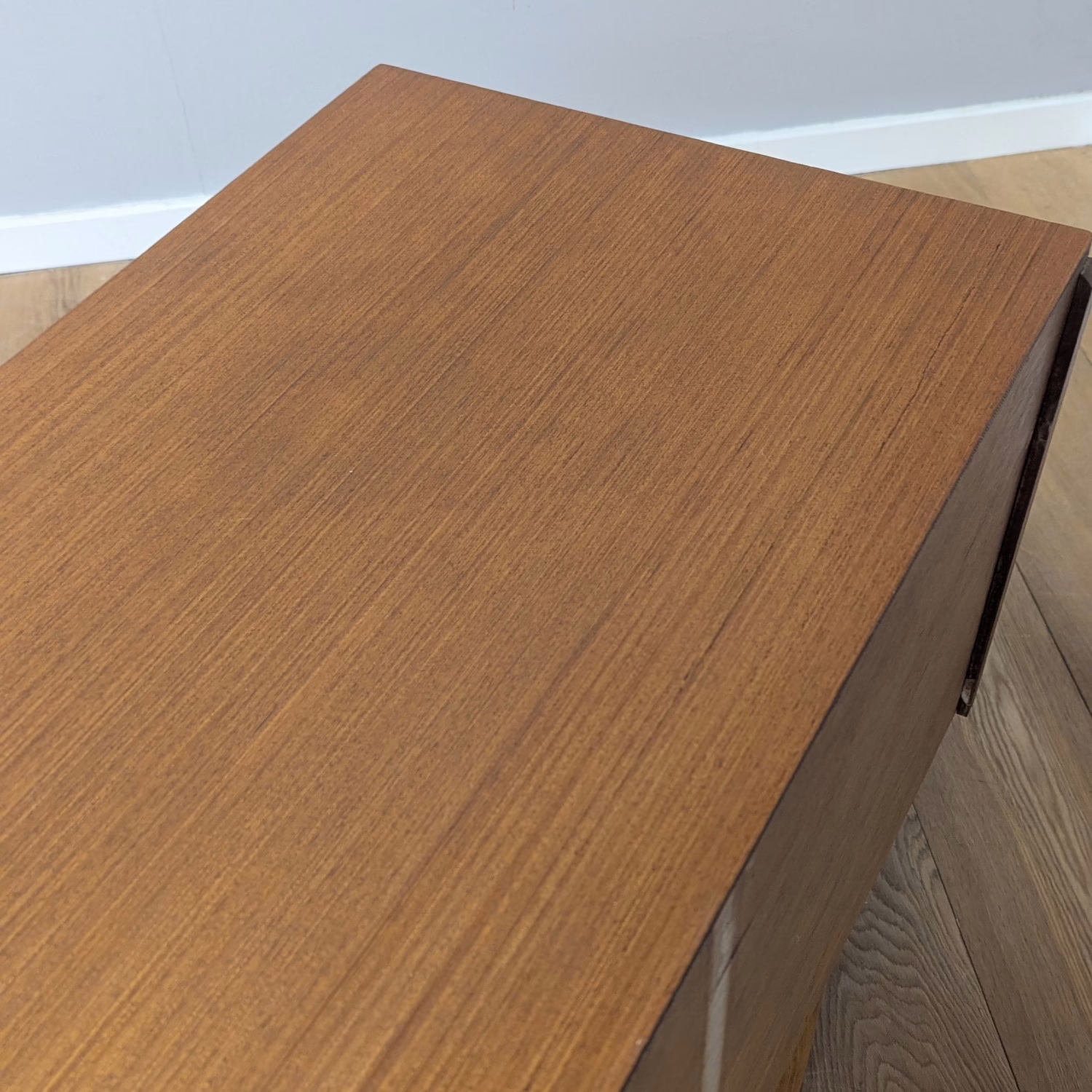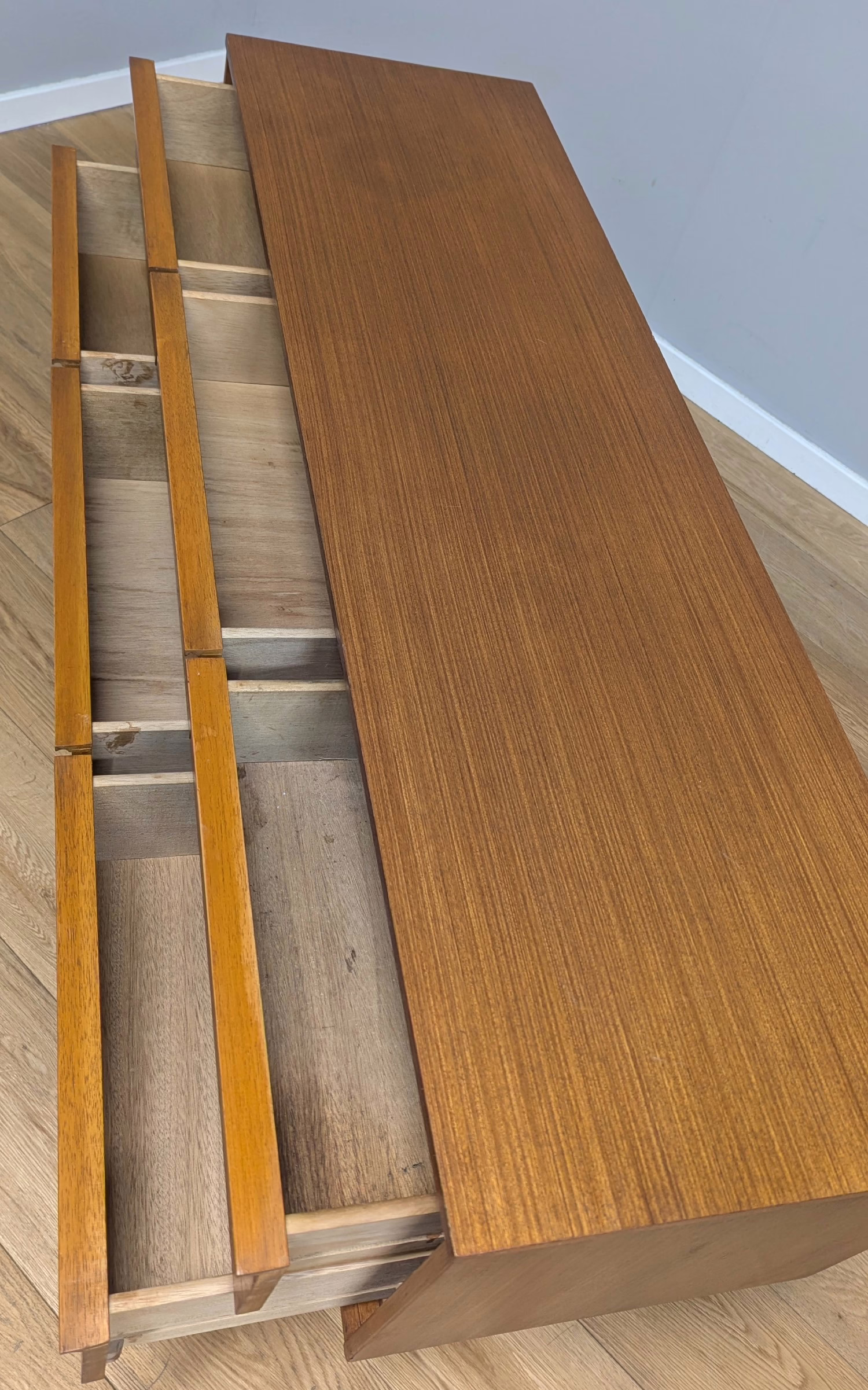 This is an original, vintage sideboard that is ‘sold as seen’. Overall, it is in good – very good, used condition. We have checked and cleaned the sideboard inside and out, and applied a natural beeswax polish to the exterior wood but otherwise the finish is original. All six drawers are well made with dovetail joints, have clean, tidy interiors and slide with ease. There are some minor scratches, faint darker patches and scuffs to the exterior wood as you would expect with a vintage piece of this age. This is primarily on the top surface. It’s not especially noticeable but please do refer to our photos. It’s a really well-made, practical piece of storage furniture that’s solidly constructed with no signs of repair. Sadly the maker’s label is no longer in place but we attribute with confidence as we have sold the same model several times over the years. If you have any queries or would like to view, please do get in touch.