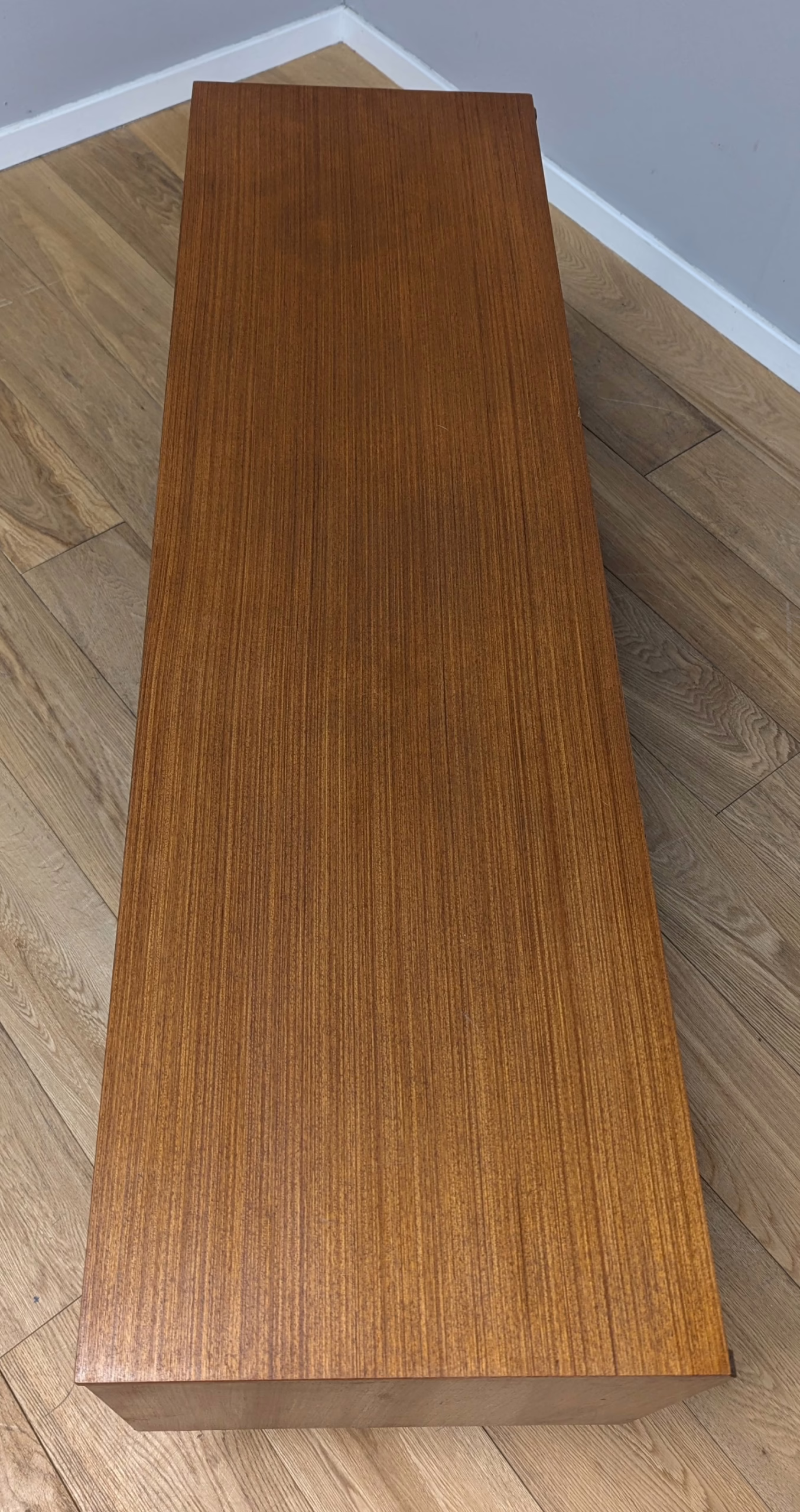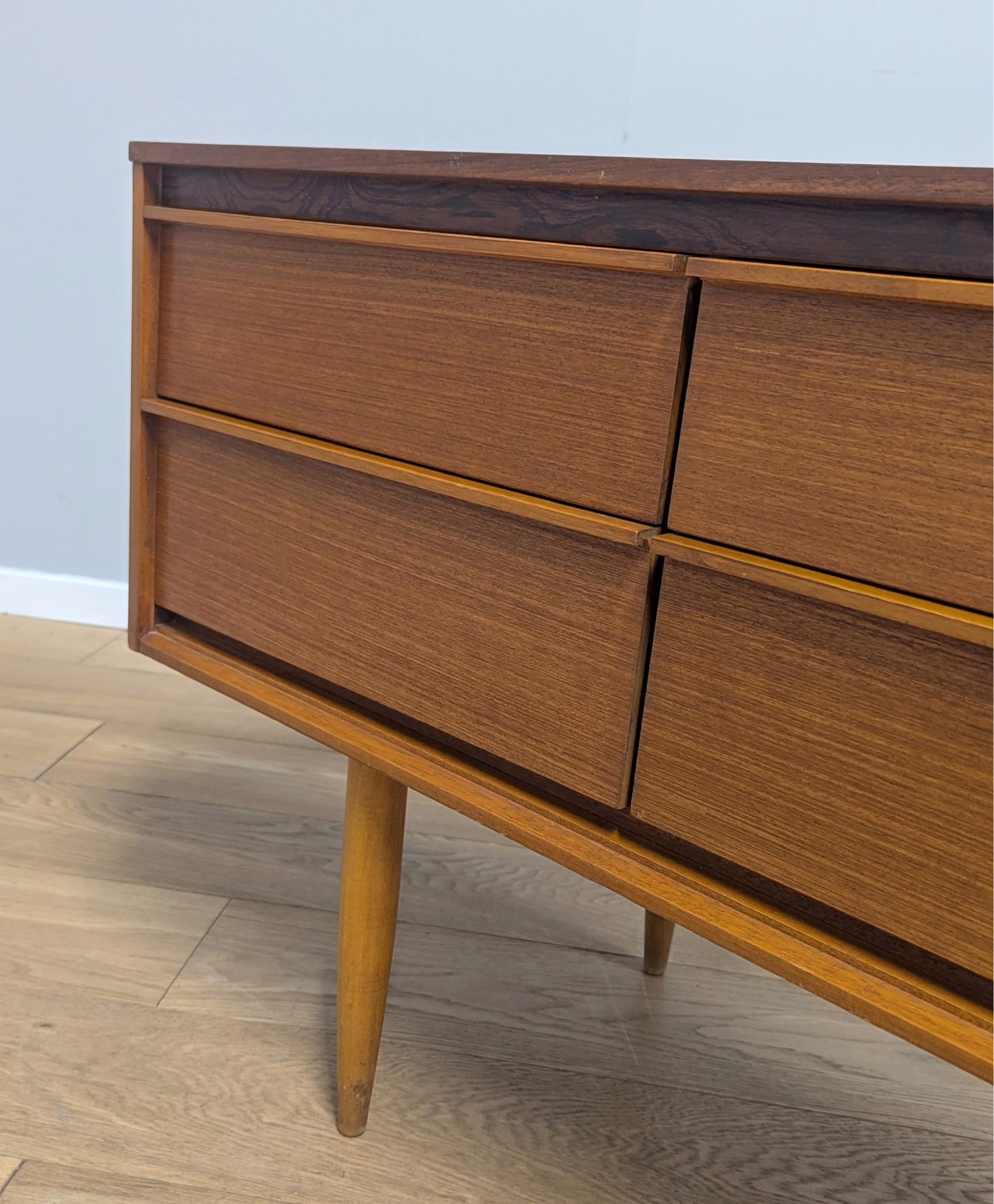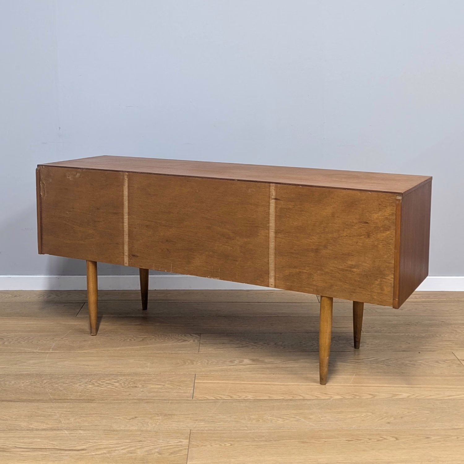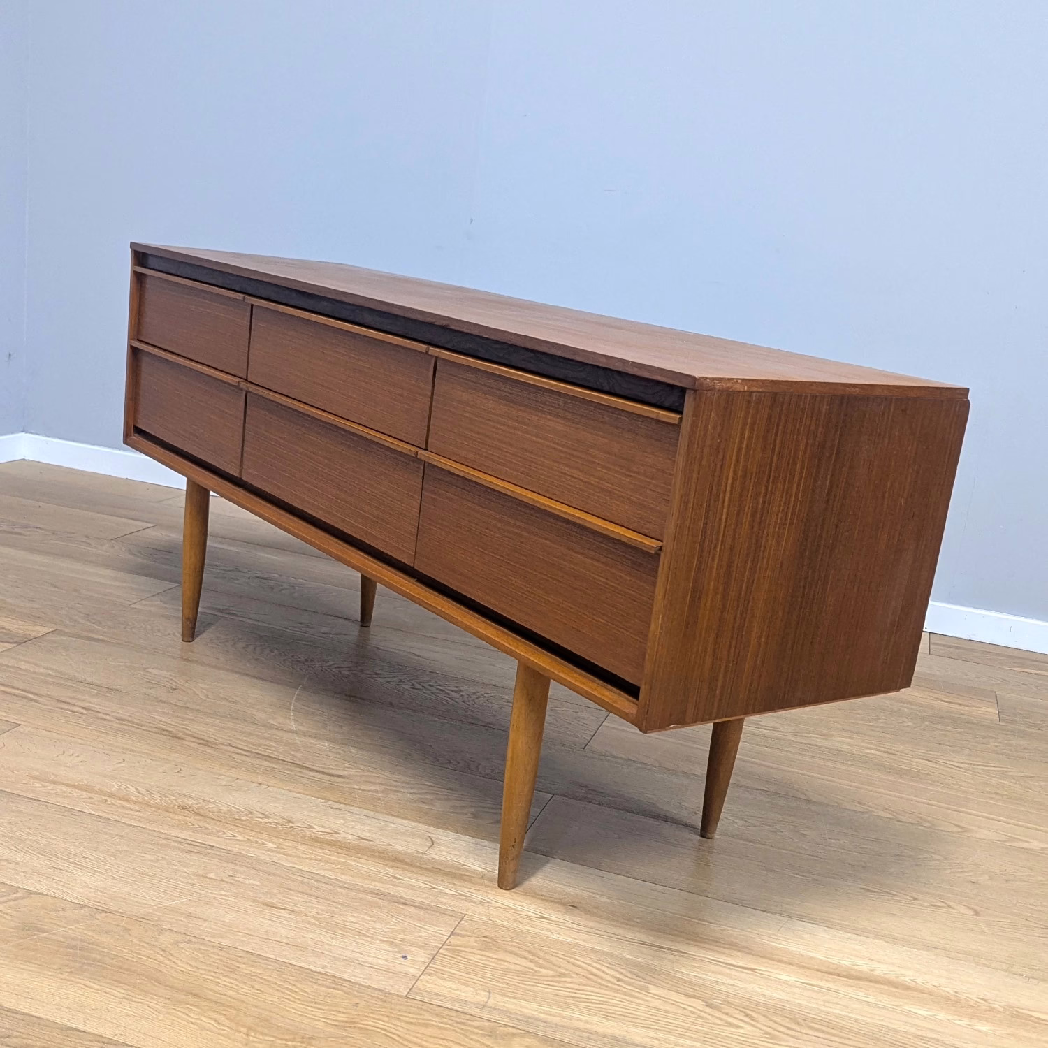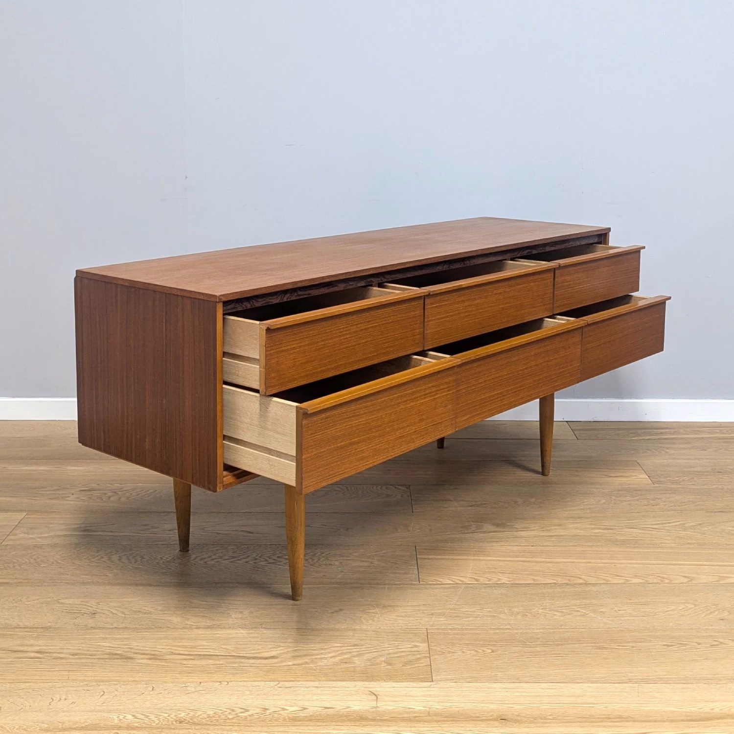 This is an original, vintage sideboard that is ‘sold as seen’. Overall, it is in good – very good, used condition. We have checked and cleaned the sideboard inside and out, and applied a natural beeswax polish to the exterior wood but otherwise the finish is original. All six drawers are well made with dovetail joints, have clean, tidy interiors and slide with ease. There are some minor scratches, faint darker patches and scuffs to the exterior wood as you would expect with a vintage piece of this age. This is primarily on the top surface. It’s not especially noticeable but please do refer to our photos. It’s a really well-made, practical piece of storage furniture that’s solidly constructed with no signs of repair. Sadly the maker’s label is no longer in place but we attribute with confidence as we have sold the same model several times over the years. If you have any queries or would like to view, please do get in touch.