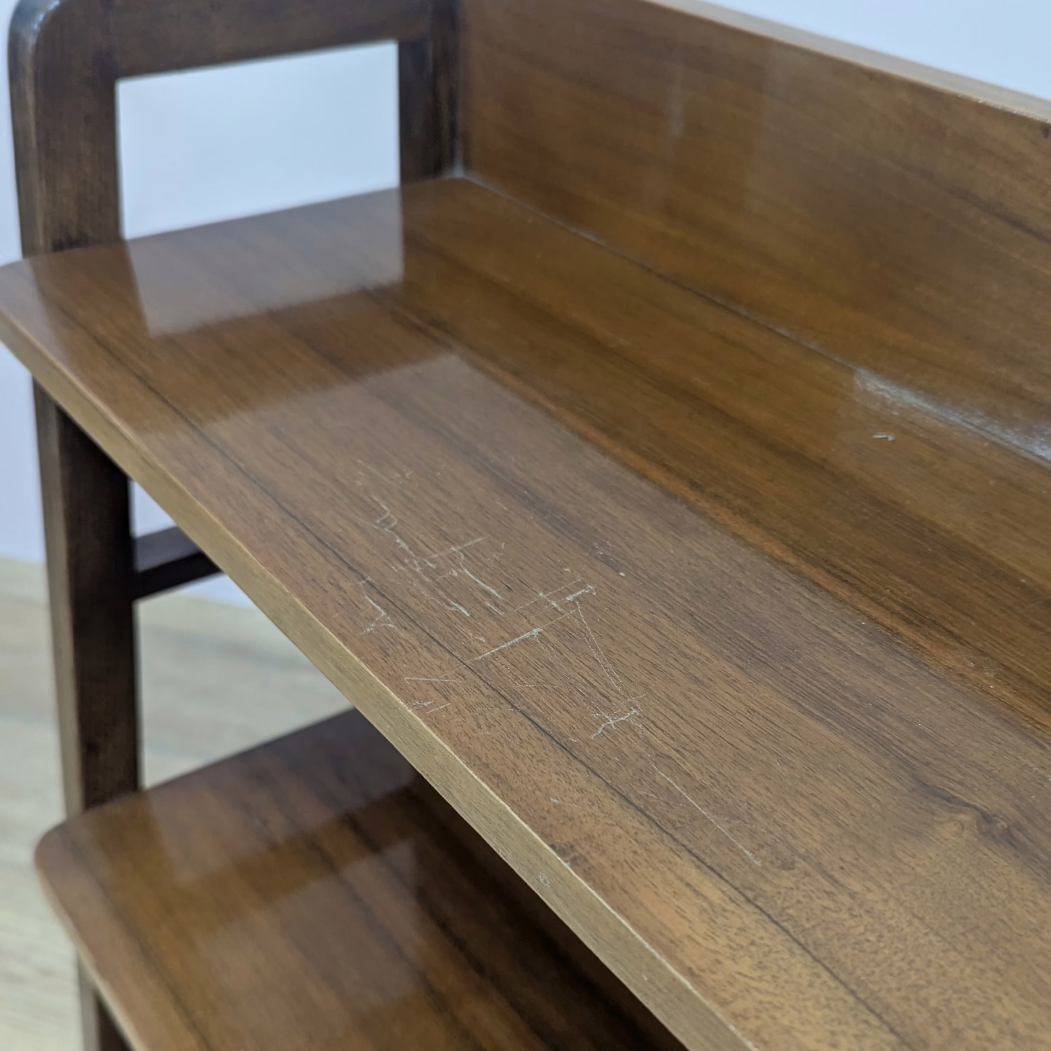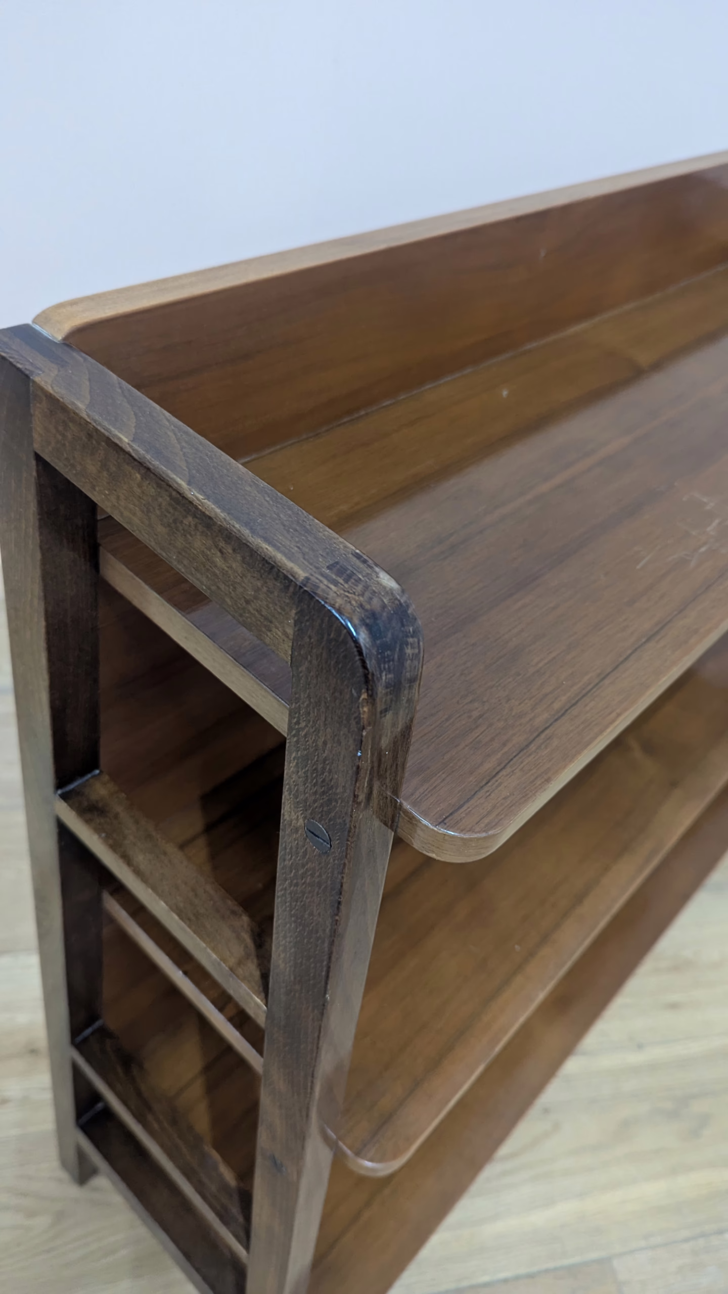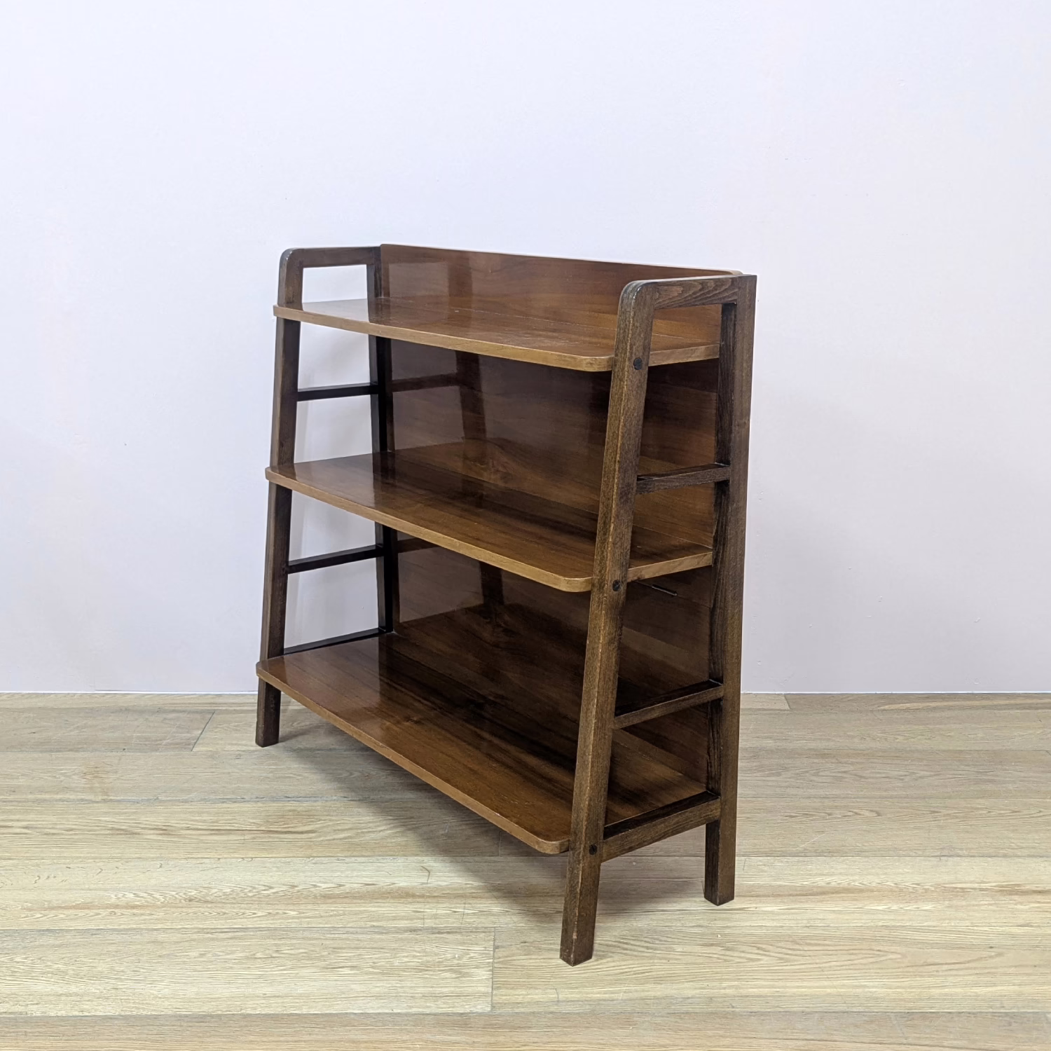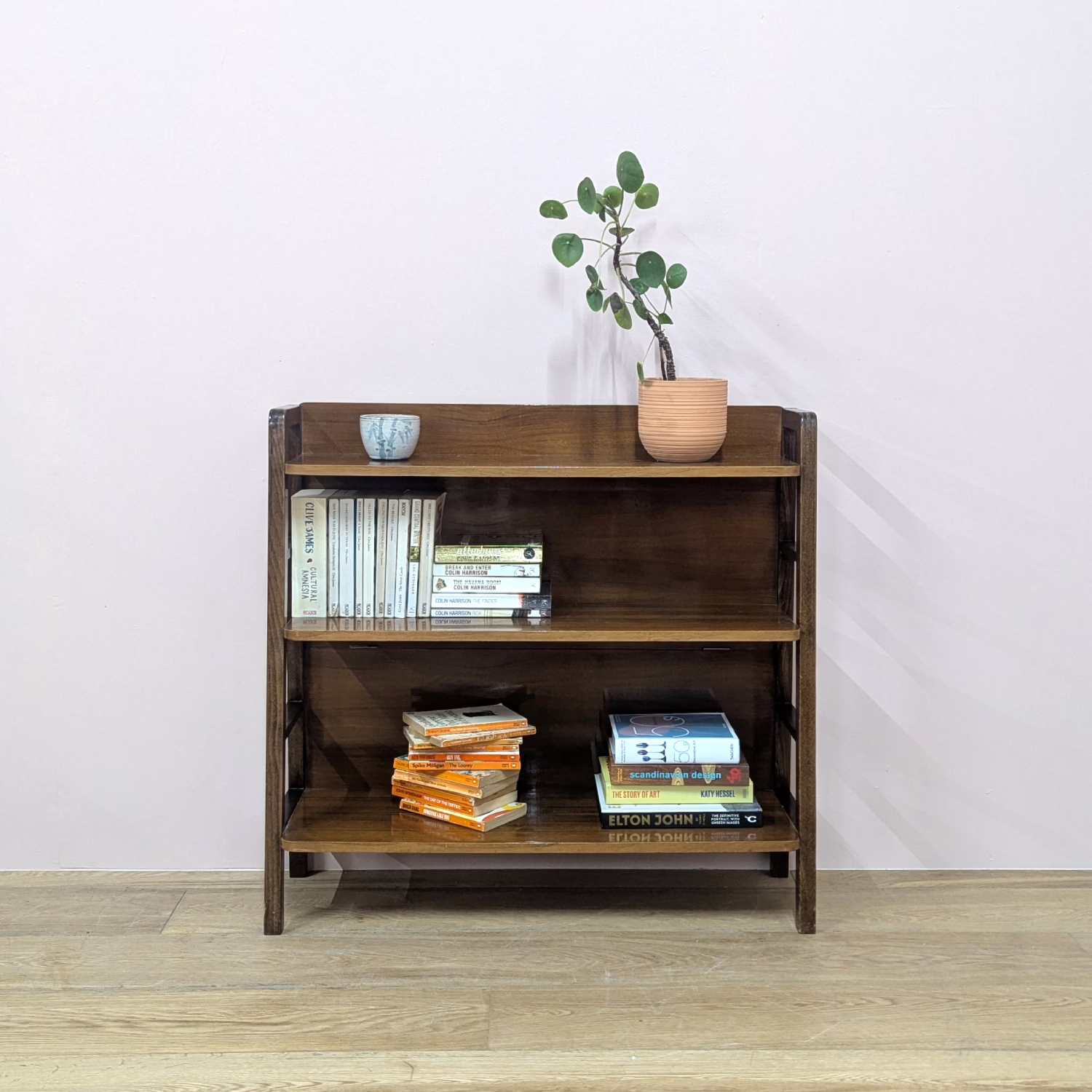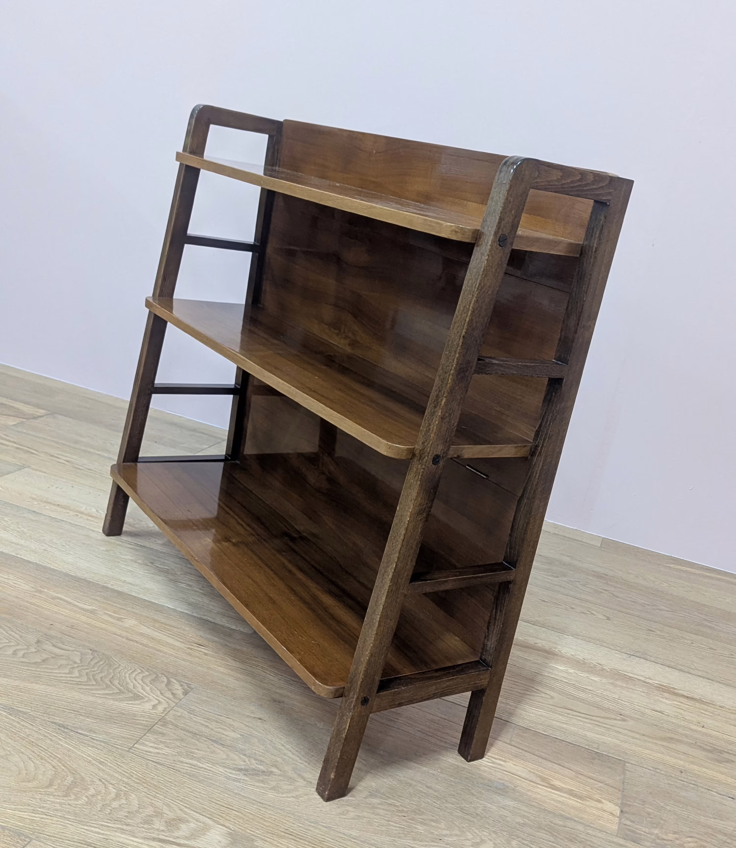 This is an original, vintage bookcase that is ‘sold as seen’. It is in good – very good, used condition. It has been checked and cleaned, and polished with a natural beeswax to restore its glossy shine but the finish is original. There are a couple of knocks here and there, including one on the lower leg with we’ve shown. There are also some superficial scratches on the top shelf, also shown. Neither of these things are greatly noticeable in the overall context of the piece. It’s stable and solid, a very nicely constructed item with no repairs or areas of concern. There is no maker’s mark sadly. Please browse our photos for an accurate account of this bookcase. Any queries, do get in touch.