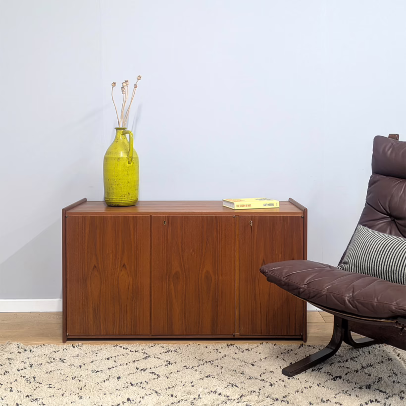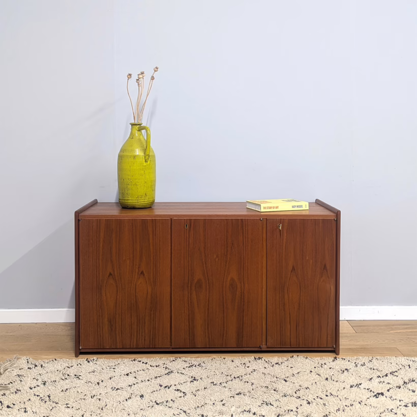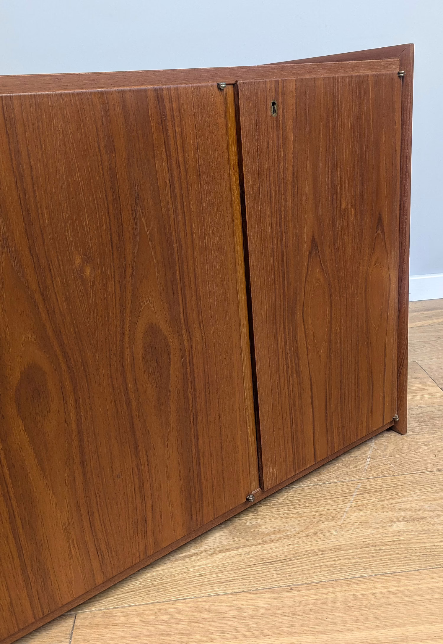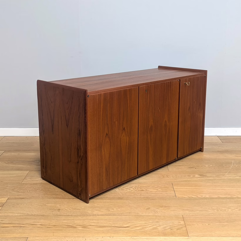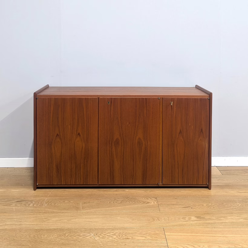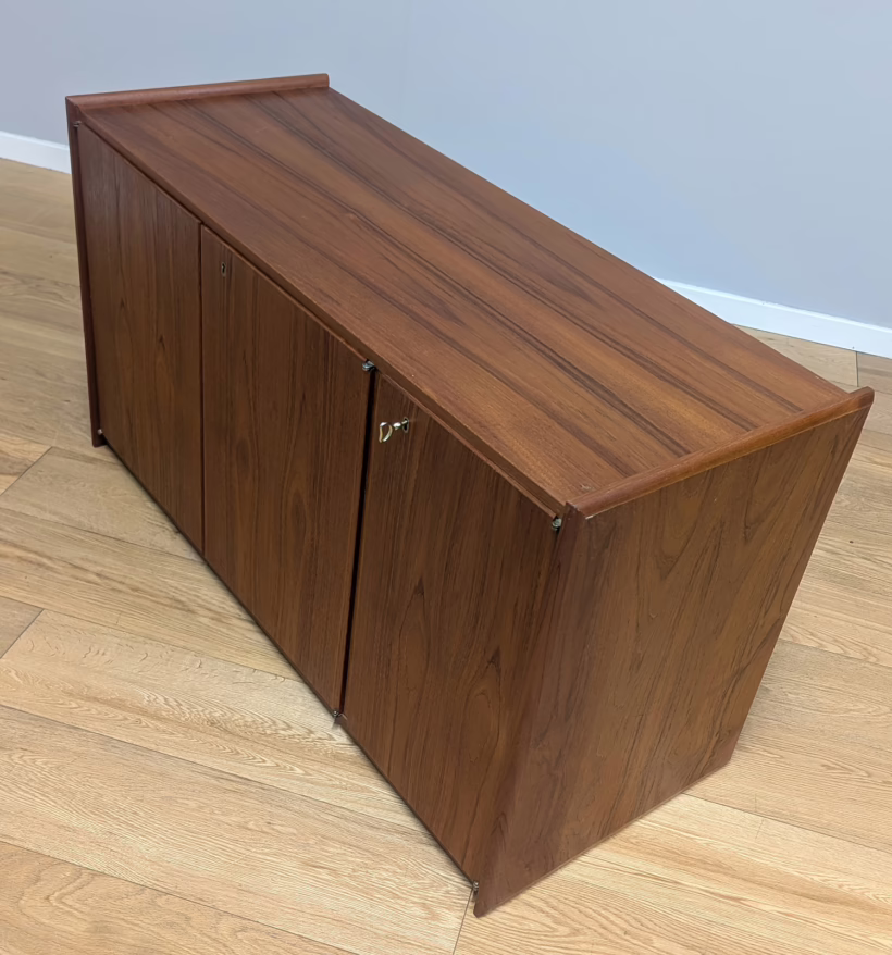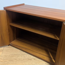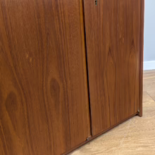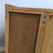 This original, vintage piece is ‘sold as seen’. It is in good – very good, used condition. We have checked and cleaned the piece inside, and it has been wax polished to restore its glow but otherwise the finish is original. There is a large double door cupboard and a smaller one on the right. The three doors open and close with ease with all hinges and closures in good, working order. There are no handles but there are working locks and a key, although it should be noted the doors remain pushed shut when unlocked. Both cupboards have an adjustable shelf inside and the interiors are clean and tidy with just light signs of use. There are minor knocks and blemishes here and there on the exterior wood in line with its age, including a historical damp tide mark on the back – please see our photo. Obviously as it’s on the back it doesn’t show and it’s just localised to the plywood backing. Overall it’s very well constructed, solid and stable. As this was a bespoke piece, there is no maker’s mark but we don’t doubt its history and provenance. The original metal fixings are on the back should you wish to wall mount it. Do browse through our photos for an accurate account of its super order. We aim to be as transparent and open as we can in our descriptions and images. If you have any queries or would like to view, please get in touch.
