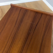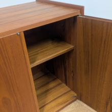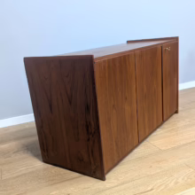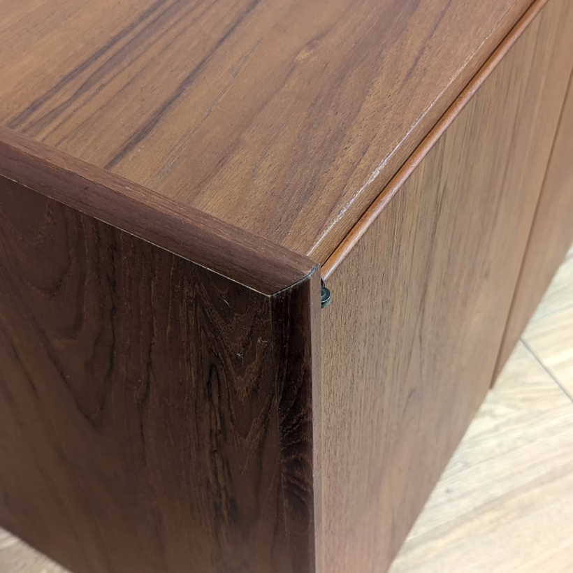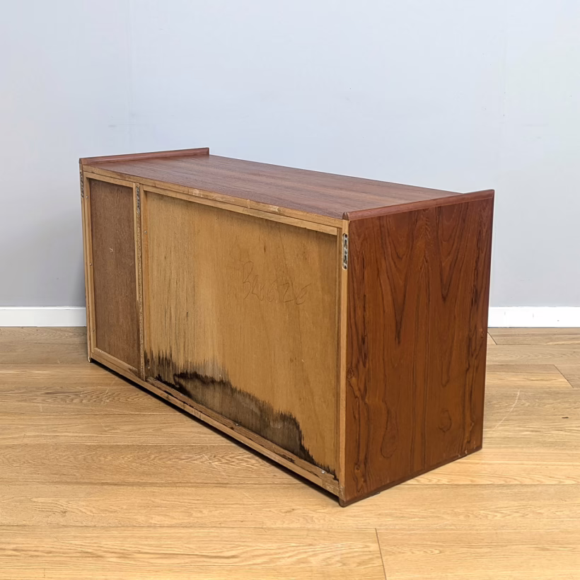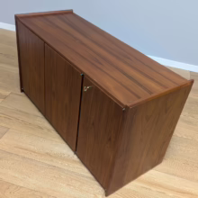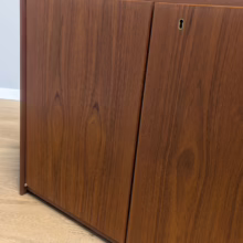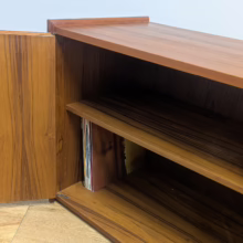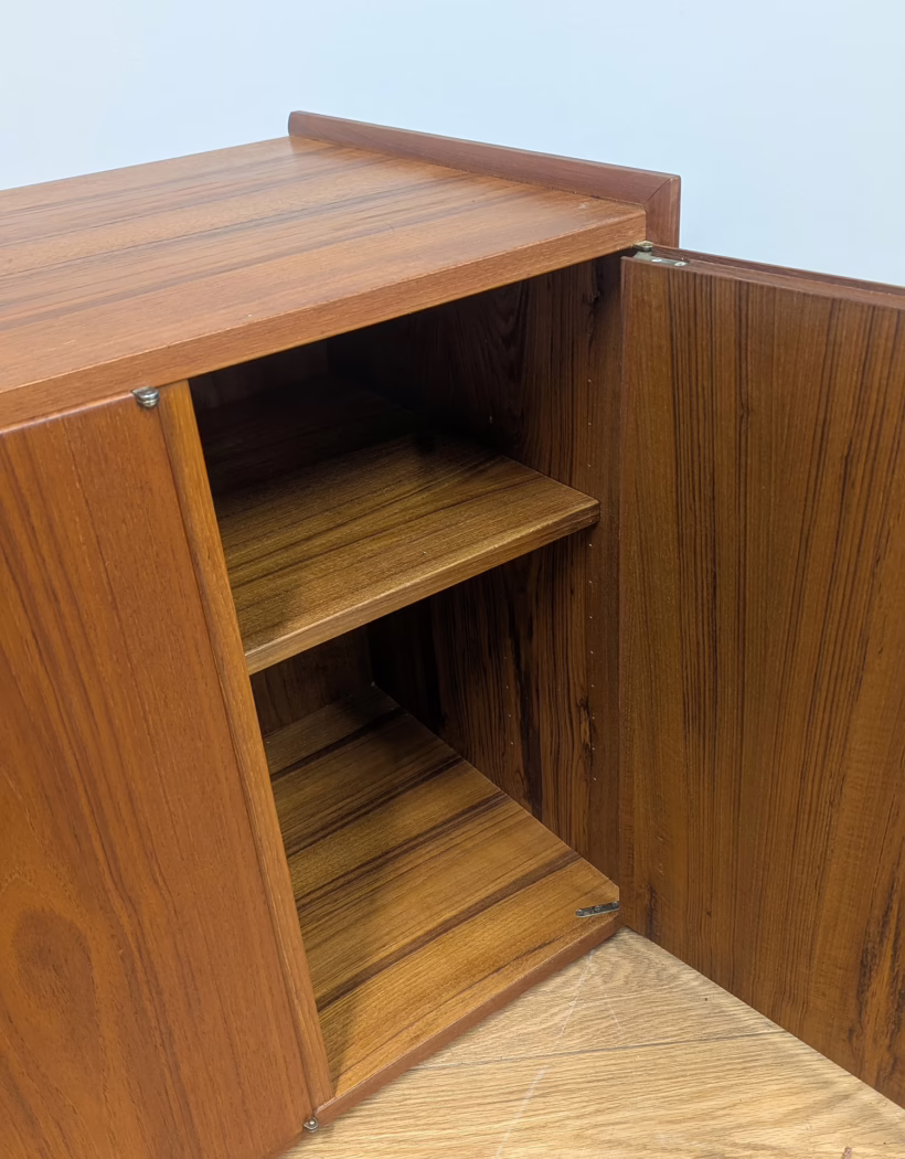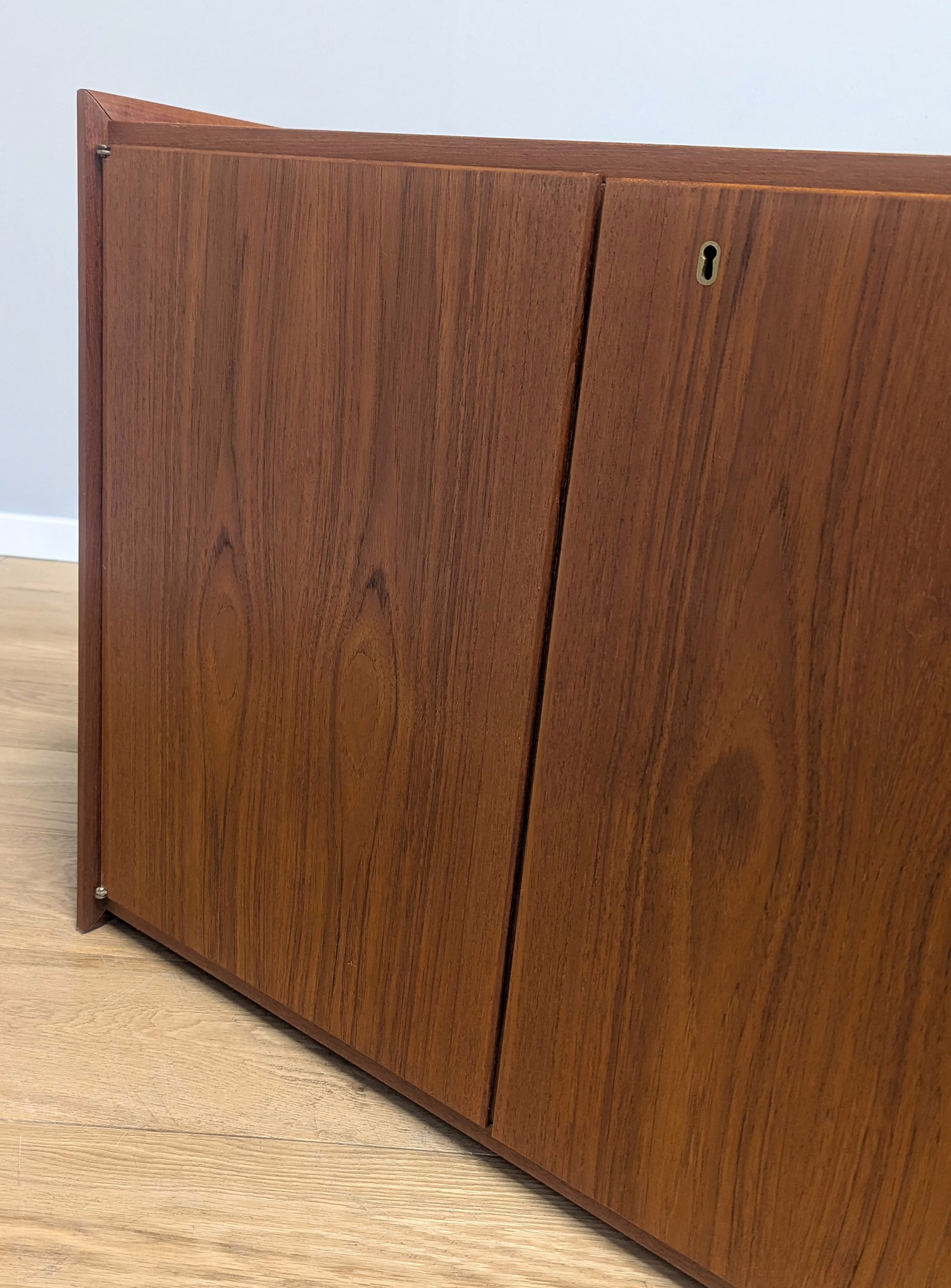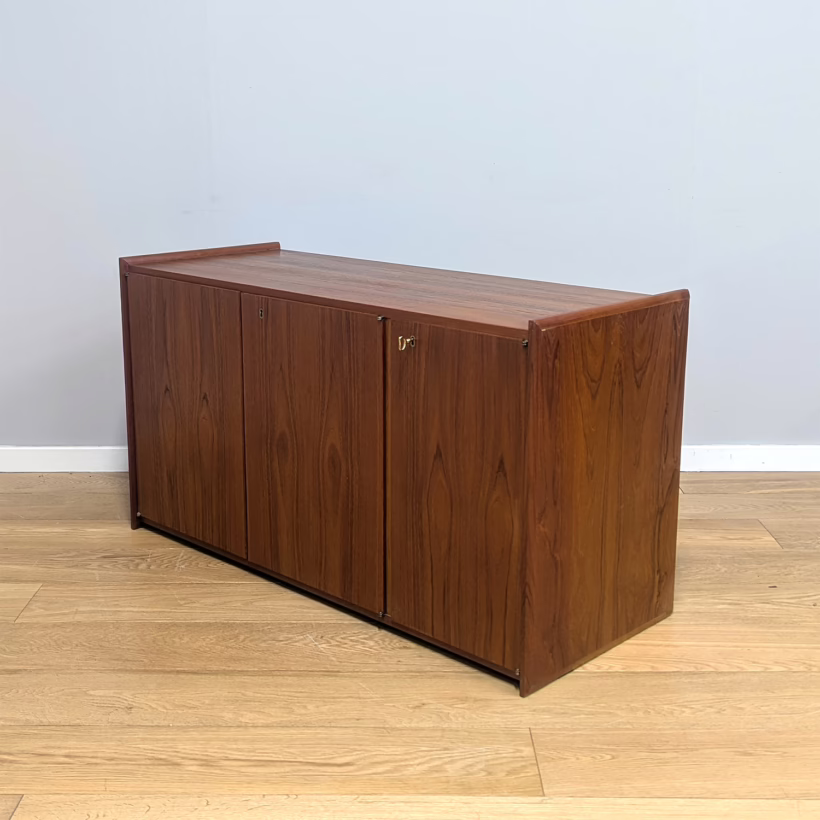 This original, vintage piece is ‘sold as seen’. It is in good – very good, used condition. We have checked and cleaned the piece inside, and it has been wax polished to restore its glow but otherwise the finish is original. There is a large double door cupboard and a smaller one on the right. The three doors open and close with ease with all hinges and closures in good, working order. There are no handles but there are working locks and a key, although it should be noted the doors remain pushed shut when unlocked. Both cupboards have an adjustable shelf inside and the interiors are clean and tidy with just light signs of use. There are minor knocks and blemishes here and there on the exterior wood in line with its age, including a historical damp tide mark on the back – please see our photo. Obviously as it’s on the back it doesn’t show and it’s just localised to the plywood backing. Overall it’s very well constructed, solid and stable. As this was a bespoke piece, there is no maker’s mark but we don’t doubt its history and provenance. The original metal fixings are on the back should you wish to wall mount it. Do browse through our photos for an accurate account of its super order. We aim to be as transparent and open as we can in our descriptions and images. If you have any queries or would like to view, please get in touch.