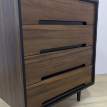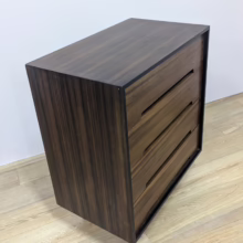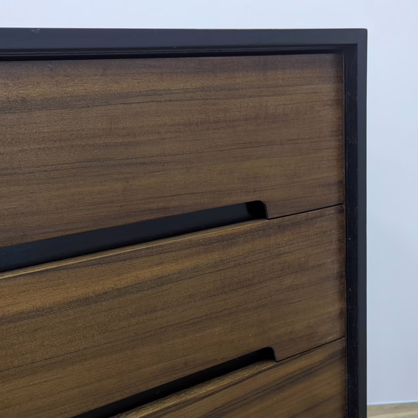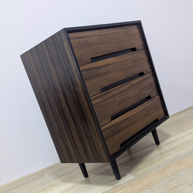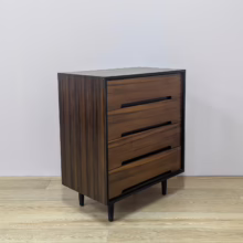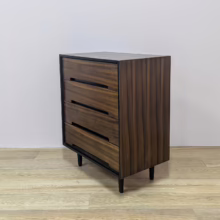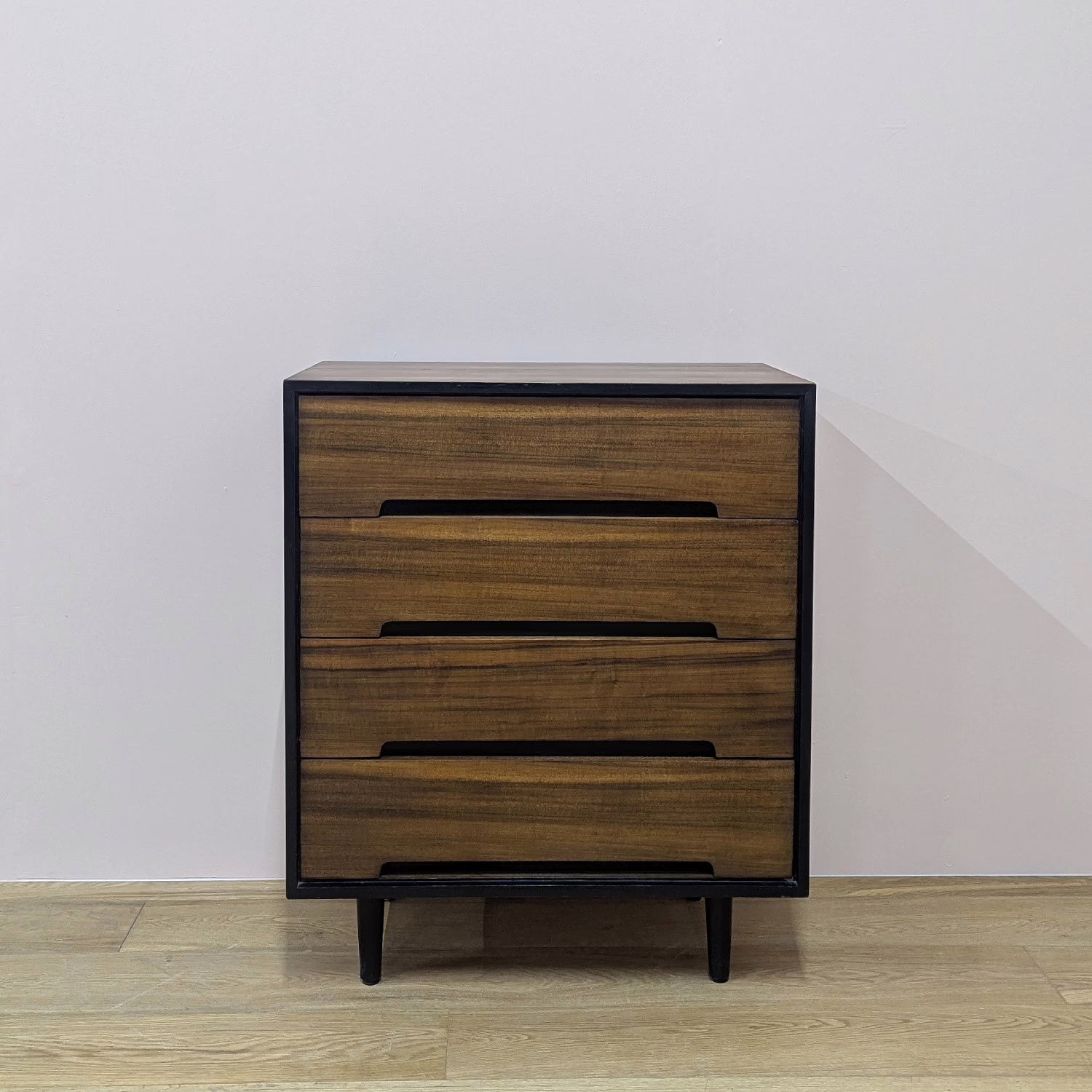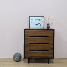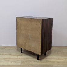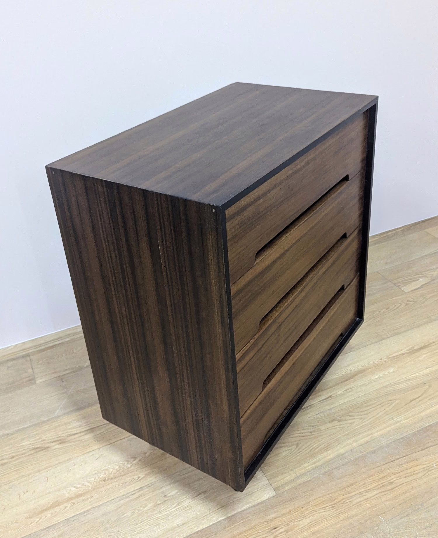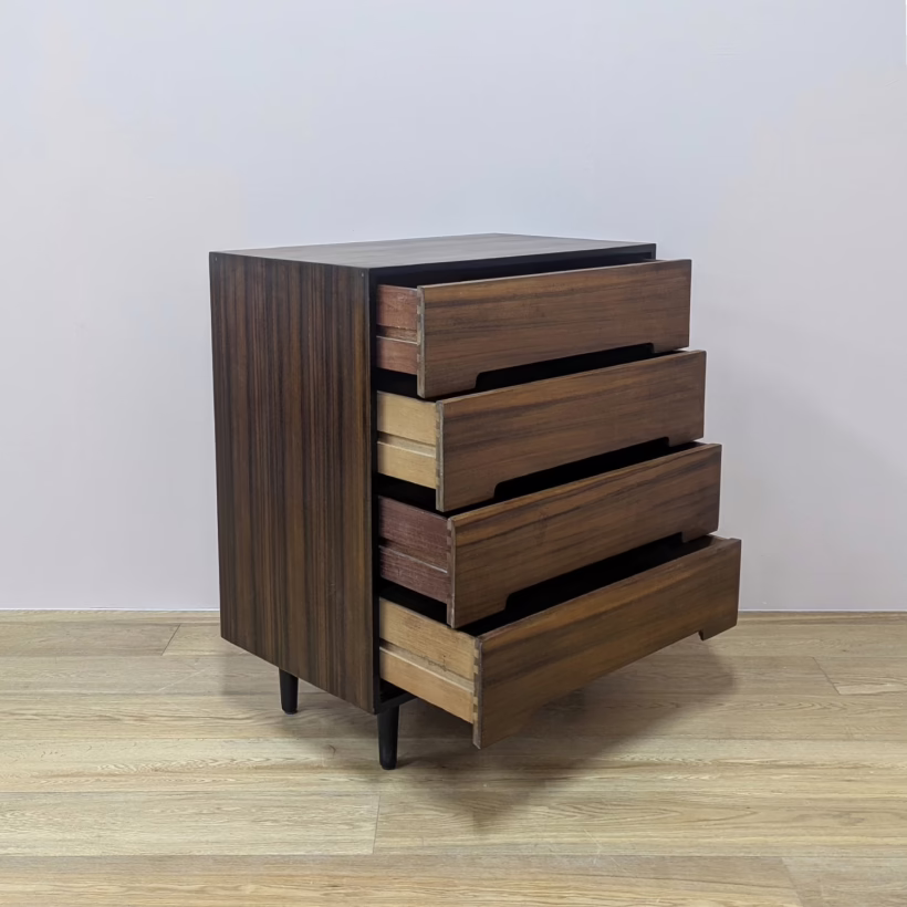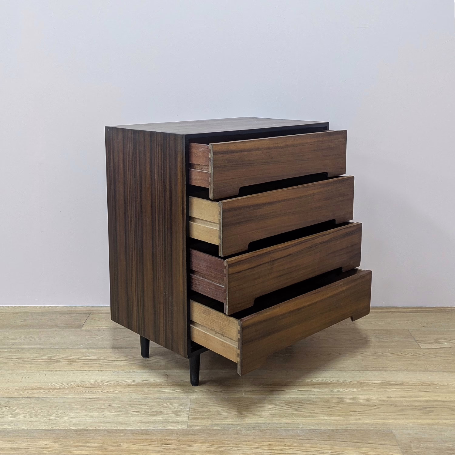 This is an original, vintage piece that is ‘sold as seen’. It is in very good, used condition. We have cleaned the piece inside and out, and exterior surfaces have been restored. This involved carefully chemically stripping back the original finish (gentler and less invasive than sanding), oil and then wax polish. We have also sprayed the trim, legs and inset drawer handles as to restore it to its original matt black glory. The four drawers are constructed with dovetail joints, integral handles and they slide with ease. They have clean, tidy interiors with just light signs of use. The exterior surfaces are in very good order, following their restoration, with just faint blemishes remaining. There is a very minor chip on the back right hand corner which we’ve shown but overall it’s barely visible. Sadly the original Stag maker’s label is no longer in place. Please browse our photos for an accurate account of this item. Any queries, do get in touch. Happy to help.