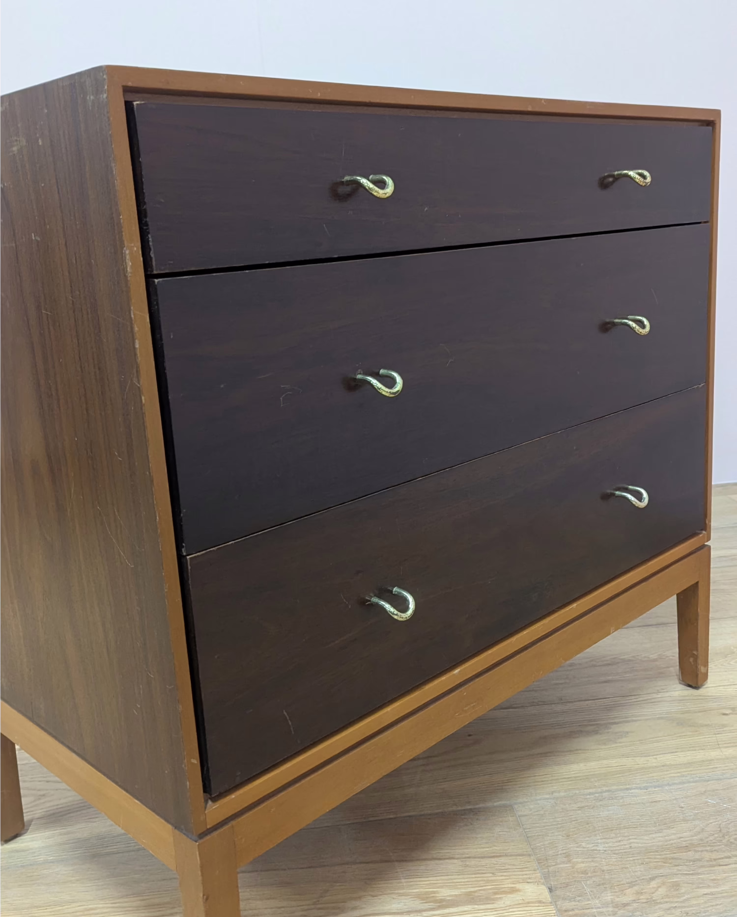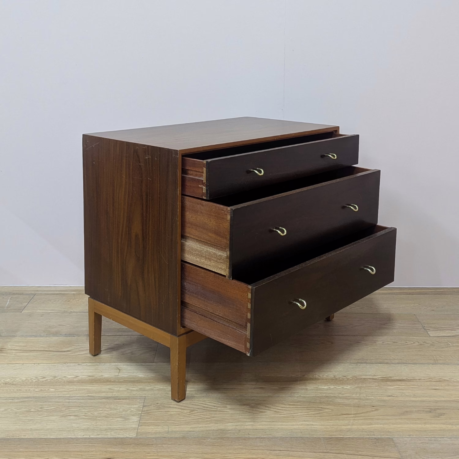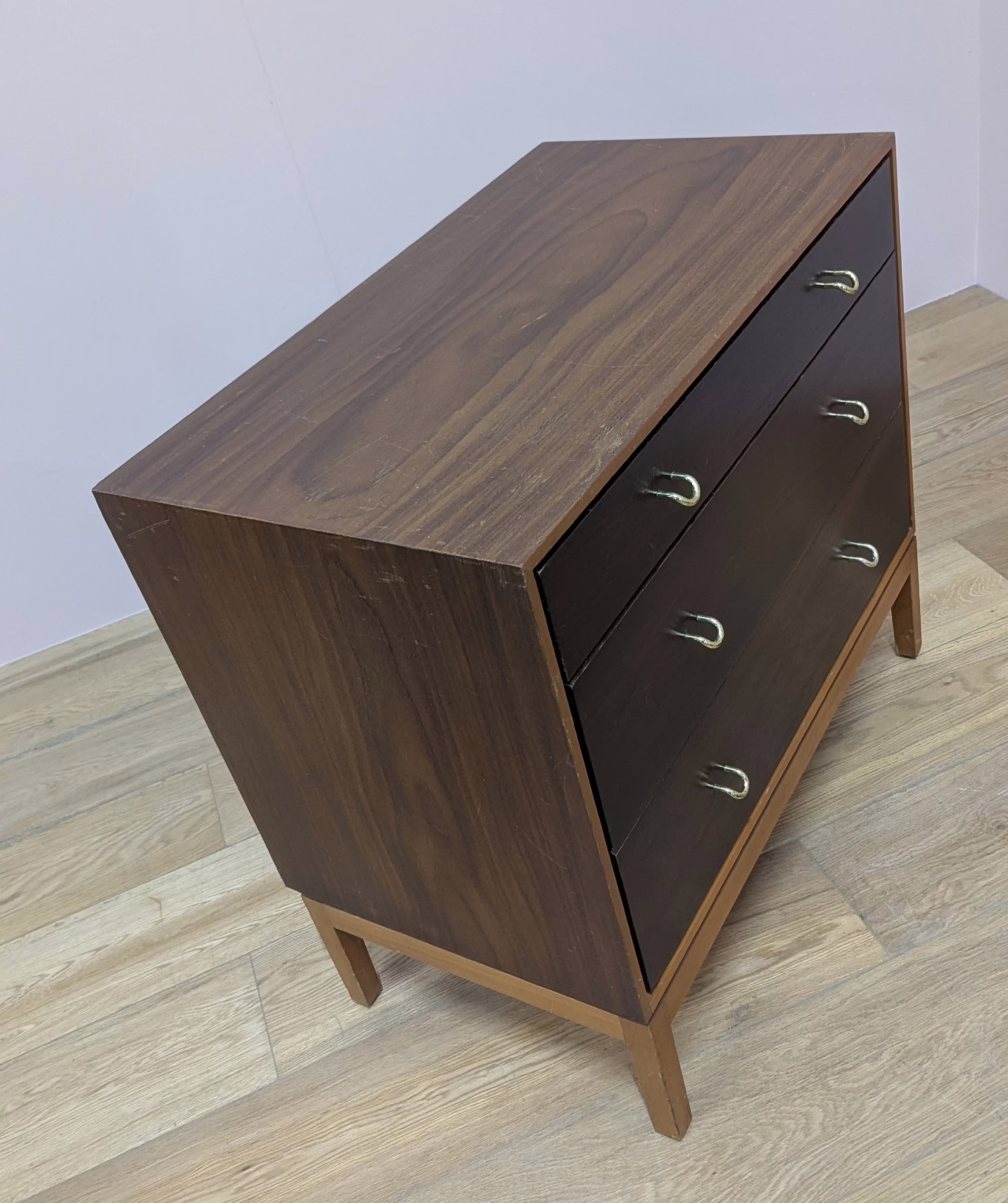 This is an original, vintage piece that is ‘sold as seen’. We have serviced and cleaned the piece inside and out applying a natural polish to revive the shine but otherwise the finish is original. The three drawers are beautifully made with dovetail joints and solid wood fronts. They open and close with ease and the original brass handles are securely attached. There are surface scuffs, scratches and blemishes to the original exterior finish which are clearly shown across our photos but given the age of the drawer chest, this is what we would expect with a piece of this nature. Despite this, the piece remains stable, sturdy and with a great deal of life and appeal left in tact. It’s very well made and the superficial wear and tear is reflected in our price. Sadly the original Stag maker’s label is no longer in place. Please browse our photos for an accurate account of this item. Any queries, do get in touch. Happy to help.