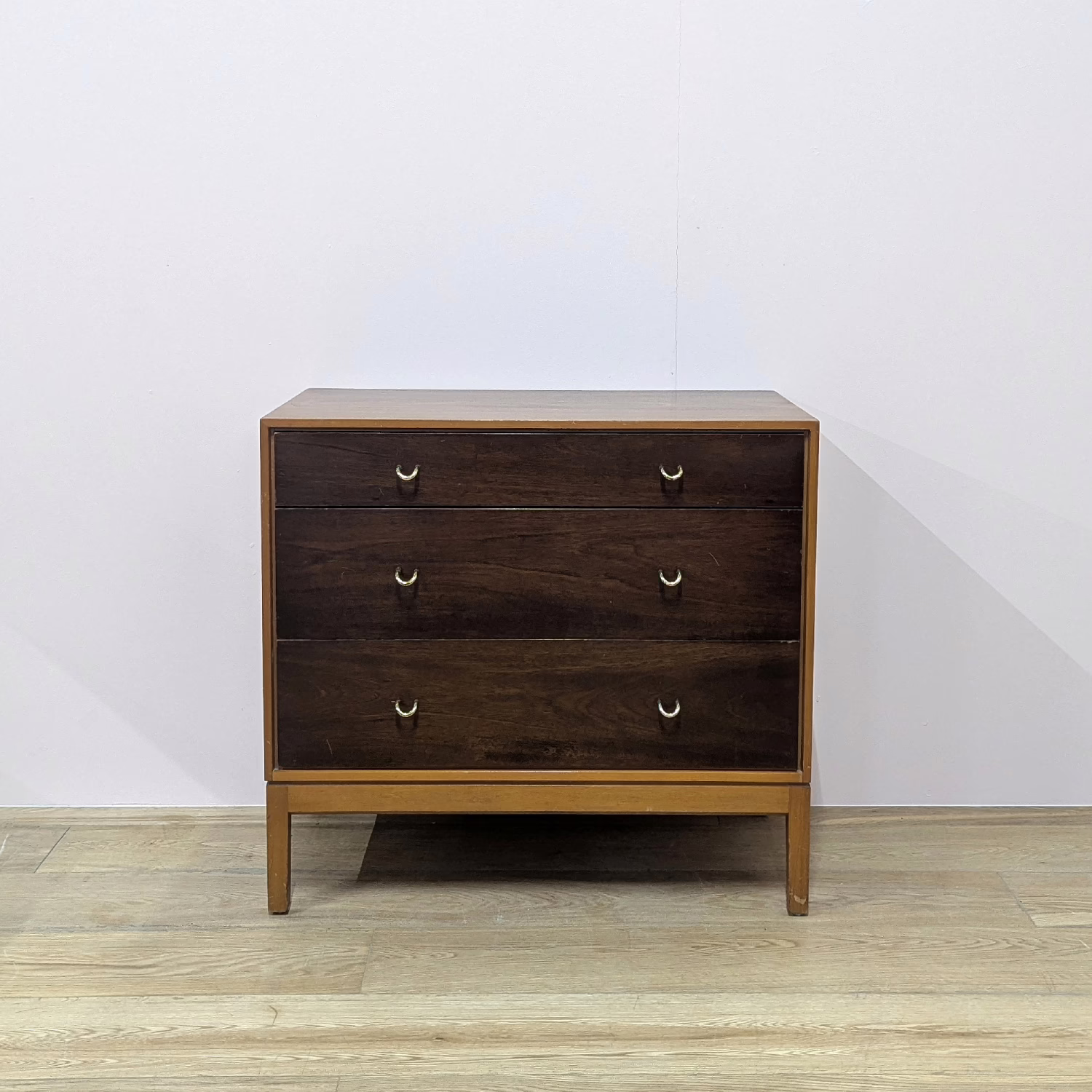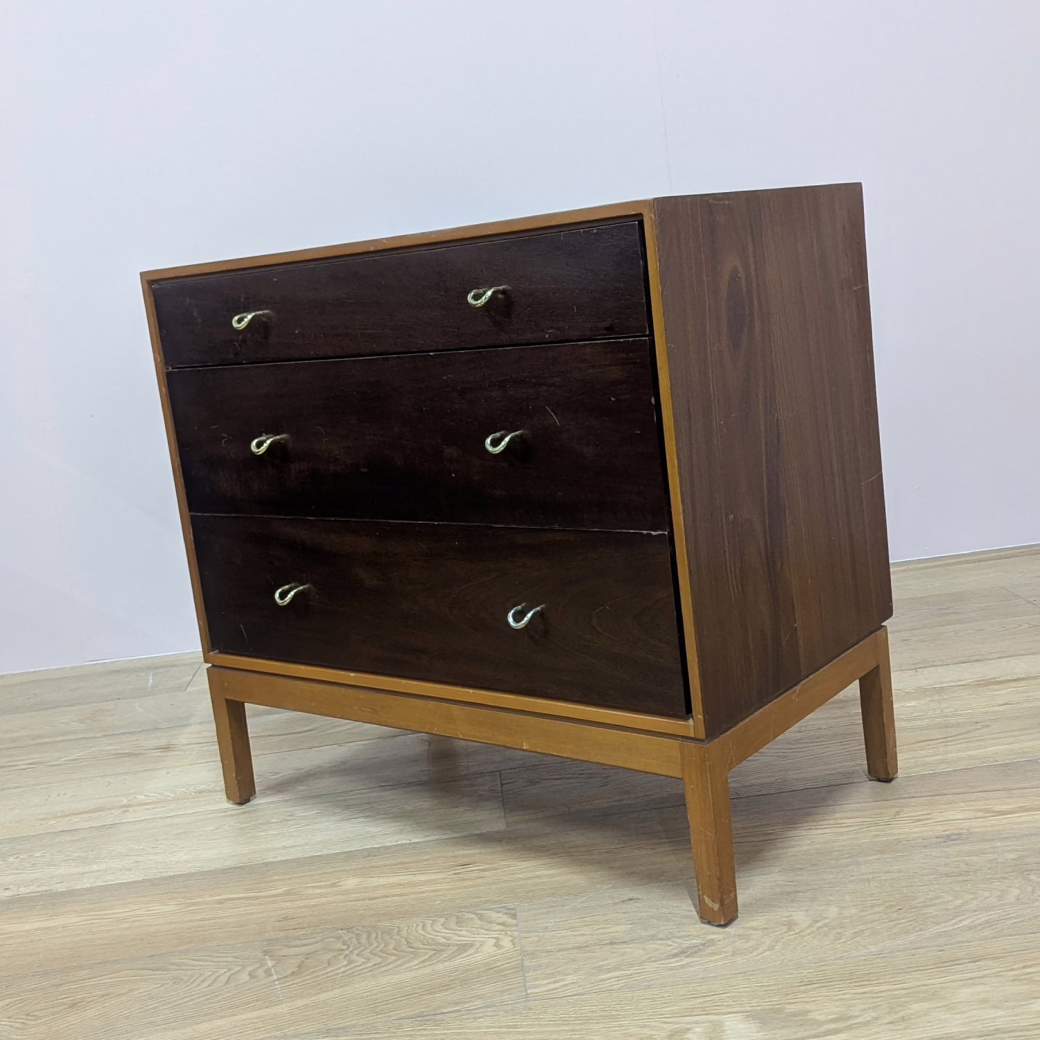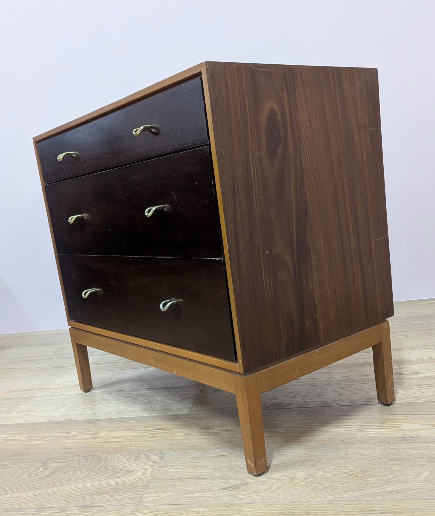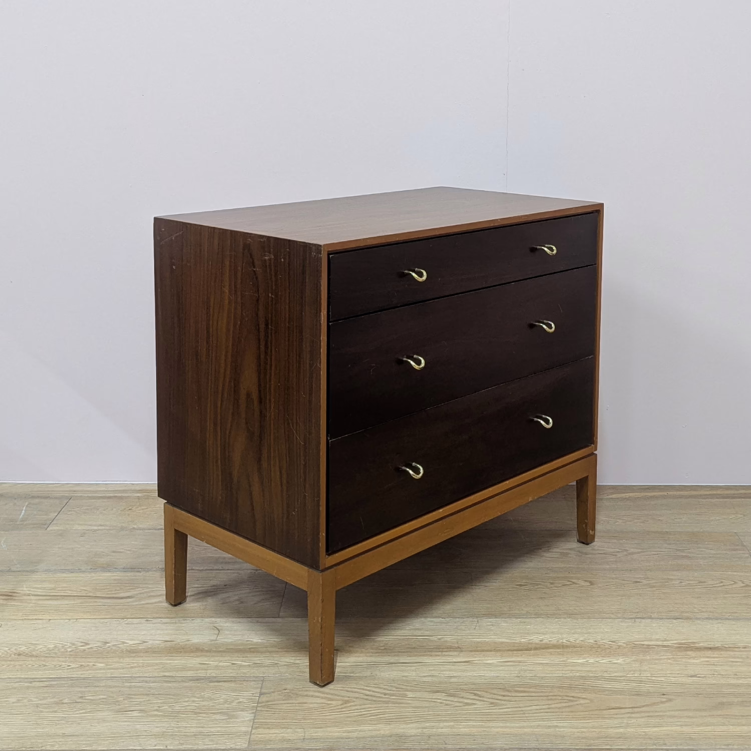 This is an original, vintage piece that is ‘sold as seen’. We have serviced and cleaned the piece inside and out applying a natural polish to revive the shine but otherwise the finish is original. The three drawers are beautifully made with dovetail joints and solid wood fronts. They open and close with ease and the original brass handles are securely attached. There are surface scuffs, scratches and blemishes to the original exterior finish which are clearly shown across our photos but given the age of the drawer chest, this is what we would expect with a piece of this nature. Despite this, the piece remains stable, sturdy and with a great deal of life and appeal left in tact. It’s very well made and the superficial wear and tear is reflected in our price. Sadly the original Stag maker’s label is no longer in place. Please browse our photos for an accurate account of this item. Any queries, do get in touch. Happy to help.