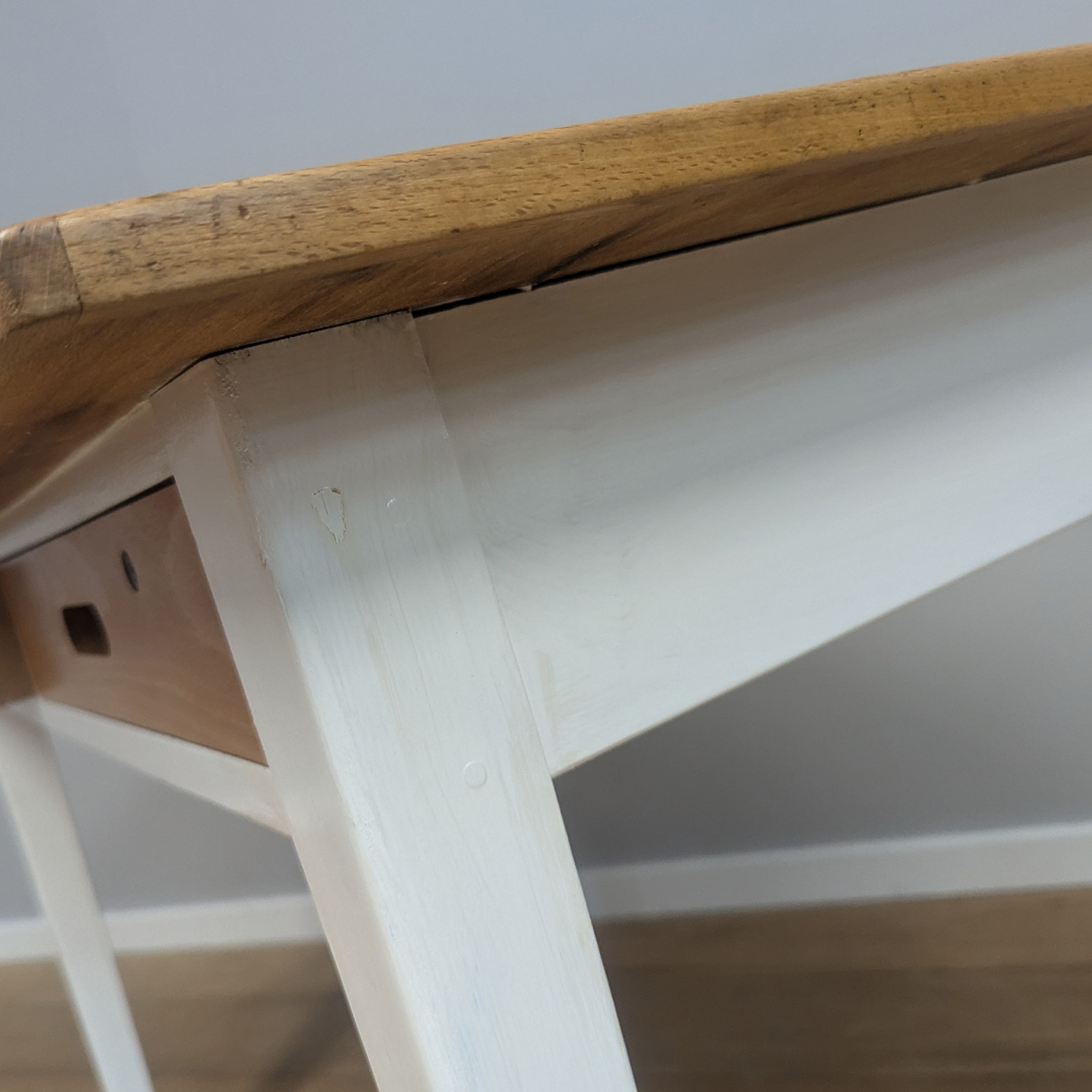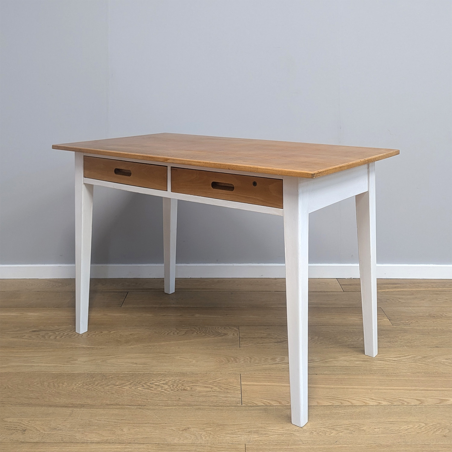 This is an original, vintage desk that is ‘sold as seen’. It is in overall good, used condition. It has been checked and cleaned, and the desk top and drawer fronts have been lightly restored, oiled and polished, removing some of the marks, but not stripping away all of its character and history. Please browse our photos for a good sense of its condition. At some point the legs and surround have been painted white. This has been well-done and is in good order with just light signs of wear. The two drawers feature dovetail joints, have integral pull handles and they slide with ease. One of the drawers has a pen leak stain in the bottom (shown in our pictures) and sadly we do not have the key for the lock. It’s a solidly made piece built to withstand much wear and tear. Although no maker’s mark in place, we attribute this with confidence as it was salvaged directly along with other ESA Esavian desks and school furniture.