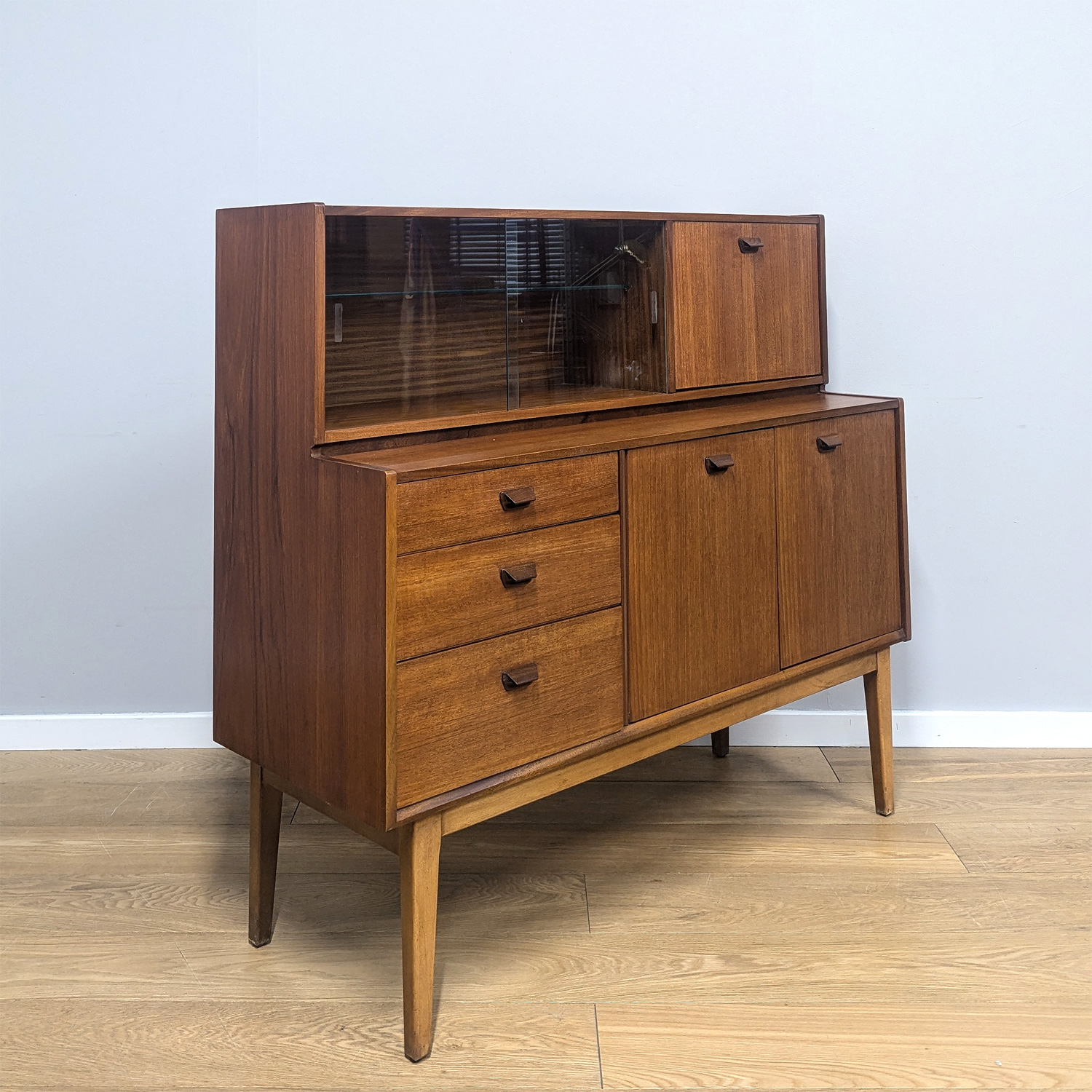 This is an original, vintage piece that is ‘sold as seen’. It is in very good, used condition. The piece has been cleaned, inside and out, and a natural beeswax polish applied and buffed on the external surfaces, but otherwise the finish is original. All handles, hinges, doors and closures are in very good, working order. All interiors are clean and tidy with nothing to flag. The lower double door cupboard features a fixed shelf. The top drawer is sectioned and lined, originally intended for cutlery. The glass door bookcase features a glass, adjustable shelf. The doors are in good order and slide easily in their runners. The fall-door drinks cabinet features Formica back for mixing drinks on. There are very light, superficial knocks and scuffs to the exterior wood surfaces but nothing to flag. It’s an extremely well-made piece and the original Nathan label can be seen inside the cupboard door. Please do browse our photos for an accurate sense of its colour and superb condition. If you have questions or would like to see this piece in person, just get in touch.
