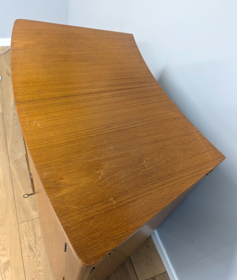 This original, vintage cabinet is ‘sold as seen’. It’s in very good, used condition. We have thoroughly cleaned it, inside and out. The double doors at the front open to reveal a generous lower cupboard space with three fixed shelves. On the back of each door are fittings for storing a juicer, cocktail sticks and a small tray. The originals were missing so we have added new accessories. As you can see from our photos the interior is clean, tidy and in very good order. There is a working lock with a key and the left hand door has an internal bolt at the top and bottom. There is an internal light with has been rewired and PAT tested. The top surface is hinged on either side and folds out to double the surface area and create a curved bar. This is coated in Formica to give a hardy,-wipe-clean surface and the middle has a glass inset. The bar is double-sided and there are sliding glass doors on the back of the cabinet to access the shelves. The doors and runners are in very good order. There are some light scuffs and scratches to the external wood primarily on the top of the cabinet as we’ve shown but this is very minor overall given its considerable years. It’s well-made, solid and sturdy with no signs of structural repair or areas of concern. The Turnidge maker’s is sadly not in place but we attribute it with confidence as we’ve sold these previously. Please do browse our photos for an accurate sense of this item’s great condition. If you have any queries or would like to come and see it in person, just drop us a line.