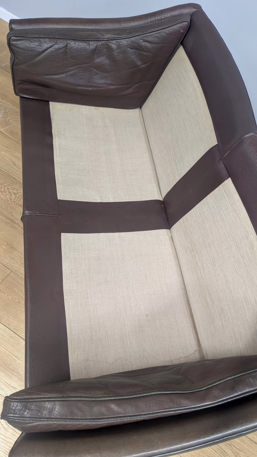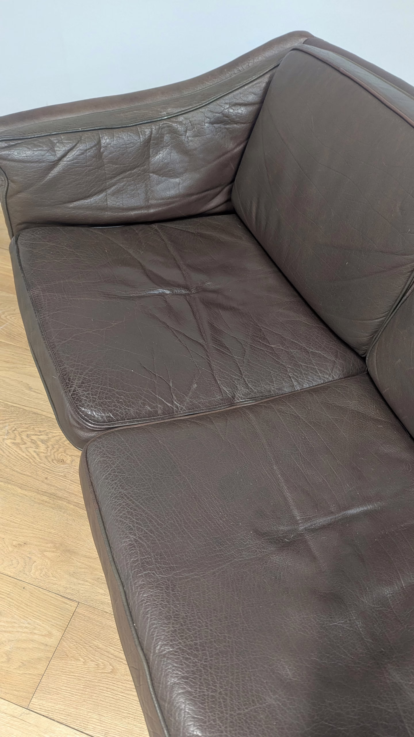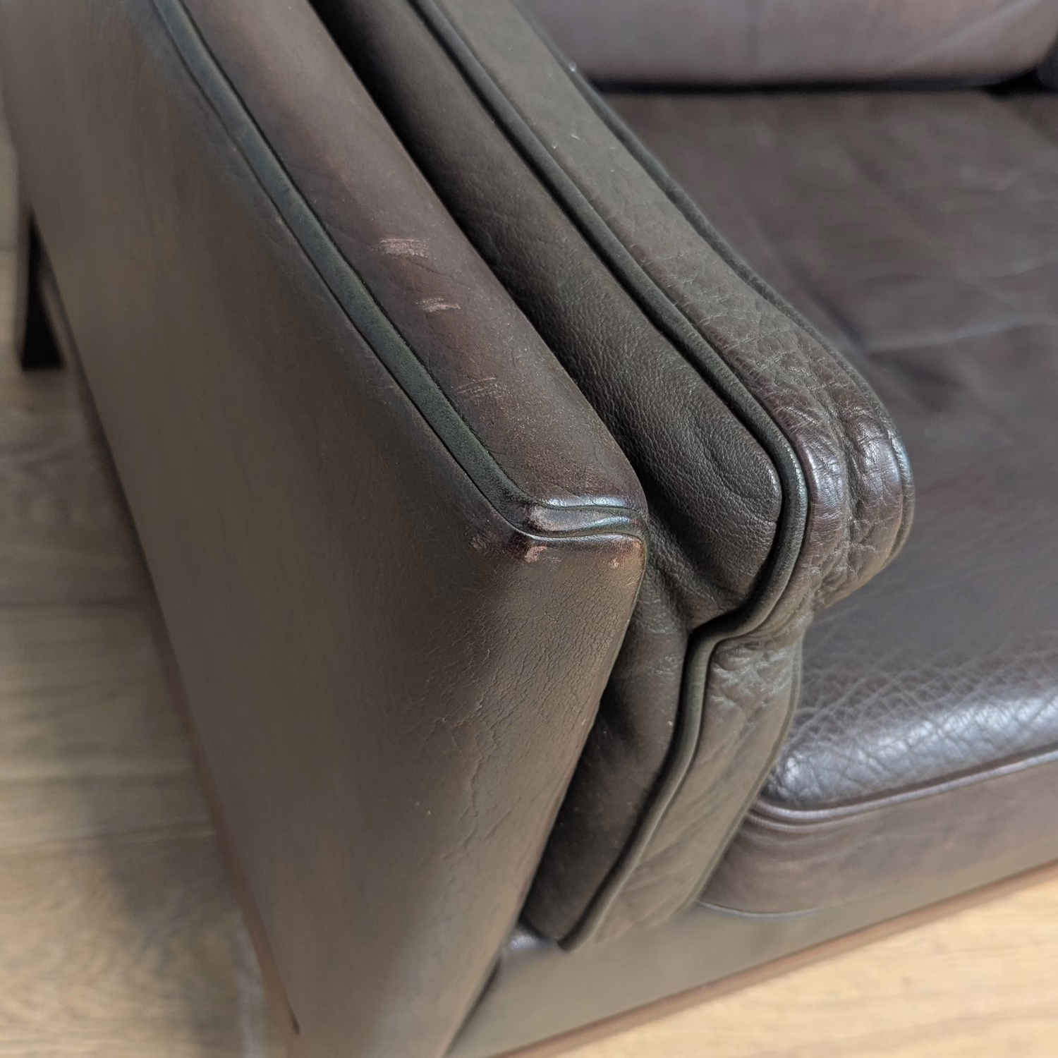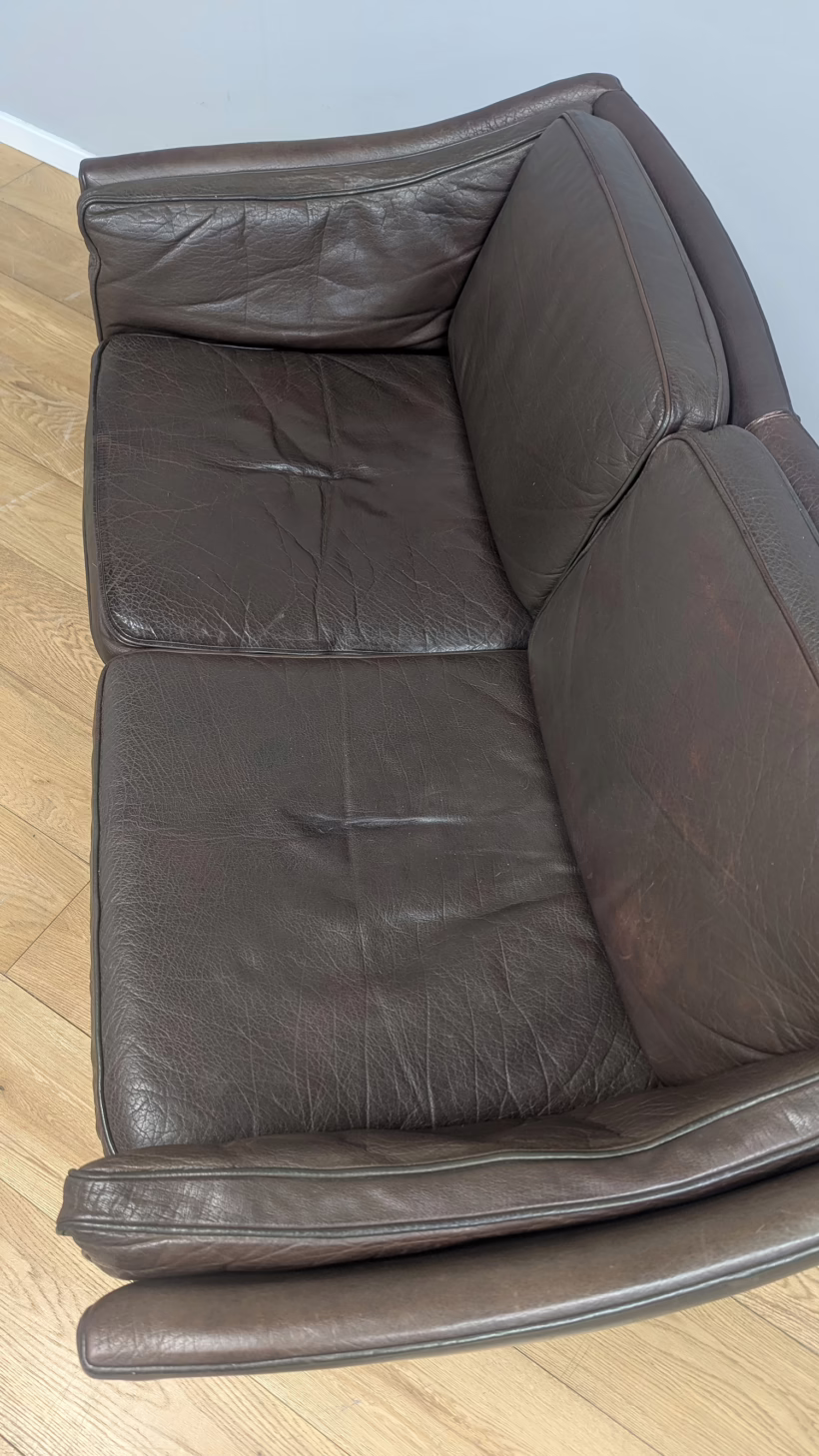 This original, vintage sofa is ‘sold as seen’. It is in good, used condition. The wooden rosewood frame has been cleaned and a natural beeswax polish applied to revive its shine but otherwise the finish is original. The leather upholstery is original too. There are six cushions in total, all with working zips, plump inner cushions and backing cloth in good – very good order. The cushion leather is wrinkled and lightly scrunched with use, as we’ve shown, but very much as we would expect with vintage sofa of this age. The fixed leather upholstery on the frame is also in good order, hugging the contours of the sofa frame well. Again, there are wrinkles, marks and scuffs here and there across the fixed leather which can be seen across our various photos. This is primarily on the chair’s corners / edges / tops and there is a blemish on one end which we’ve flagged in our photos. Overall marks, scuffs and wrinkles are very much part of its vintage, lived-in appeal in our view but do browse our photos. The finishing fabric underneath the cushions is in good condition too with some light tide marks underneath the end cushions as shown. The lower wooden frame carries some very light knocks and surface scuffs. It was imported directly from Denmark and it dates from the early 1970s. Although there is no maker’s label, it is a well-documented design. Do browse our numerous photos for an accurate sense of its colour and order. If you would like to view the sofa or have any questions at all, please do get in touch.