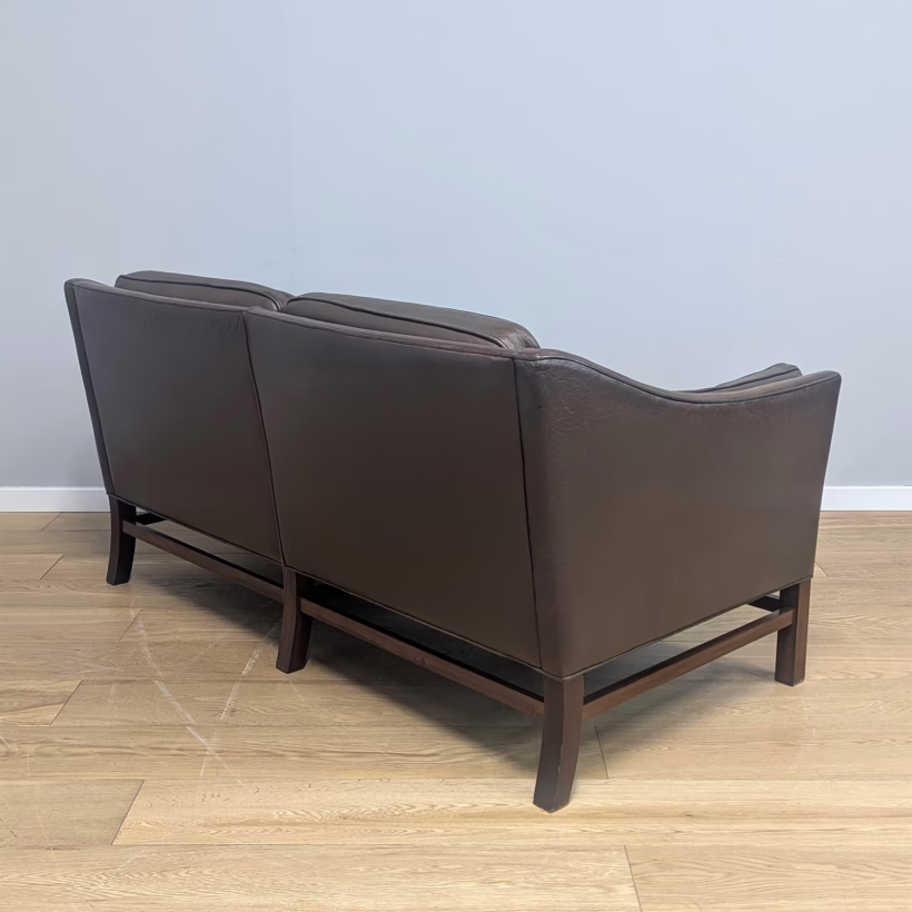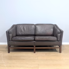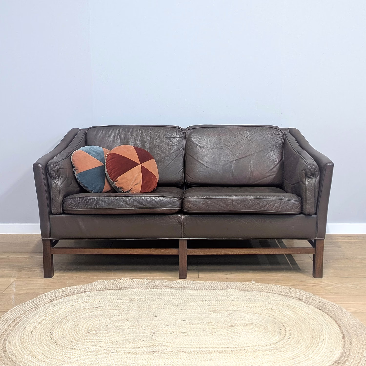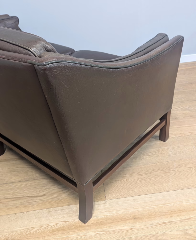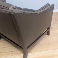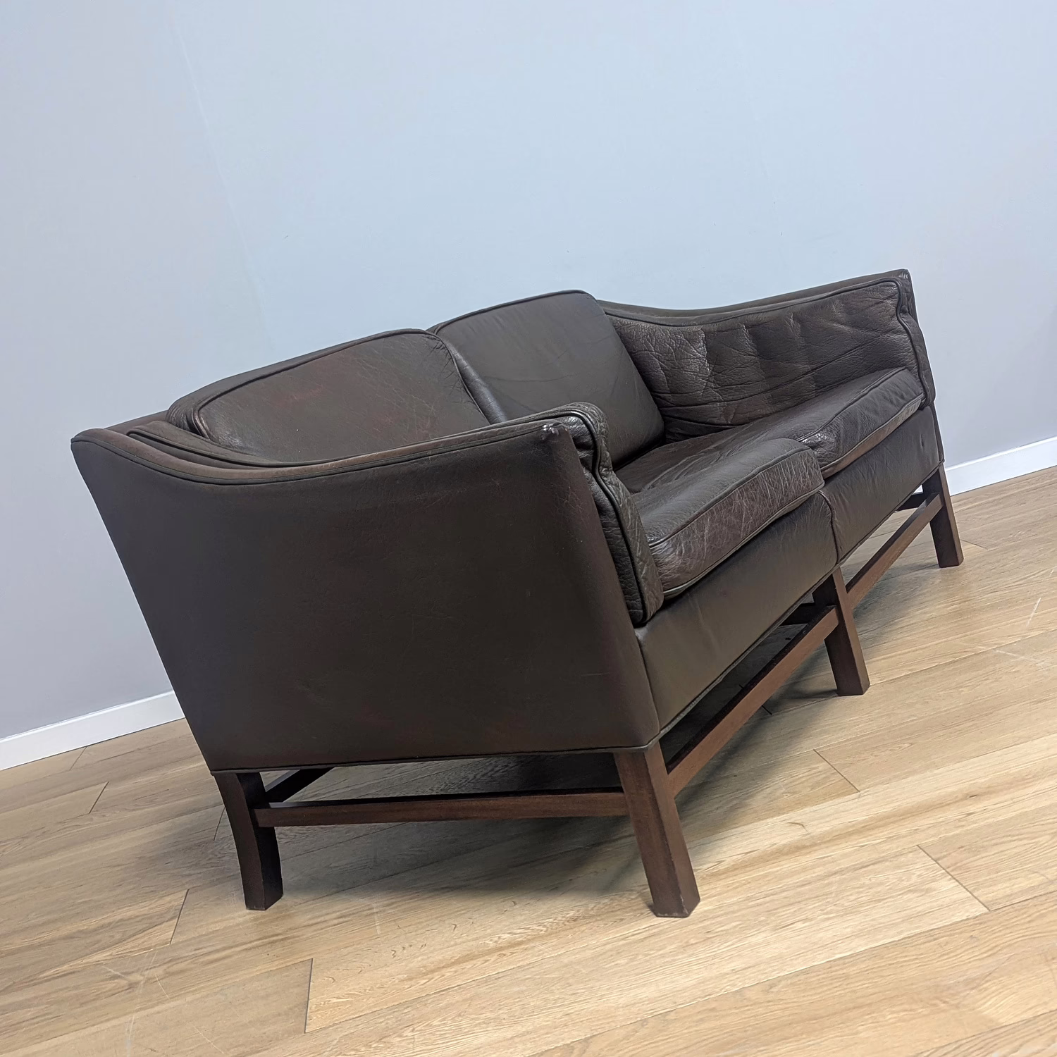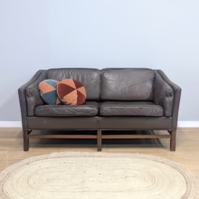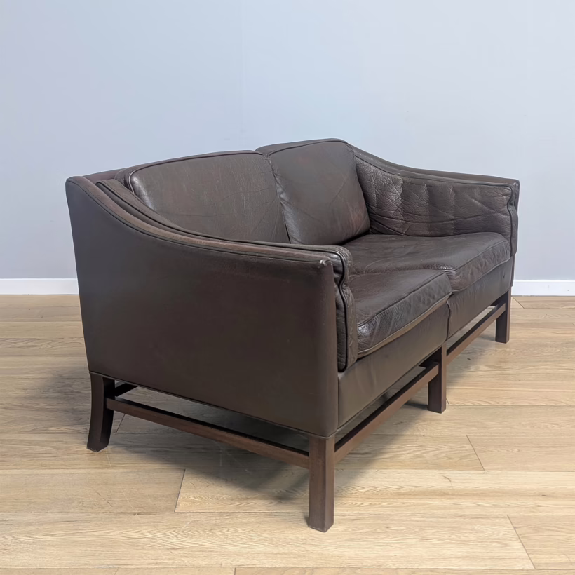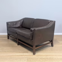 This original, vintage sofa is ‘sold as seen’. It is in good, used condition. The wooden rosewood frame has been cleaned and a natural beeswax polish applied to revive its shine but otherwise the finish is original. The leather upholstery is original too. There are six cushions in total, all with working zips, plump inner cushions and backing cloth in good – very good order. The cushion leather is wrinkled and lightly scrunched with use, as we’ve shown, but very much as we would expect with vintage sofa of this age. The fixed leather upholstery on the frame is also in good order, hugging the contours of the sofa frame well. Again, there are wrinkles, marks and scuffs here and there across the fixed leather which can be seen across our various photos. This is primarily on the chair’s corners / edges / tops and there is a blemish on one end which we’ve flagged in our photos. Overall marks, scuffs and wrinkles are very much part of its vintage, lived-in appeal in our view but do browse our photos. The finishing fabric underneath the cushions is in good condition too with some light tide marks underneath the end cushions as shown. The lower wooden frame carries some very light knocks and surface scuffs. It was imported directly from Denmark and it dates from the early 1970s. Although there is no maker’s label, it is a well-documented design. Do browse our numerous photos for an accurate sense of its colour and order. If you would like to view the sofa or have any questions at all, please do get in touch.