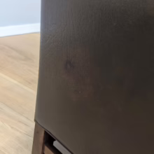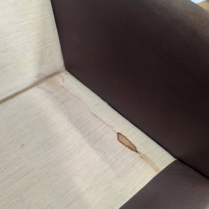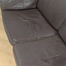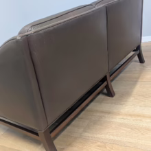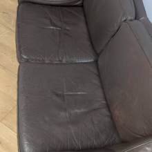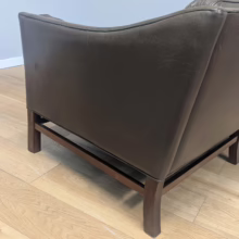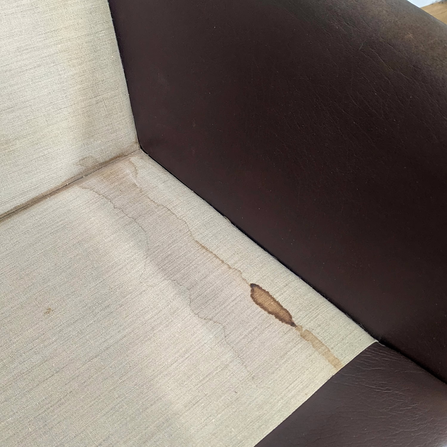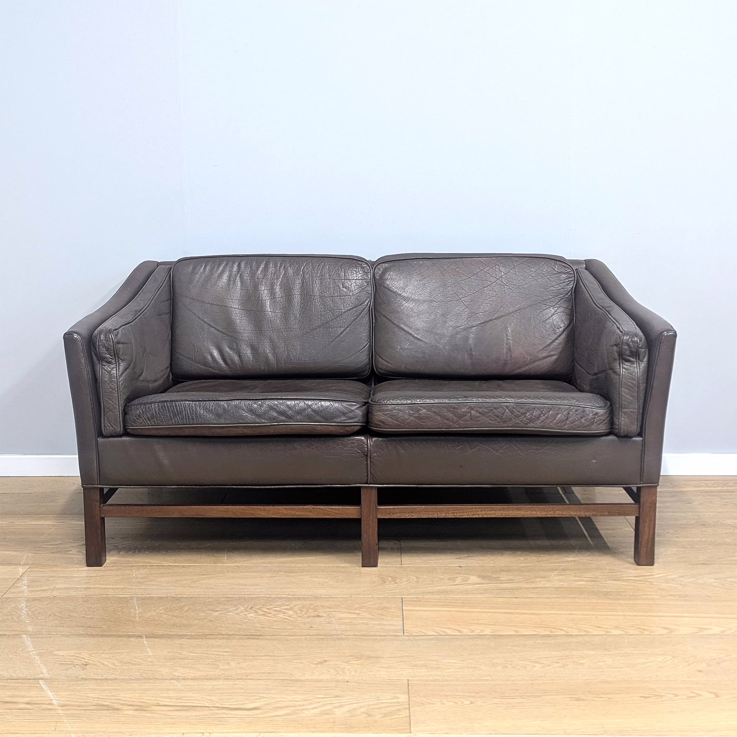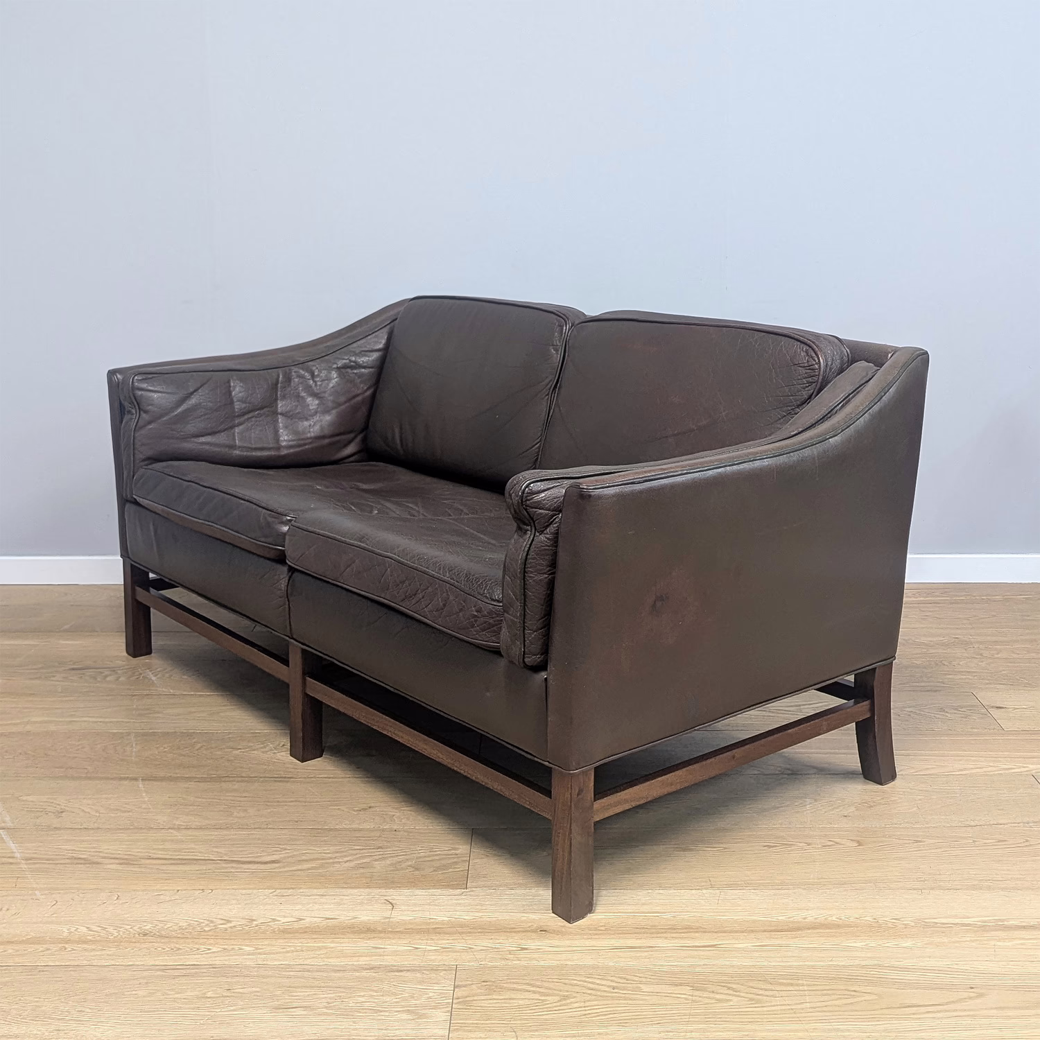 This original, vintage sofa is ‘sold as seen’. It is in good, used condition. The wooden rosewood frame has been cleaned and a natural beeswax polish applied to revive its shine but otherwise the finish is original. The leather upholstery is original too. There are six cushions in total, all with working zips, plump inner cushions and backing cloth in good – very good order. The cushion leather is wrinkled and lightly scrunched with use, as we’ve shown, but very much as we would expect with vintage sofa of this age. The fixed leather upholstery on the frame is also in good order, hugging the contours of the sofa frame well. Again, there are wrinkles, marks and scuffs here and there across the fixed leather which can be seen across our various photos. This is primarily on the chair’s corners / edges / tops and there is a blemish on one end which we’ve flagged in our photos. Overall marks, scuffs and wrinkles are very much part of its vintage, lived-in appeal in our view but do browse our photos. The finishing fabric underneath the cushions is in good condition too with some light tide marks underneath the end cushions as shown. The lower wooden frame carries some very light knocks and surface scuffs. It was imported directly from Denmark and it dates from the early 1970s. Although there is no maker’s label, it is a well-documented design. Do browse our numerous photos for an accurate sense of its colour and order. If you would like to view the sofa or have any questions at all, please do get in touch.