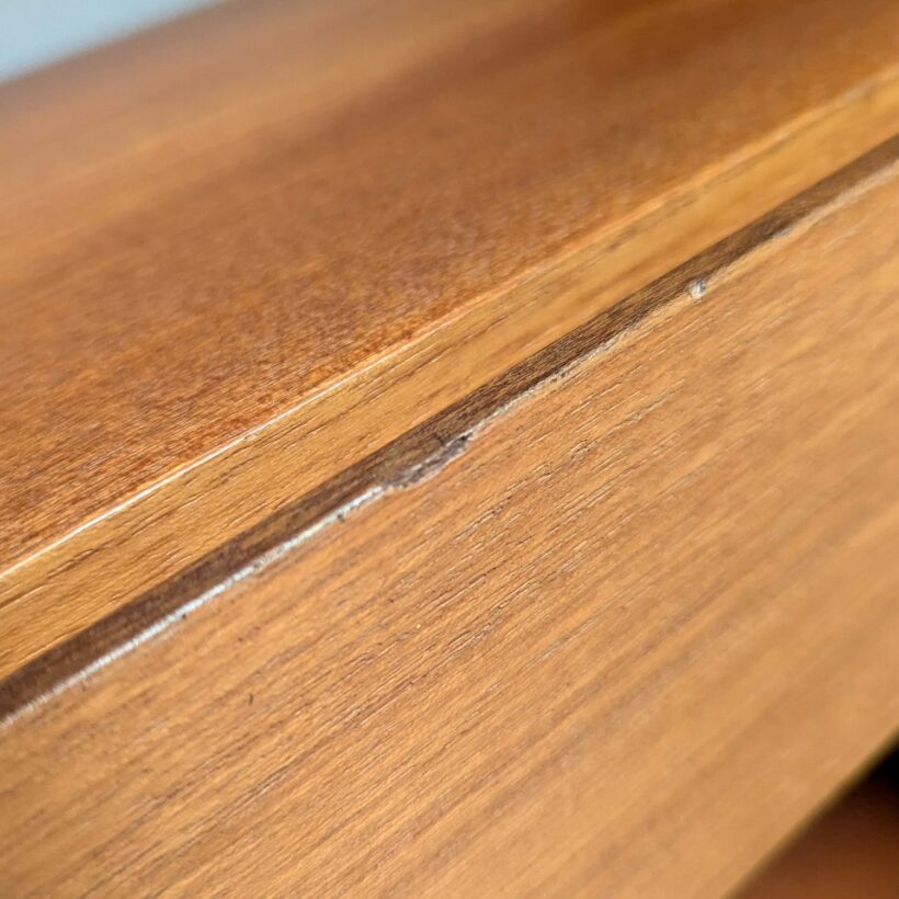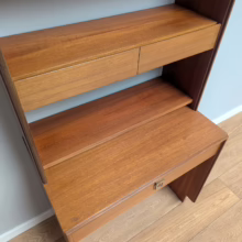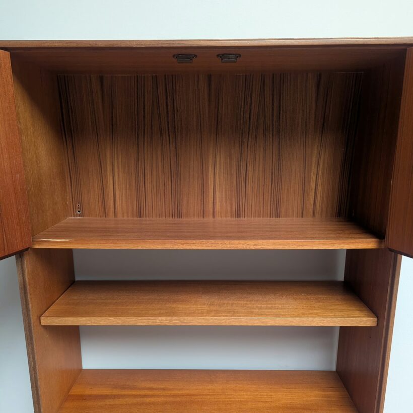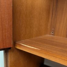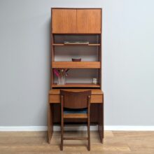 This is an original, vintage piece that is ‘sold as seen’. It is in good – very good, used condition. We have checked, cleaned and polished this piece, applying a natural beeswax polish to the exterior wood surfaces but otherwise the finish is original. It’s a two part, freestanding piece where the upper section simply sits on the base, however for peace of mind we would recommend that the upper unit be secured to the base section. Plates are supplied for this purpose. The upper section features one adjustable shelf, one fixed shelf, a double door top cupboard and two small drawers. Closures, hinges and interiors are all in very good order. The base desk unit features a sectioned drawer with one half baize lined. The brass handle is original and securely attached. The drawer slides easily and also has a clean interior. The G Plan red logos can be seen on both the upper and base sections.