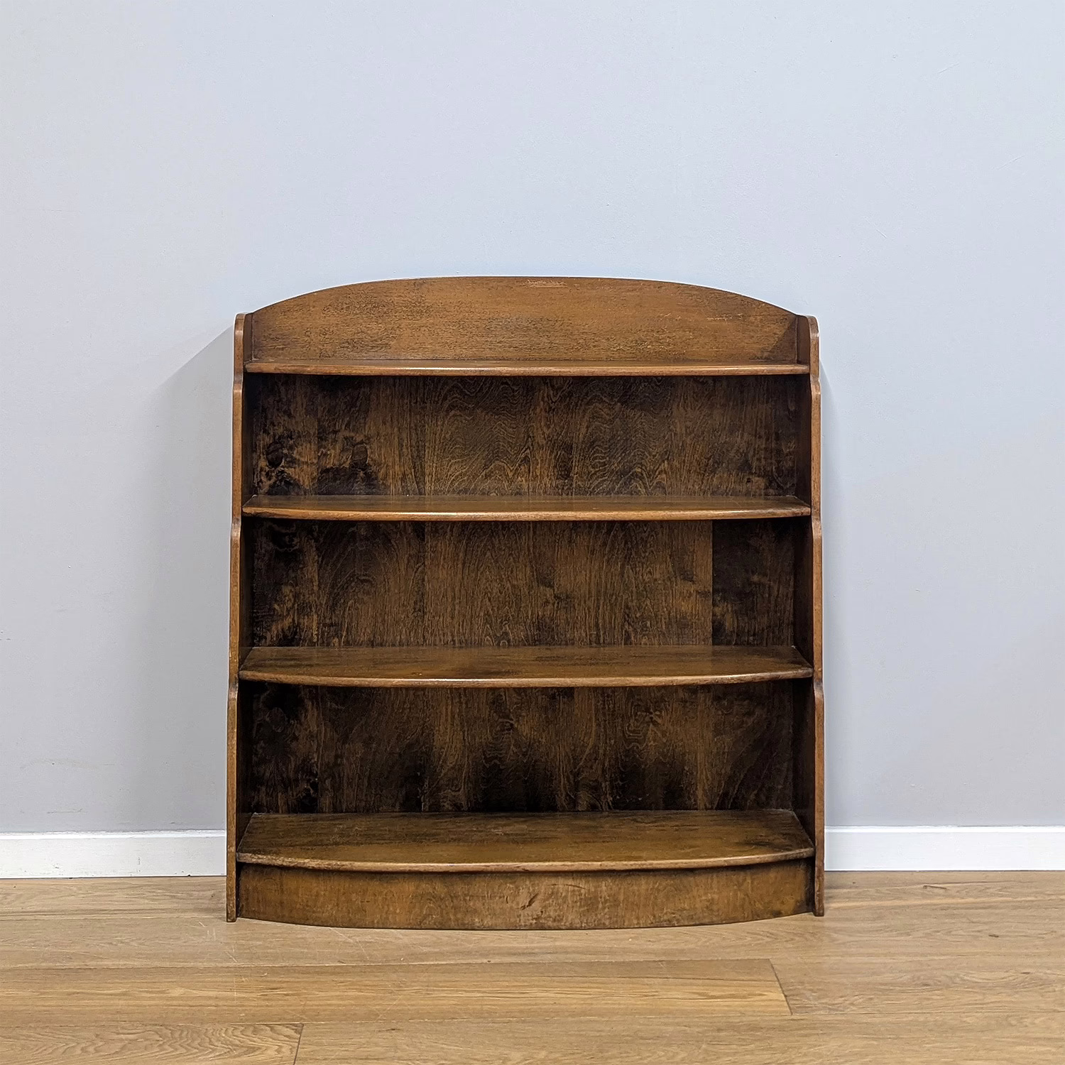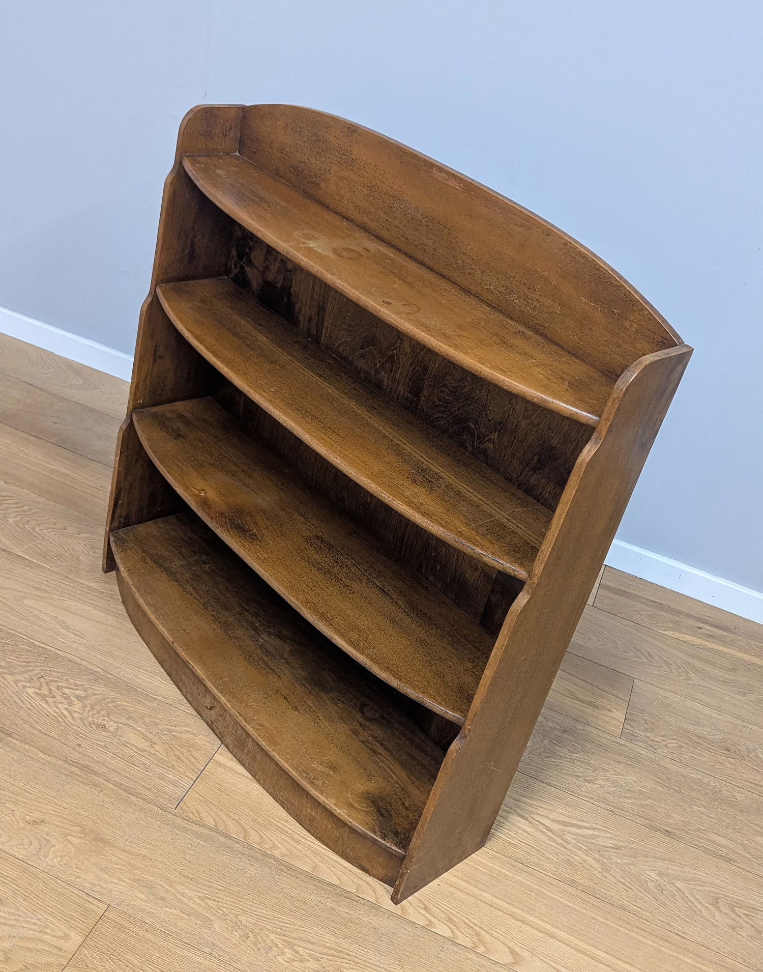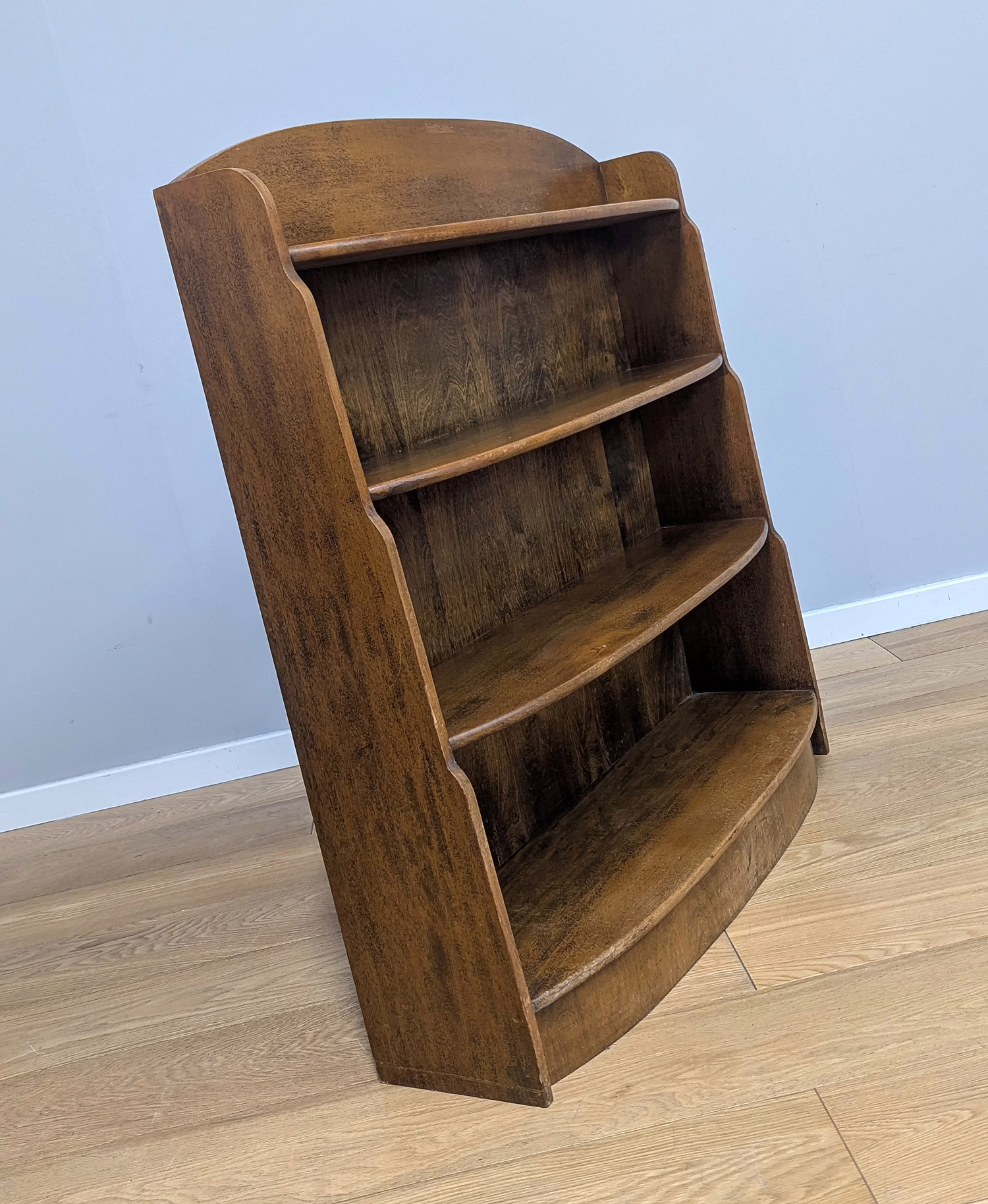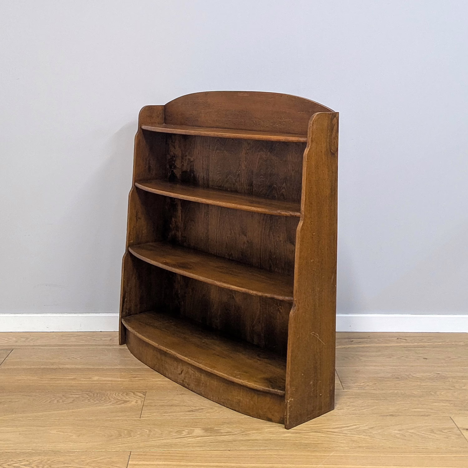 This original, used piece is ‘sold as seen’. It is in good, vintage condition. It has been checked, cleaned and polished with a natural beeswax but otherwise the finish is original and as such it comes with minor marks, rings and knocks which can be seen across our photos. The shelves are graduated (hence ‘waterfall’) both in height and depth, with smallest at the top, largest at the bottom and they are fixed in position. It is solid and stable with no repairs or areas of concern. Do browse through our photos for an accurate sense of its condition – there are signs of use and ageing. There is no maker’s mark. It’s solid and stable and British in origin. Any queries, please don’t hesitate to ask.