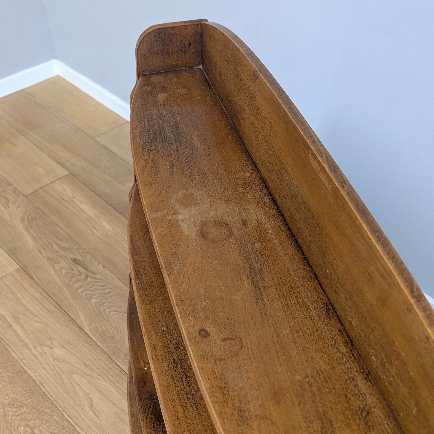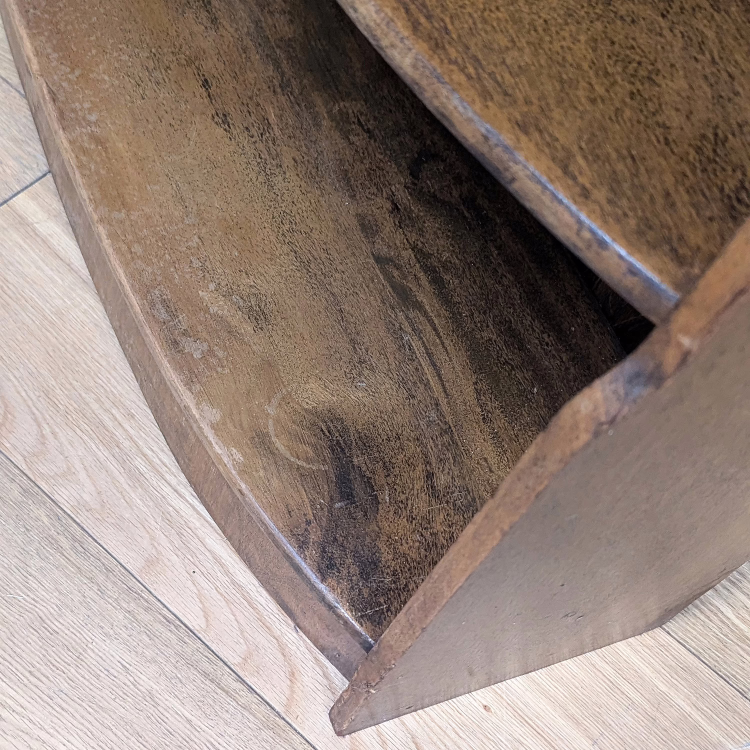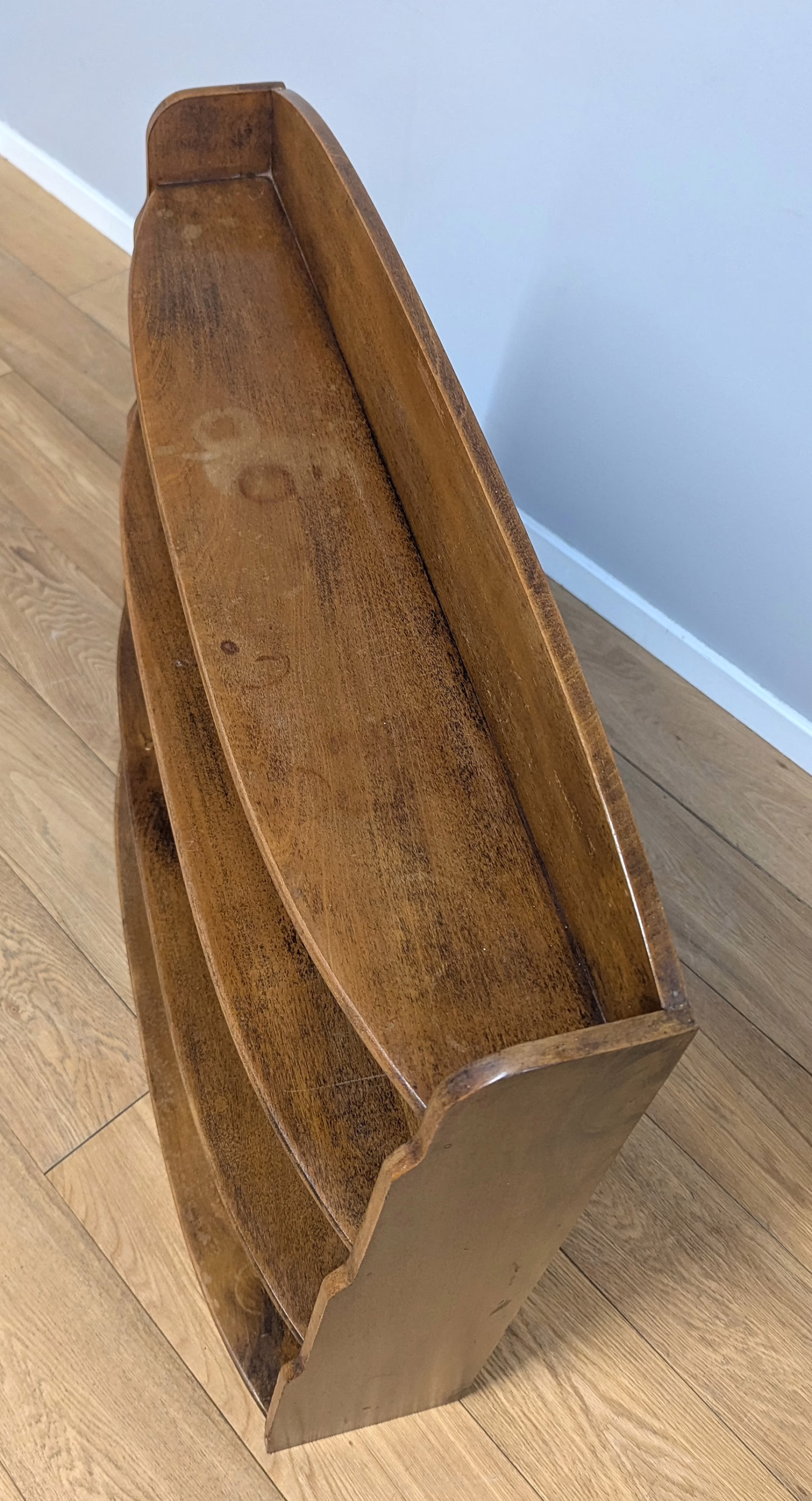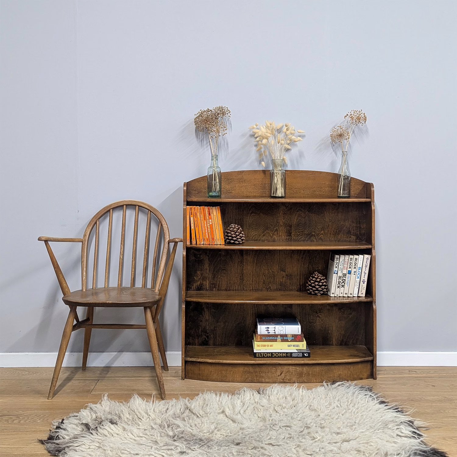 This original, used piece is ‘sold as seen’. It is in good, vintage condition. It has been checked, cleaned and polished with a natural beeswax but otherwise the finish is original and as such it comes with minor marks, rings and knocks which can be seen across our photos. The shelves are graduated (hence ‘waterfall’) both in height and depth, with smallest at the top, largest at the bottom and they are fixed in position. It is solid and stable with no repairs or areas of concern. Do browse through our photos for an accurate sense of its condition – there are signs of use and ageing. There is no maker’s mark. It’s solid and stable and British in origin. Any queries, please don’t hesitate to ask.