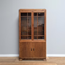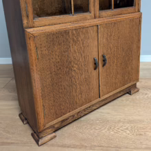 This original, used piece is ‘sold as seen’. It is in very good, vintage condition. It has been checked and cleaned inside and out but otherwise the finish is original and as such it comes with some minor marks and knocks which can be seen across our photos. The three glass doors are in very good order moving with ease on their hinges and there is a working lock and key. Inside there are two adjustable glass shelves with all their original pegs in place. The interior is clean and tidy. The lower cupboard has doors which open and close easily with hinges and closures in good working order. The interior is lightly marked from use as shown. The exterior wood has light marks and knocks here and there in line with its great age but overall it is in very good order. Do browse our photos for an accurate sense of colour and condition. A join in the wood has opened fractionally on the left hand side at the bottom but this is simply down to aging and nothing to worry about – it’s barely noticeable but in the interests of transparency we wanted to flag it. It’s a very well-made, quality piece and is CWS maker’s plate is on the back. It is solid and stable with no repairs or areas of concern.