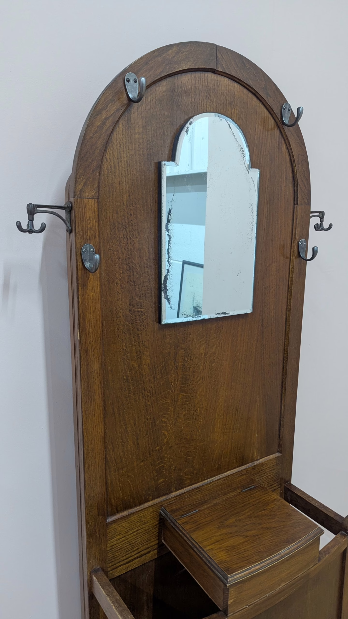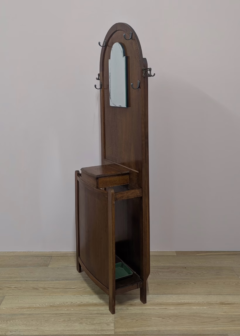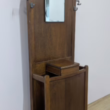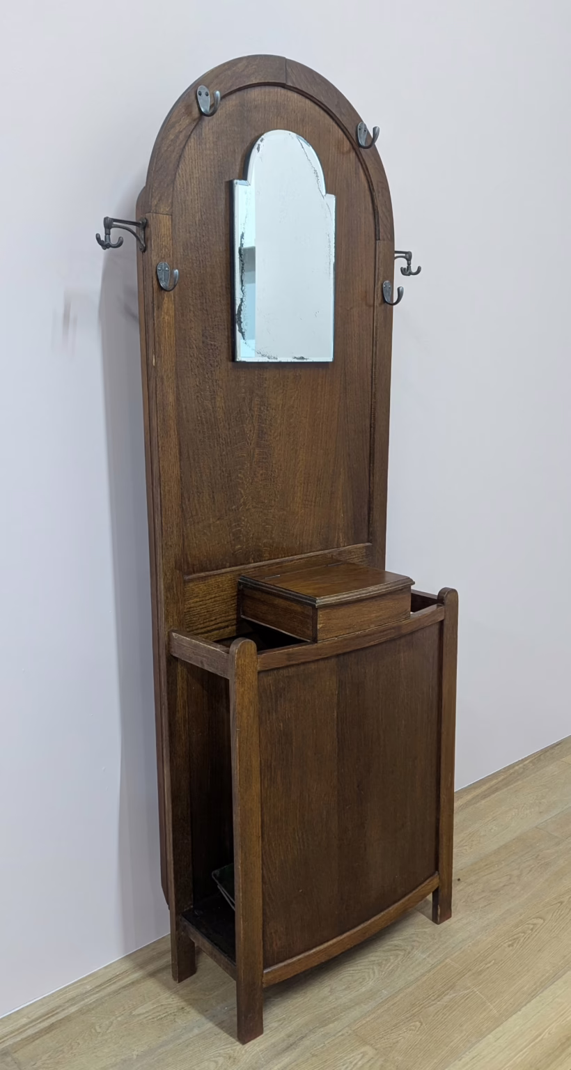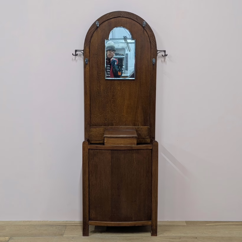 This original, vintage hall stand is ‘sold as seen’. Overall it is in good, used condition. The piece has been cleaned, inside and out, and a natural beeswax polish applied and buffed on the external surfaces, but otherwise the finish is original. The two outer rotating trio hooks are original however, we have replaced the four individual hooks on the main panel as the old ones were broken or missing. The glove box is in very good order inside and out. There is some ageing to the mirror’s surface but it’s still effective. There are two original floating, metal drip trays. These can be taken out if you intend to use this section for hidden storage, rather than for wet brollies. The external surfaces have some light marks and scuffs which overall is minor – do look through our photos for an true sense of its condition. The Atcraft maker’s stamp is inside the glove box and we believe it dates from the early 20th century. Any queries, please get in touch.
