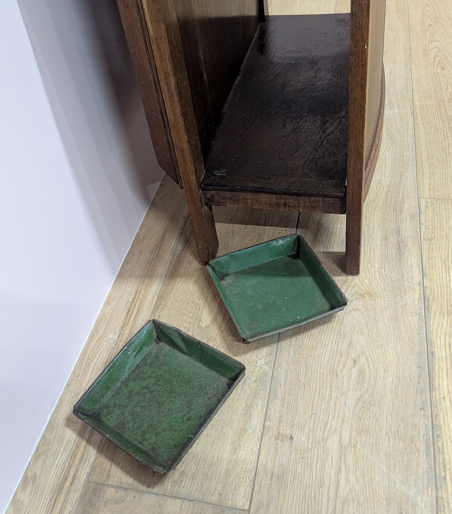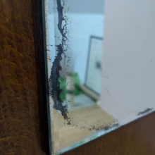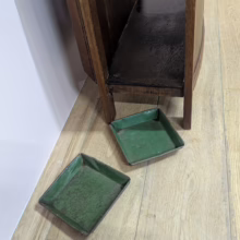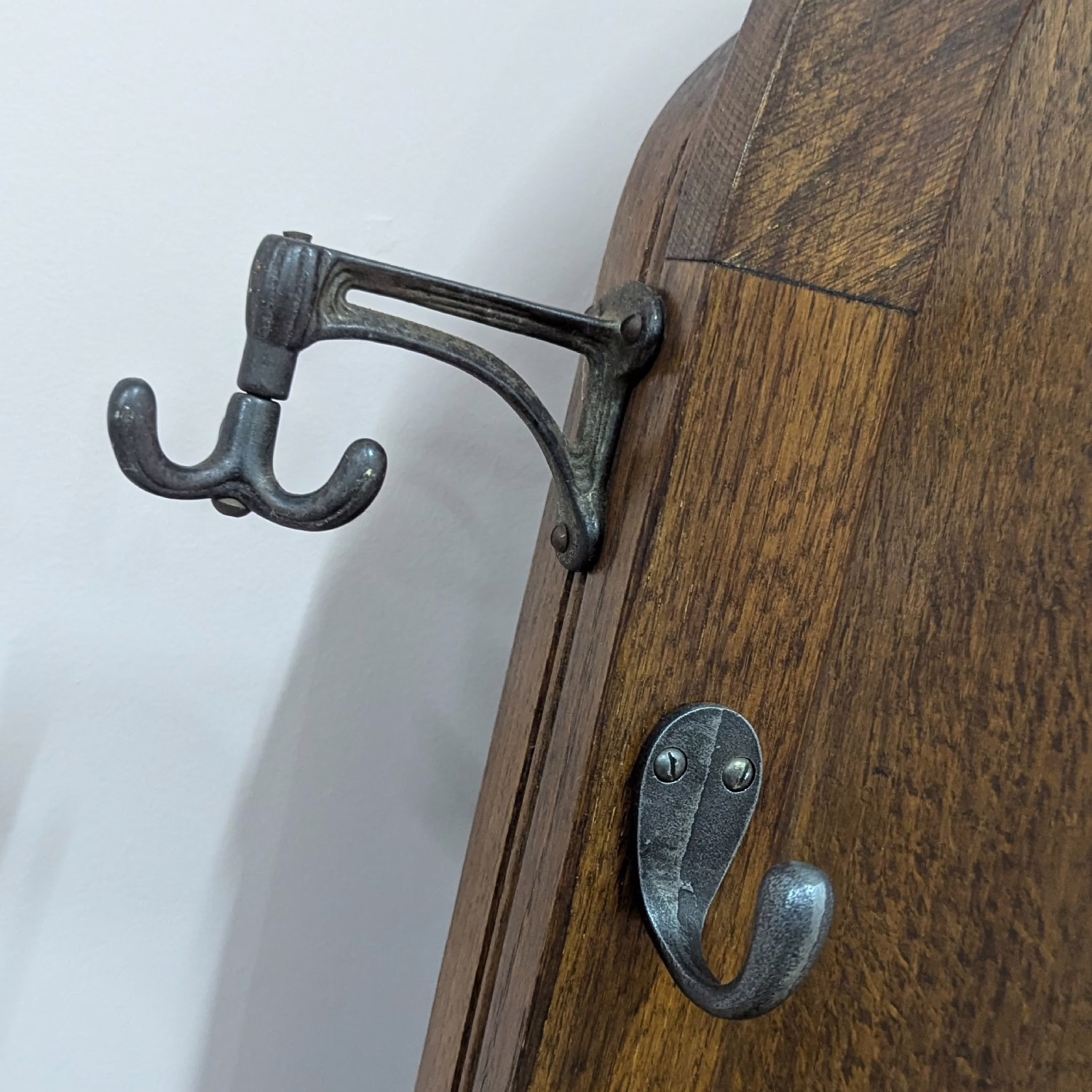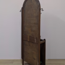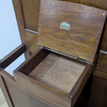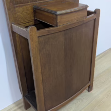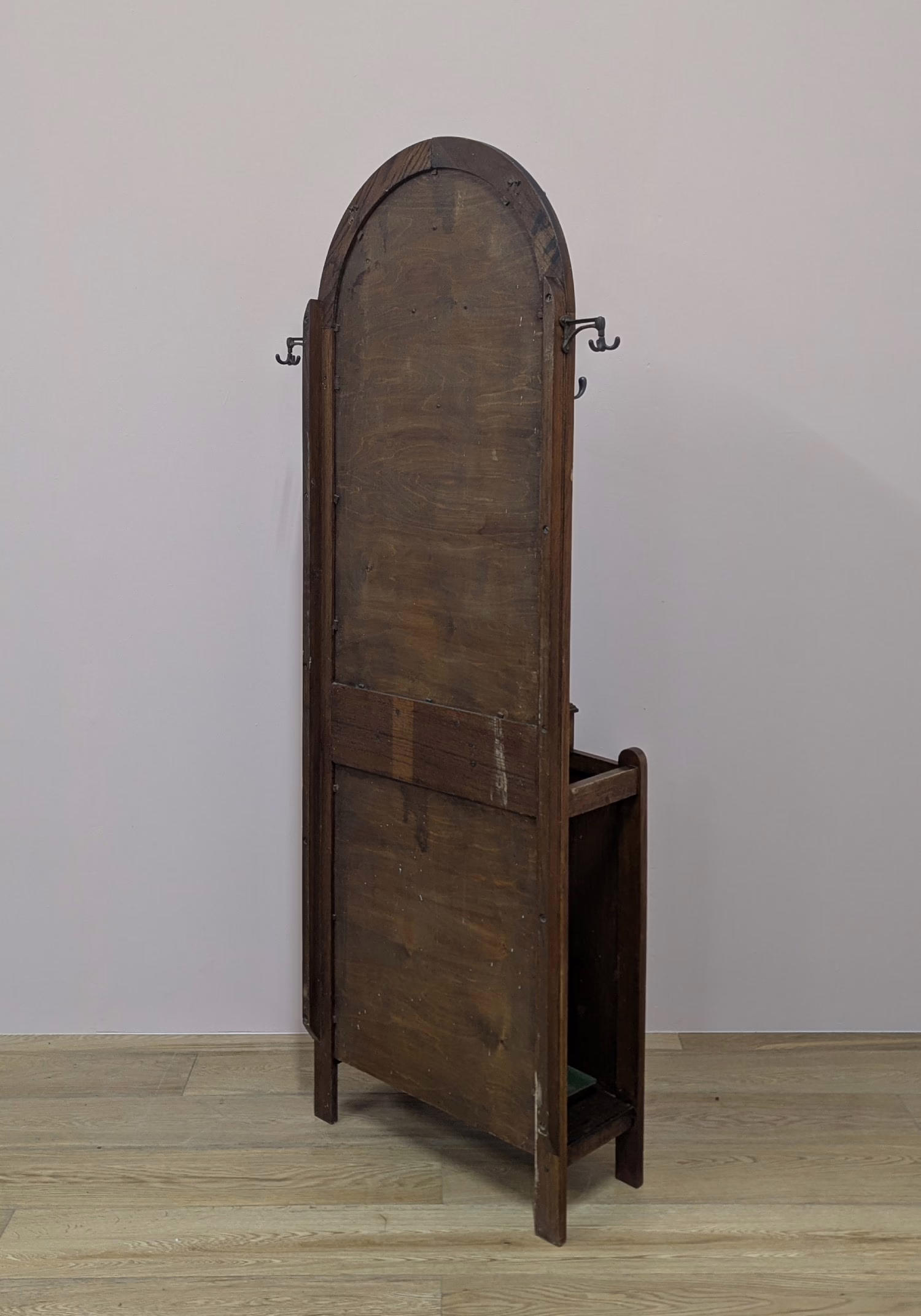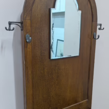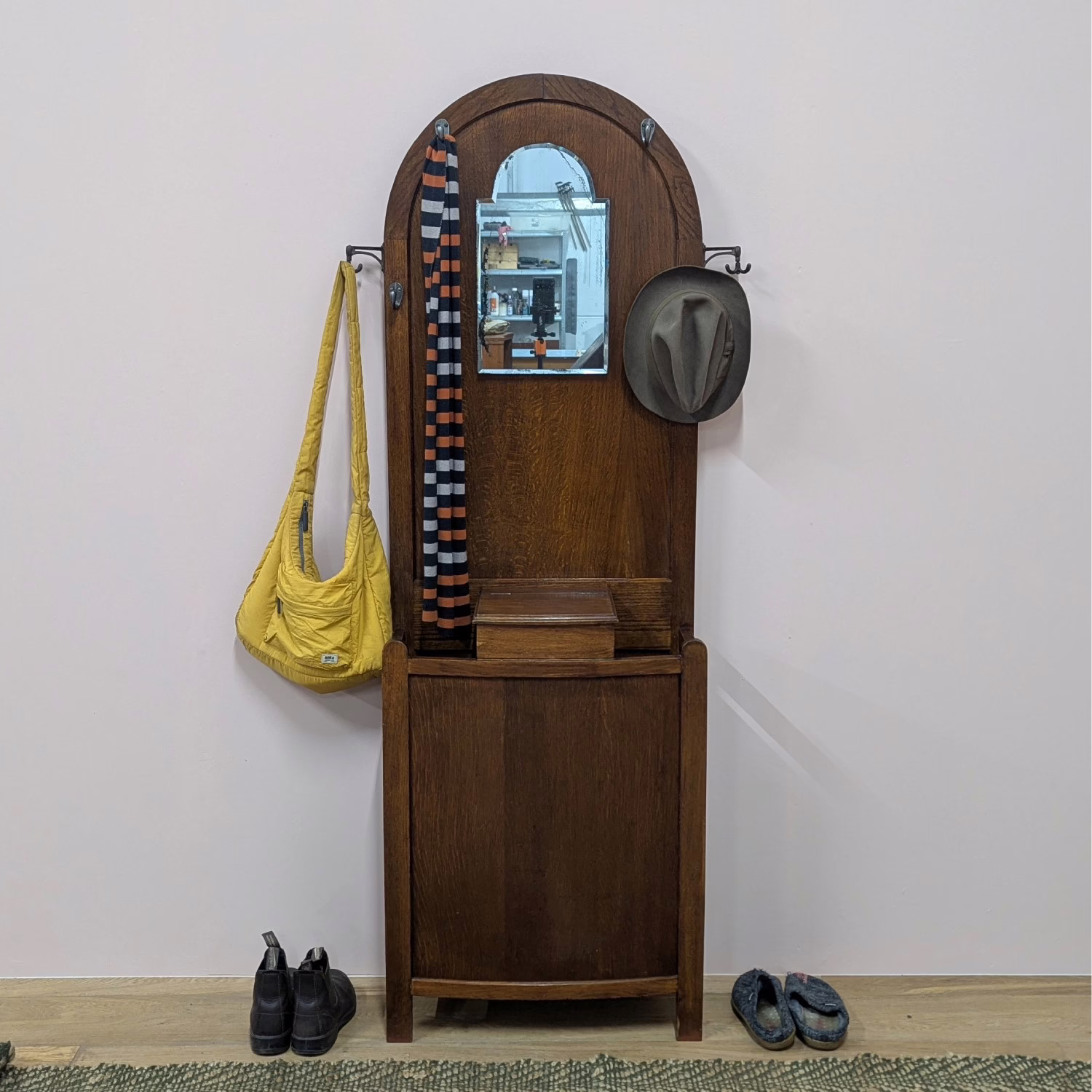 This original, vintage hall stand is ‘sold as seen’. Overall it is in good, used condition. The piece has been cleaned, inside and out, and a natural beeswax polish applied and buffed on the external surfaces, but otherwise the finish is original. The two outer rotating trio hooks are original however, we have replaced the four individual hooks on the main panel as the old ones were broken or missing. The glove box is in very good order inside and out. There is some ageing to the mirror’s surface but it’s still effective. There are two original floating, metal drip trays. These can be taken out if you intend to use this section for hidden storage, rather than for wet brollies. The external surfaces have some light marks and scuffs which overall is minor – do look through our photos for an true sense of its condition. The Atcraft maker’s stamp is inside the glove box and we believe it dates from the early 20th century. Any queries, please get in touch.