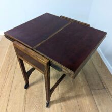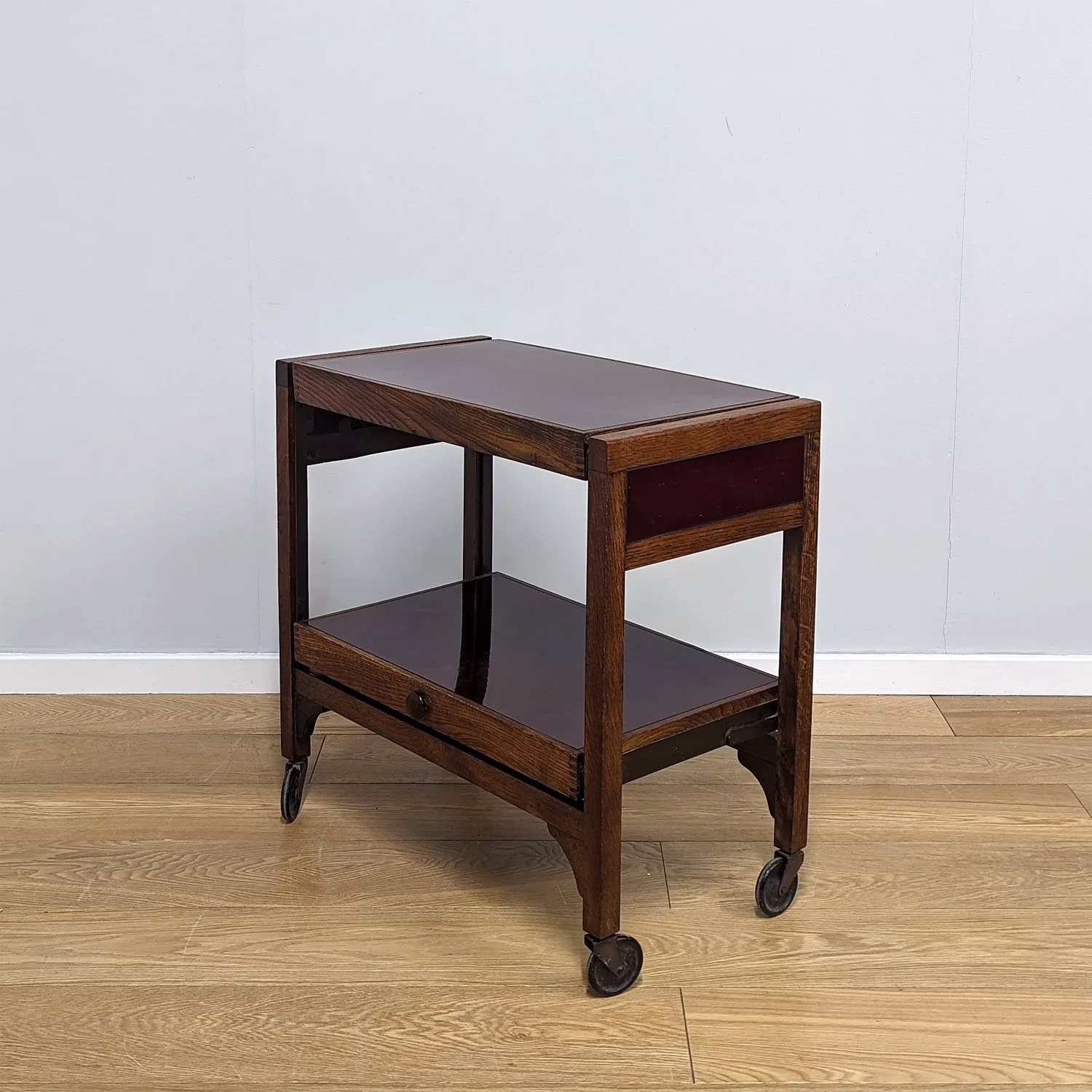 This is an original, vintage piece that is ‘sold as seen’. It is in good, used condition. We have cleaned the trolley and applied a natural beeswax polish to the wood but otherwise the finish is original. The table converts from trolley to table by pulling out the bottom knob and then lower shelf pulls up as the upper shelf moves back to create two, flat table leaves and the table top. The knob is pushed back in to hold the table leaves in position. To return to a trolley, the knob is pulled out and the lower and upper shelves gently rotates back into their former positions. Again, the knob is pushed in to stop any movement. It’s rather clever and all mechanisms are in very good working order, flowing with ease. The two table tops and sides are finished in deep red, speckled Formica-style panels which can be readily wiped clean. There is a little discolouration from aging to this finish but overall they are in very good order. The solid oak frame carries some wear and tear but overall this is minor and superficial. Just knocks and scuffs here and there. The castors are original too and roll with ease.