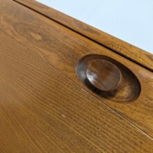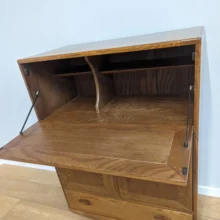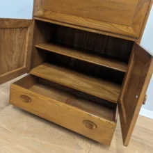This original, used piece is ‘sold as seen’. It’s in very good, vintage condition. We have cleaned the cabinet, applying a natural beeswax polish to the exterior surfaces but otherwise left the original finish alone as it’s in such great order. It features visible dovetail joints with the doors and fall fitted with full length hinges. The top cupboard interior is sectioned and is in clean, tidy order inside. The lower two-door cupboard also has a single adjustable shelf. There is a full width drawer at the bottom which slides with ease and it sits on the original shepherd castors to give good mobility. All interior wood is in very good, clean order, with just light signs of use. Likewise, the exterior wood is in good order too, with only very minor marks here and there in line with its age and purpose. We’ve shown a small dent near the top handle but it’s barely noticeable. Do browse our photos for a good sense of its great order but if you’ve queries or would like to view this piece, please get in touch.