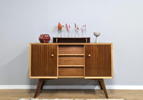 A rarity that dates from the late 1950s / early 1960s, this early G Plan chest of drawers / dressing chest was designed by E Gomme for a very short time, and you can see key features that were later developed further into other ranges, like Librenza and Tola. The mirror shape is reminiscent of the Quadrille range too. We love the dual function of this practical bedroom piece – a generous, substantial chest of drawers combined with a dressing table with a large mirror and at a height that can be sat at. The brass plate handles and feet caps give it elegance, as do the curves of the base, and although there are some age-related knocks and scuffs here and there, it’s beautifully constructed and thoughtfully designed with a high sheen, lacquered finish. A rare treat that deserves to be used and cherished for many more years to come.